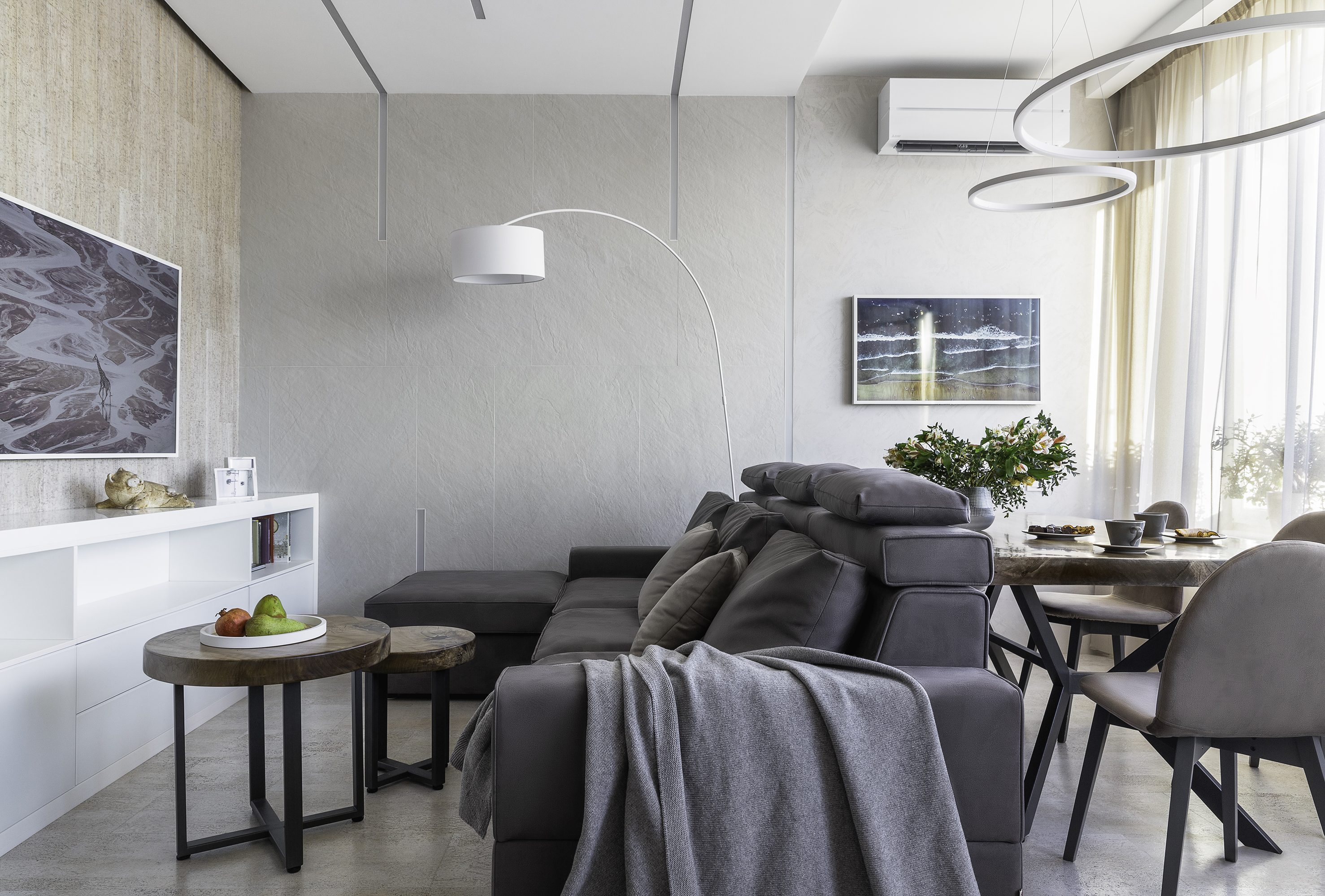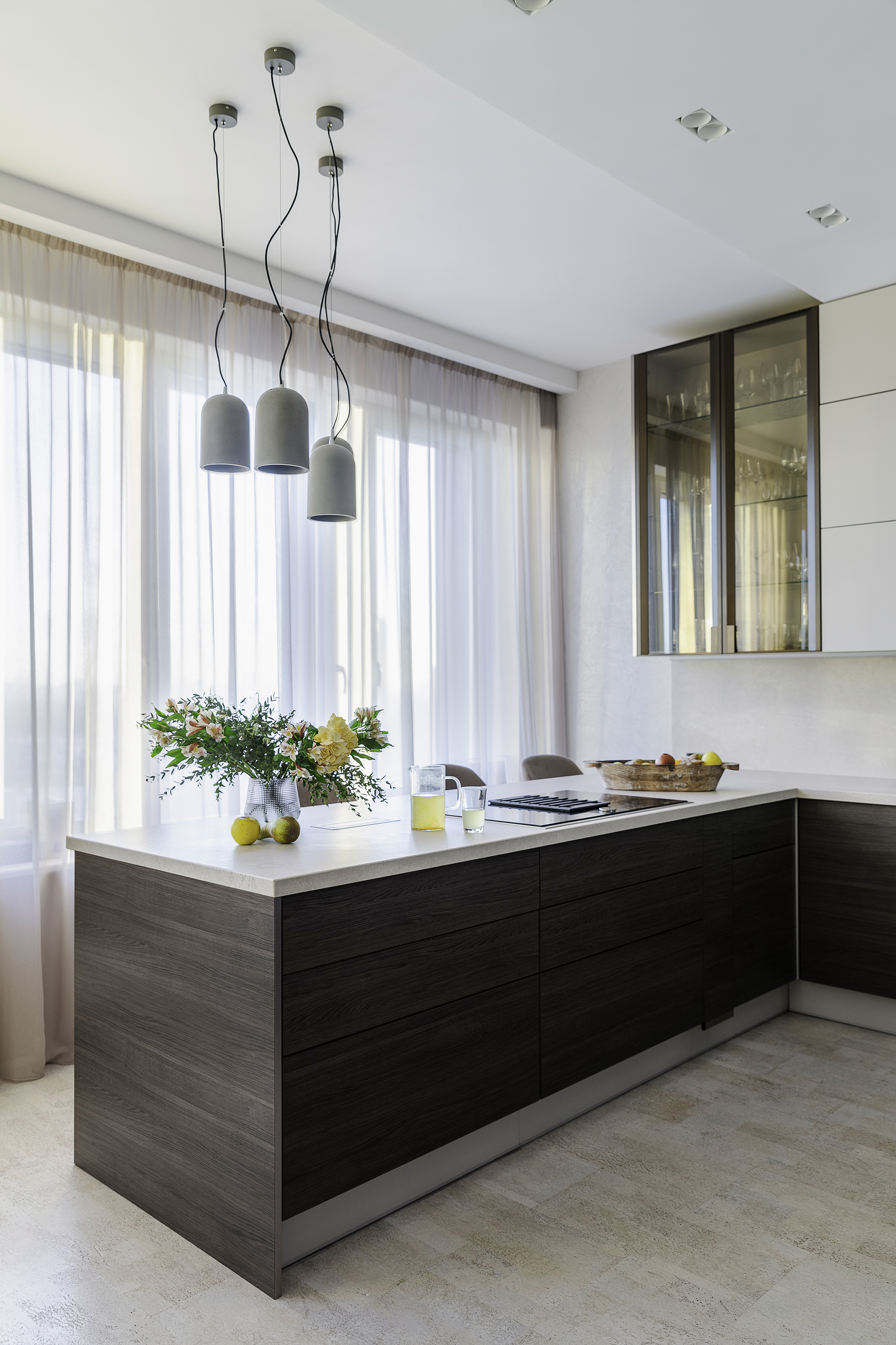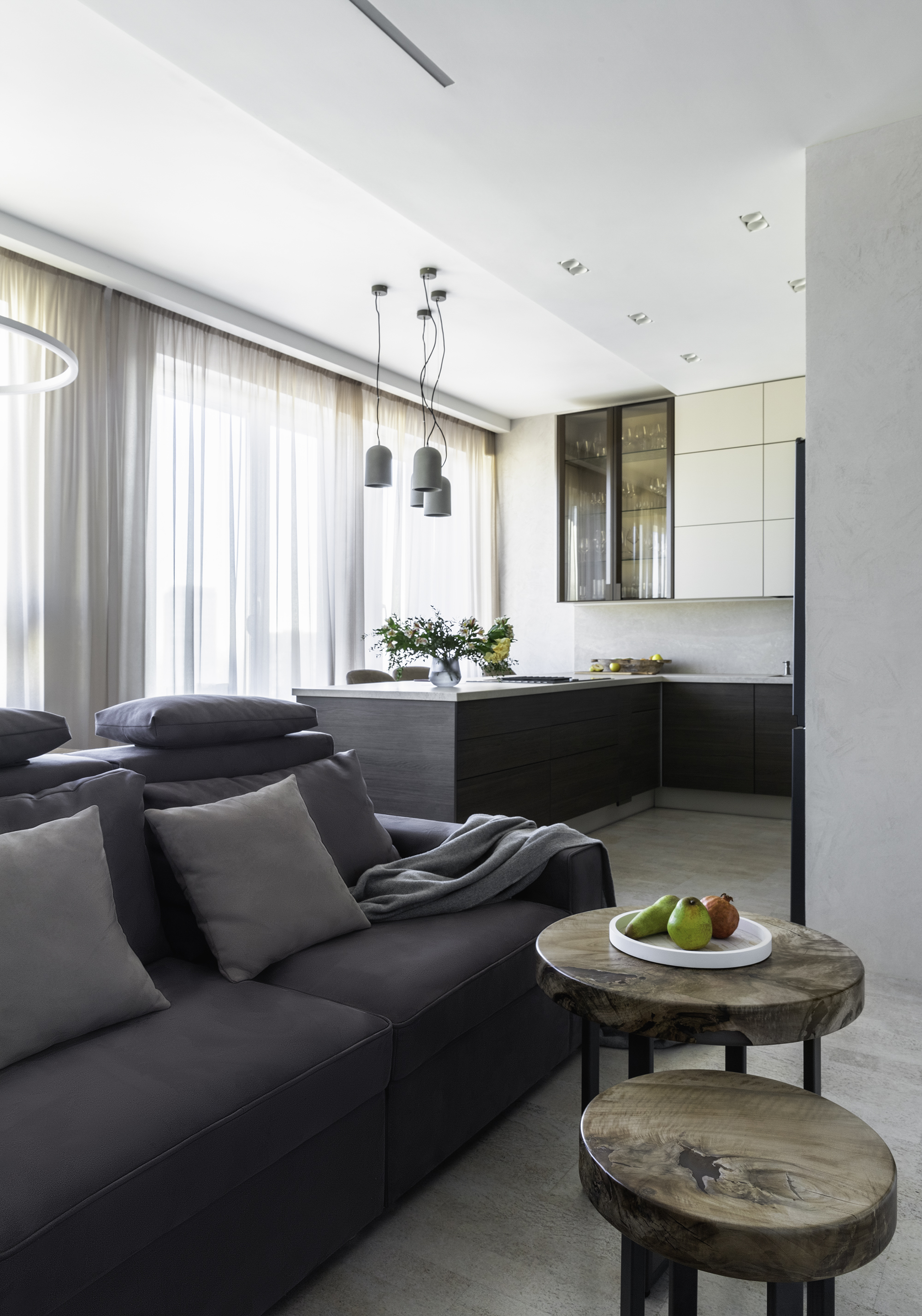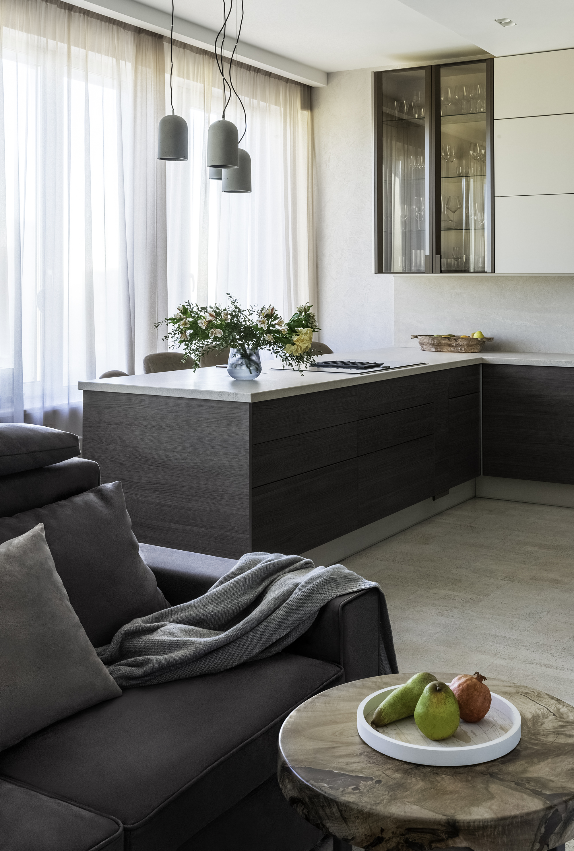 Уют создают разные световые сценарии: точечный свет, подсветные светильники и много подсветок (карнизы штор, цоколь кухни, подсвеченные стеклянные полки кухни). Еще один интересный привлекающий внимание световой элемент - светильники из бетона над баром