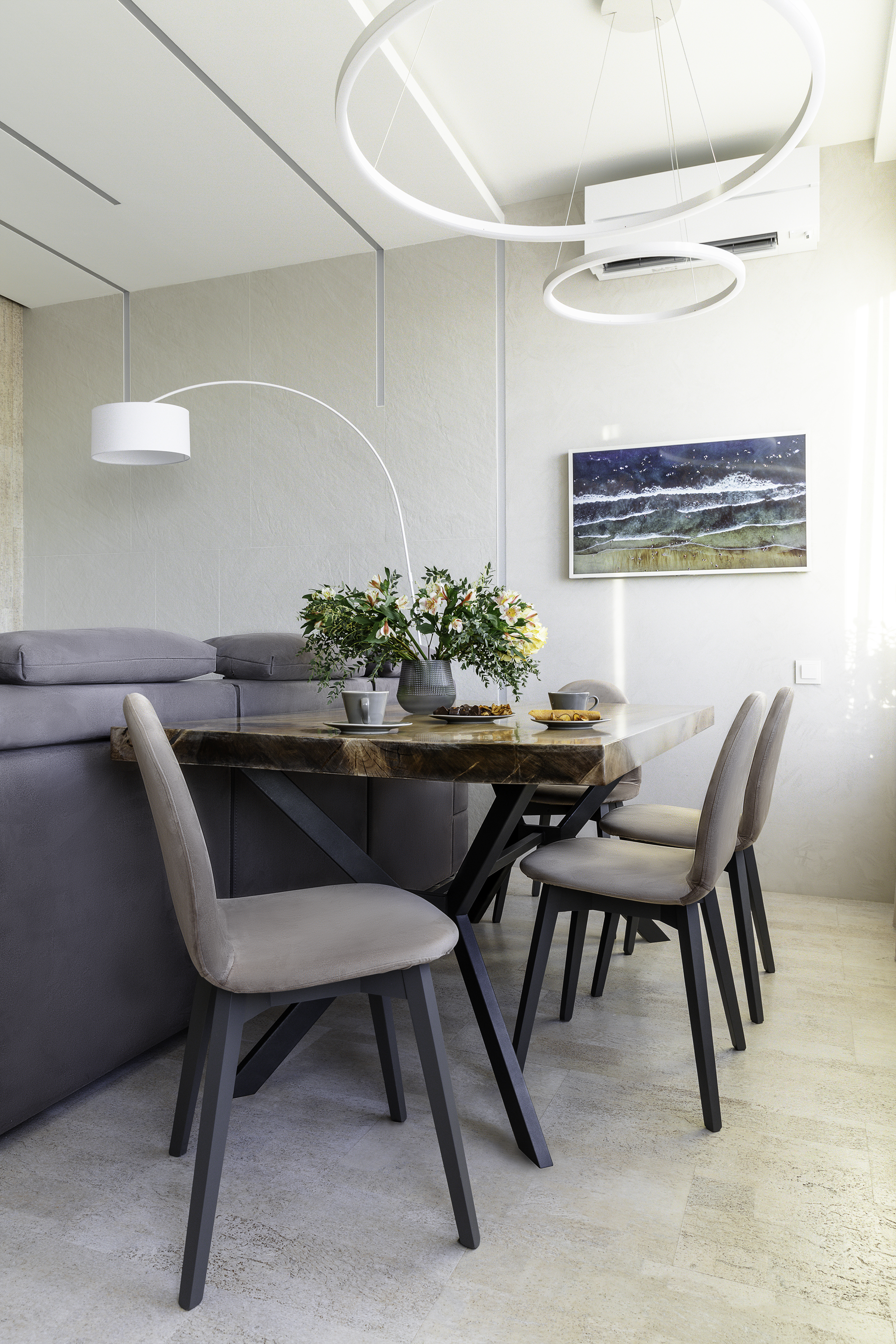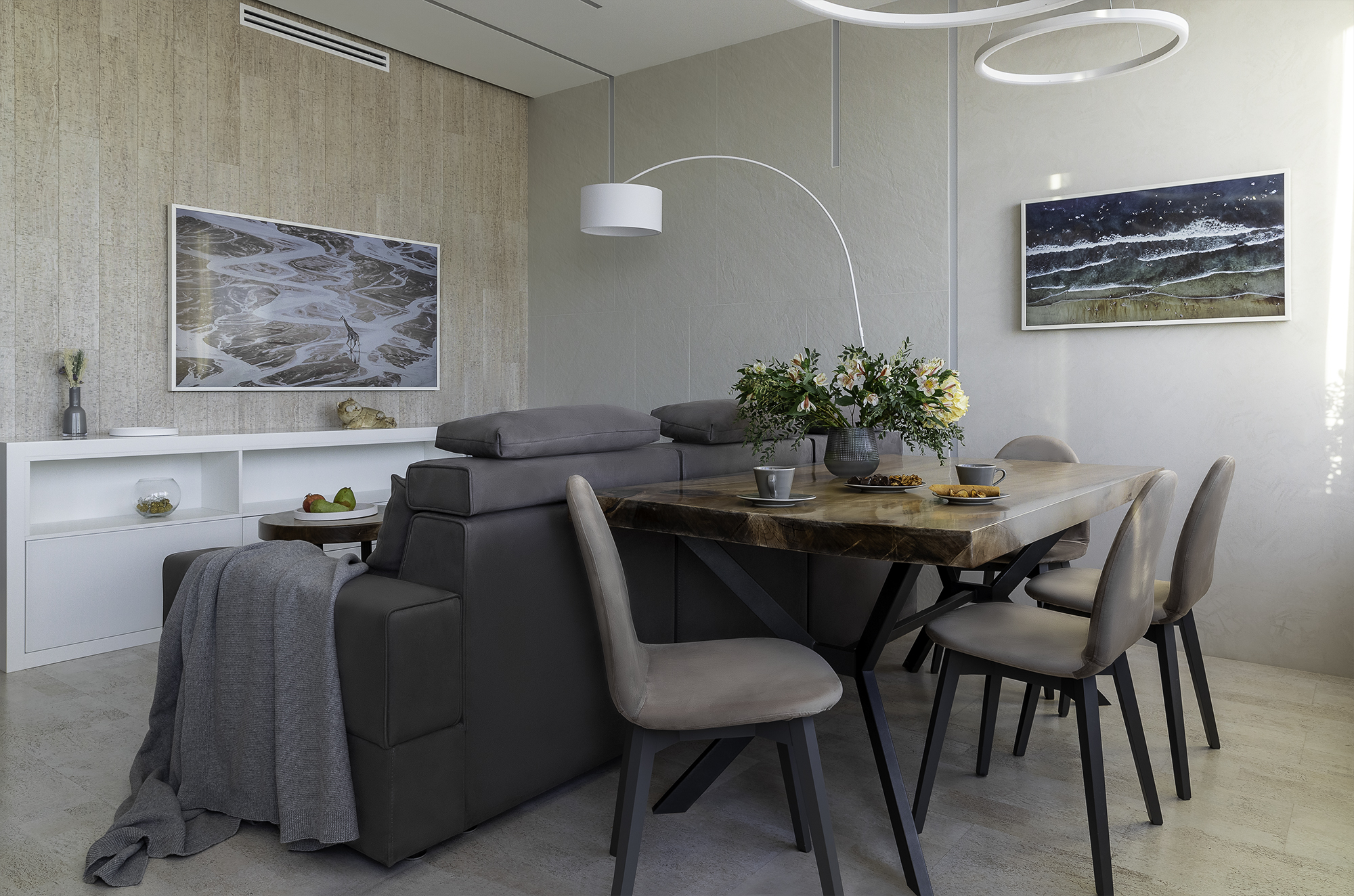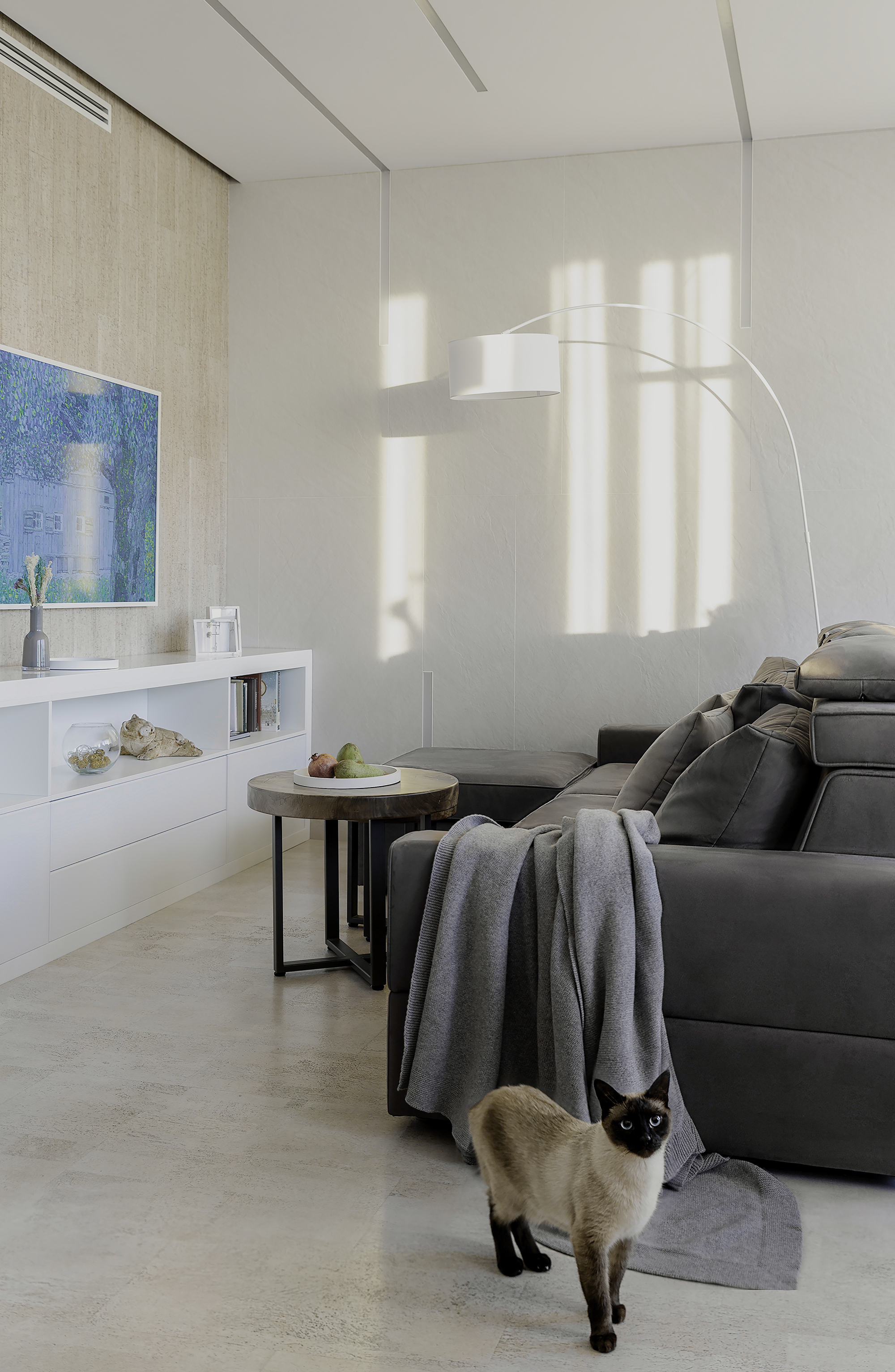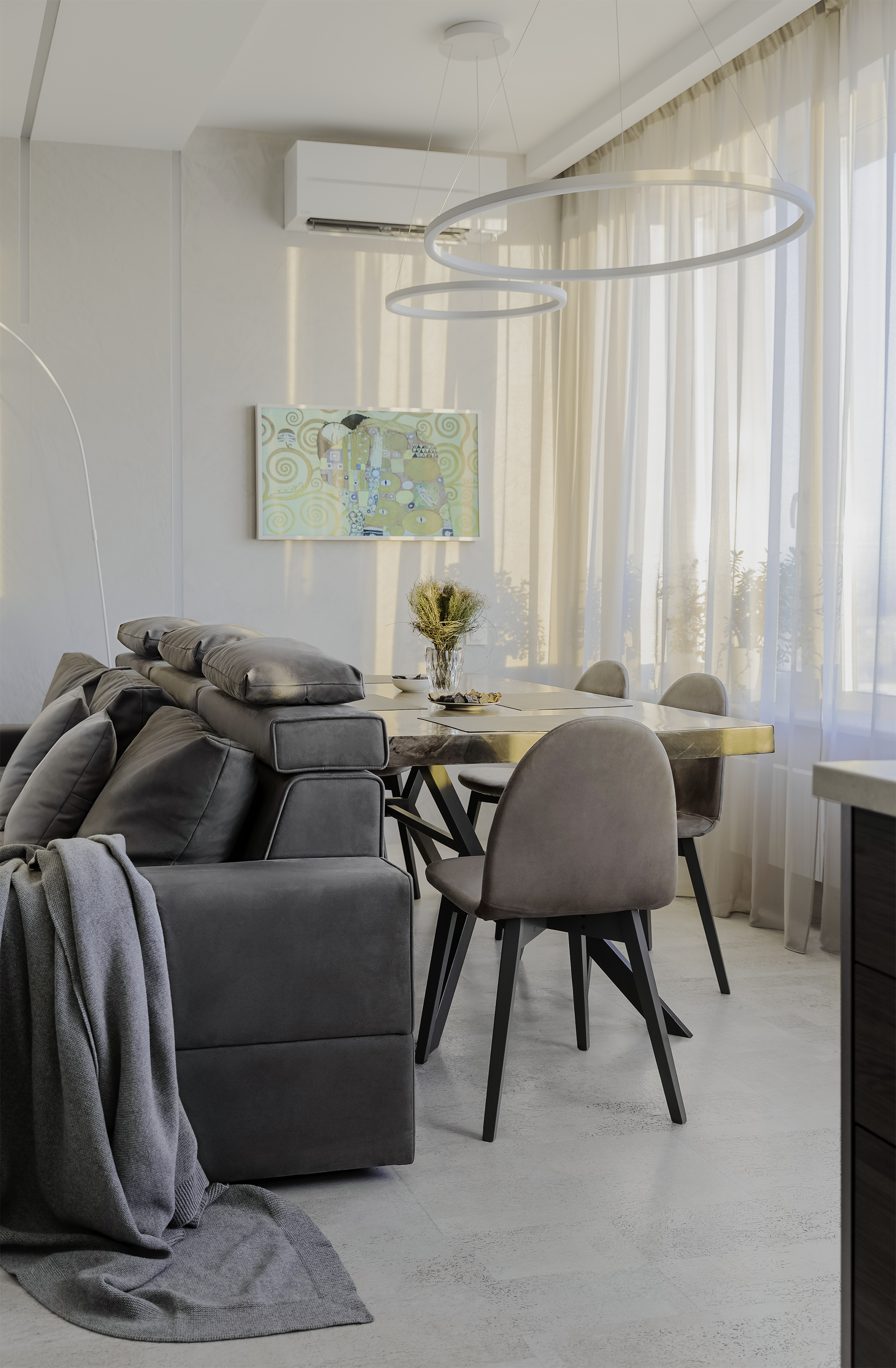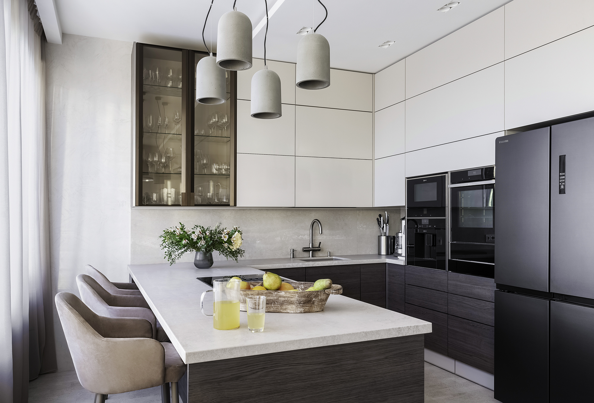 Уют создают разные световые сценарии: точечный свет, подсветные светильники и много подсветок (карнизы штор, цоколь кухни, подсвеченные стеклянные полки кухни). Еще один интересный привлекающий внимание световой элемент - светильники из бетона над баром