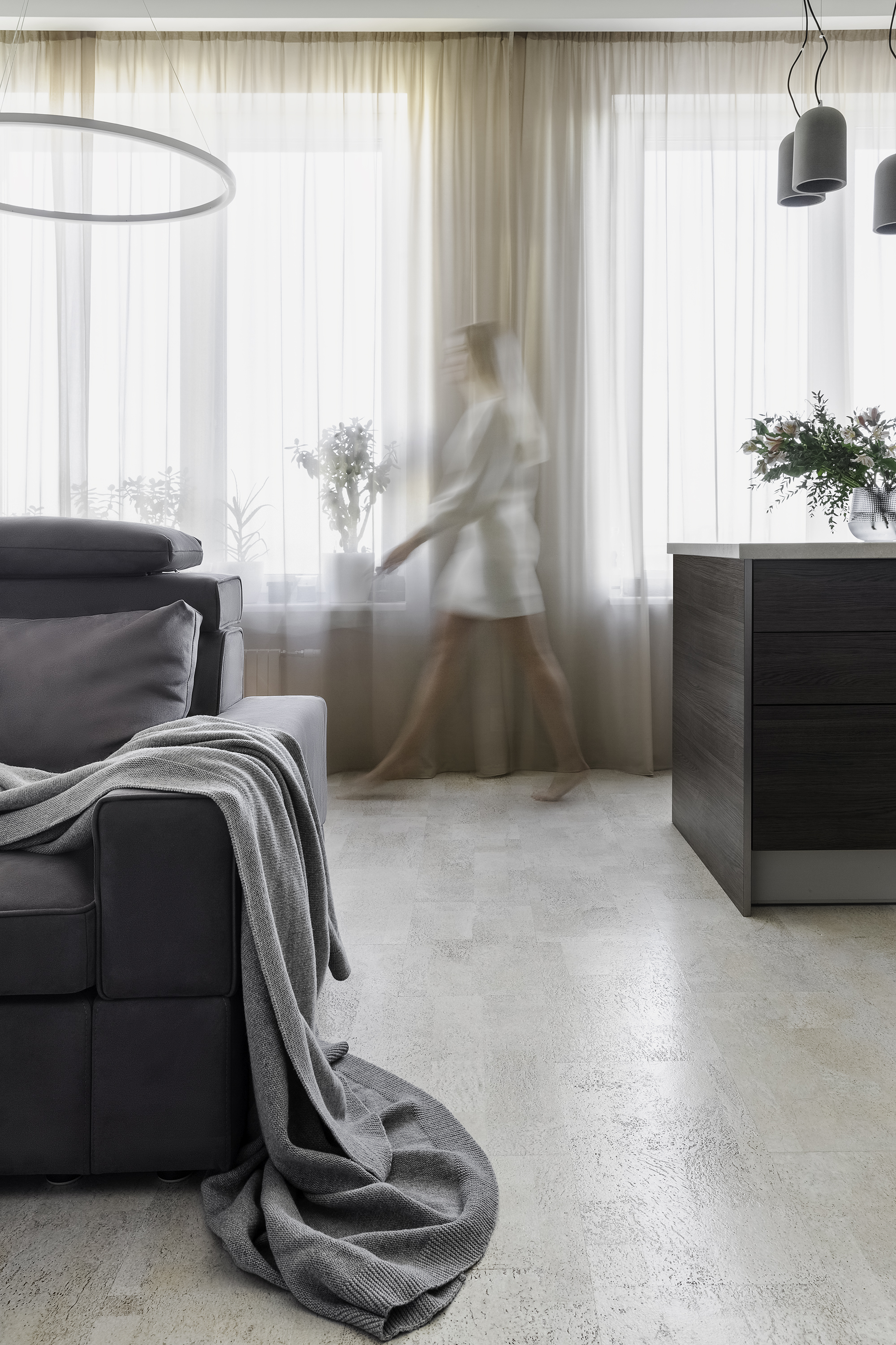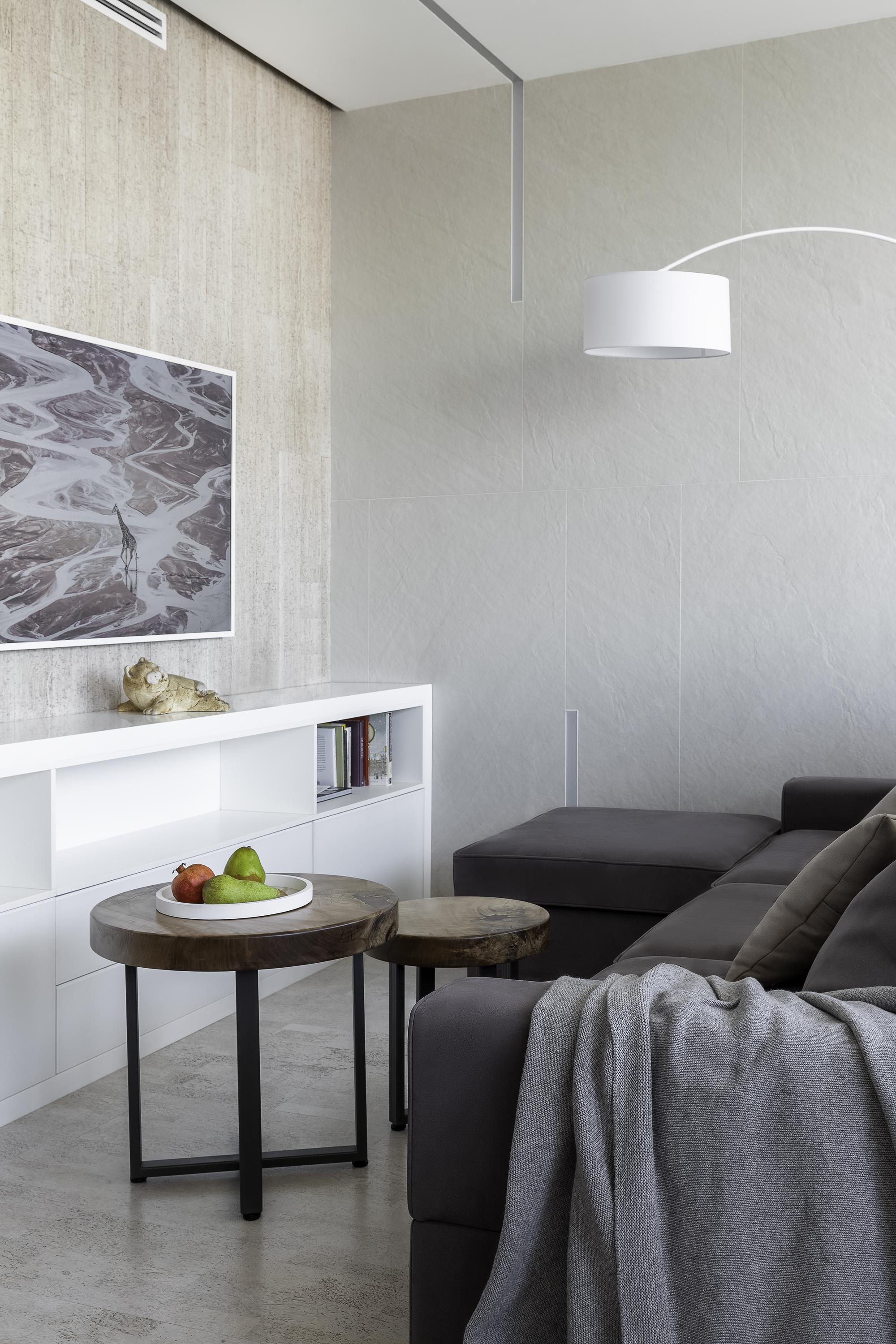 Клиенты Анна и Юрий пришли с запросом современного минималистичного интерьера с природными элементами - пробка, дерево, камень преобладают в интерьере
