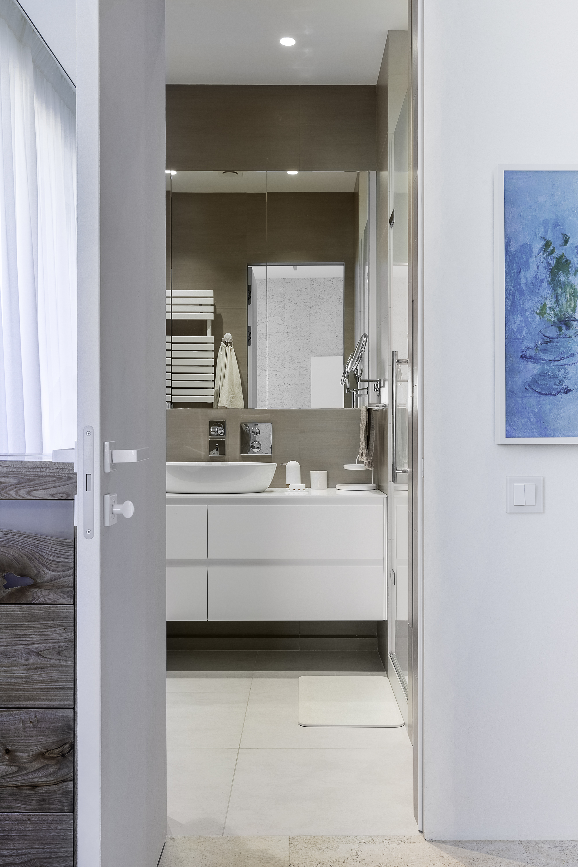 Напротив кровати расположился тот же современный телек картина и два симметричных входа - су и гардеробная.