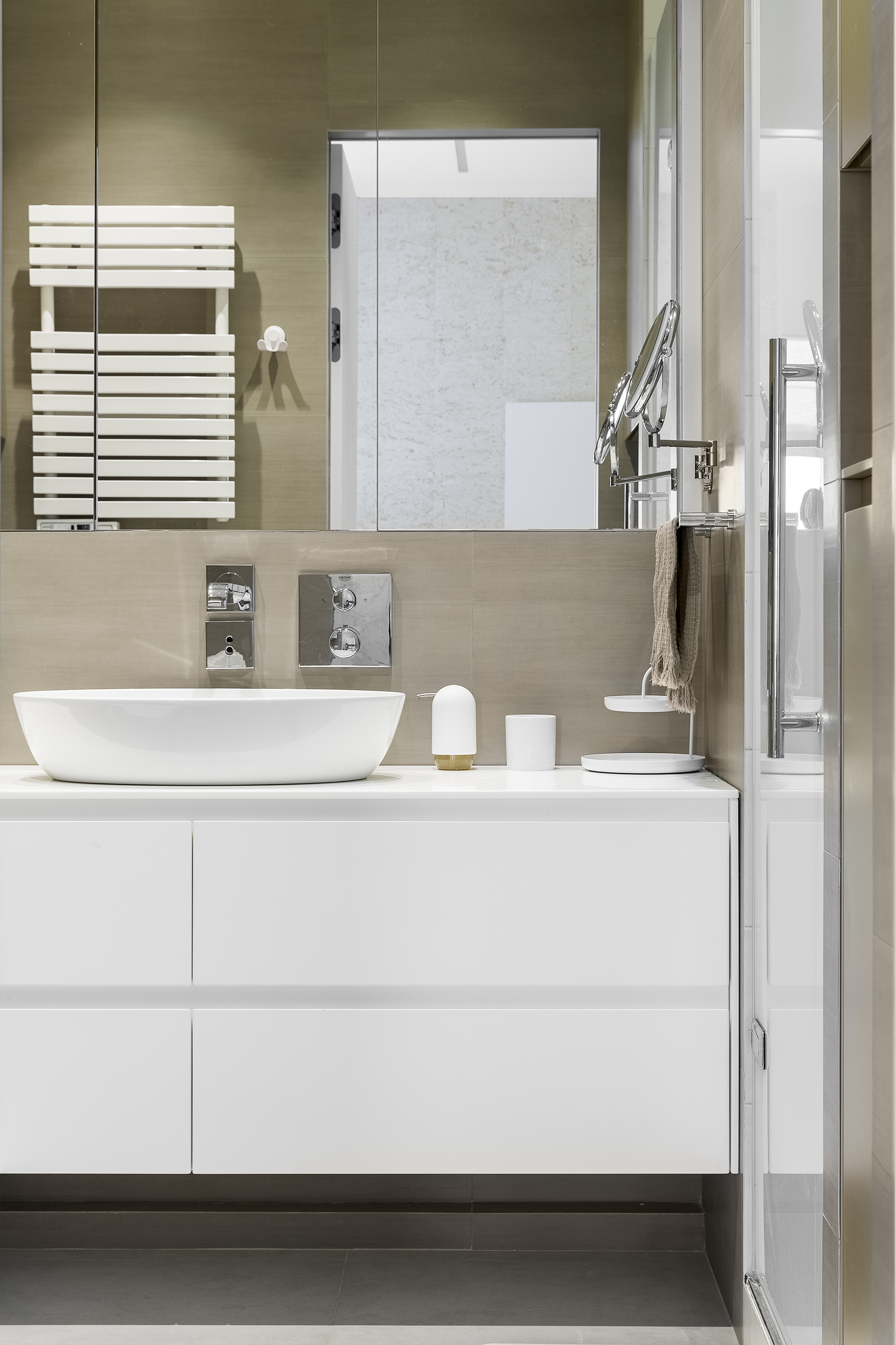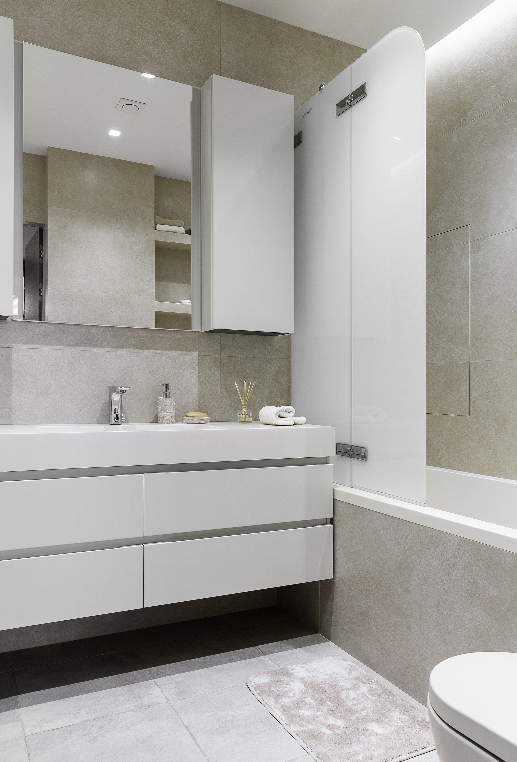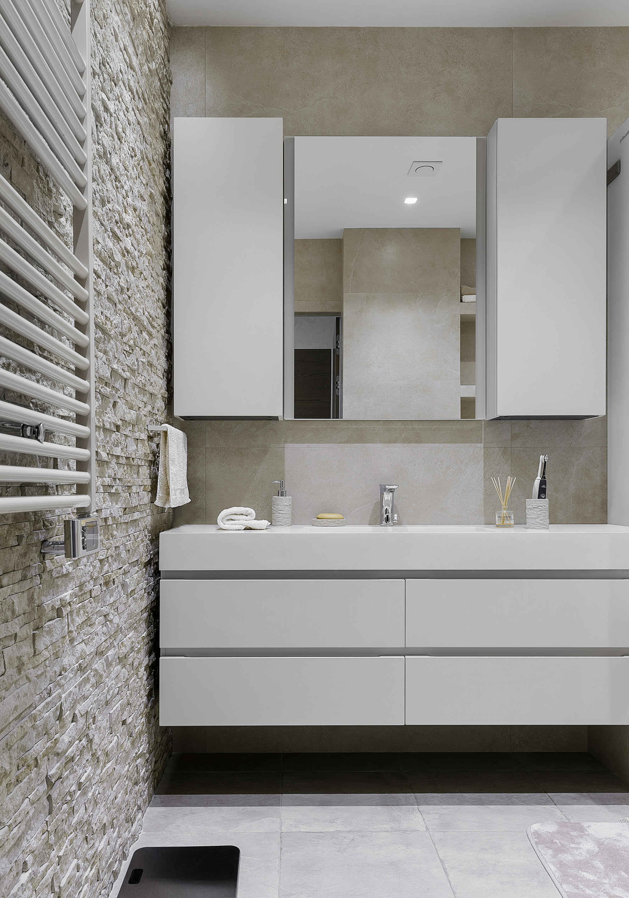 Мебель мастер блока также выполнена на заказ из натурального дерева с вставками из матовой смолы