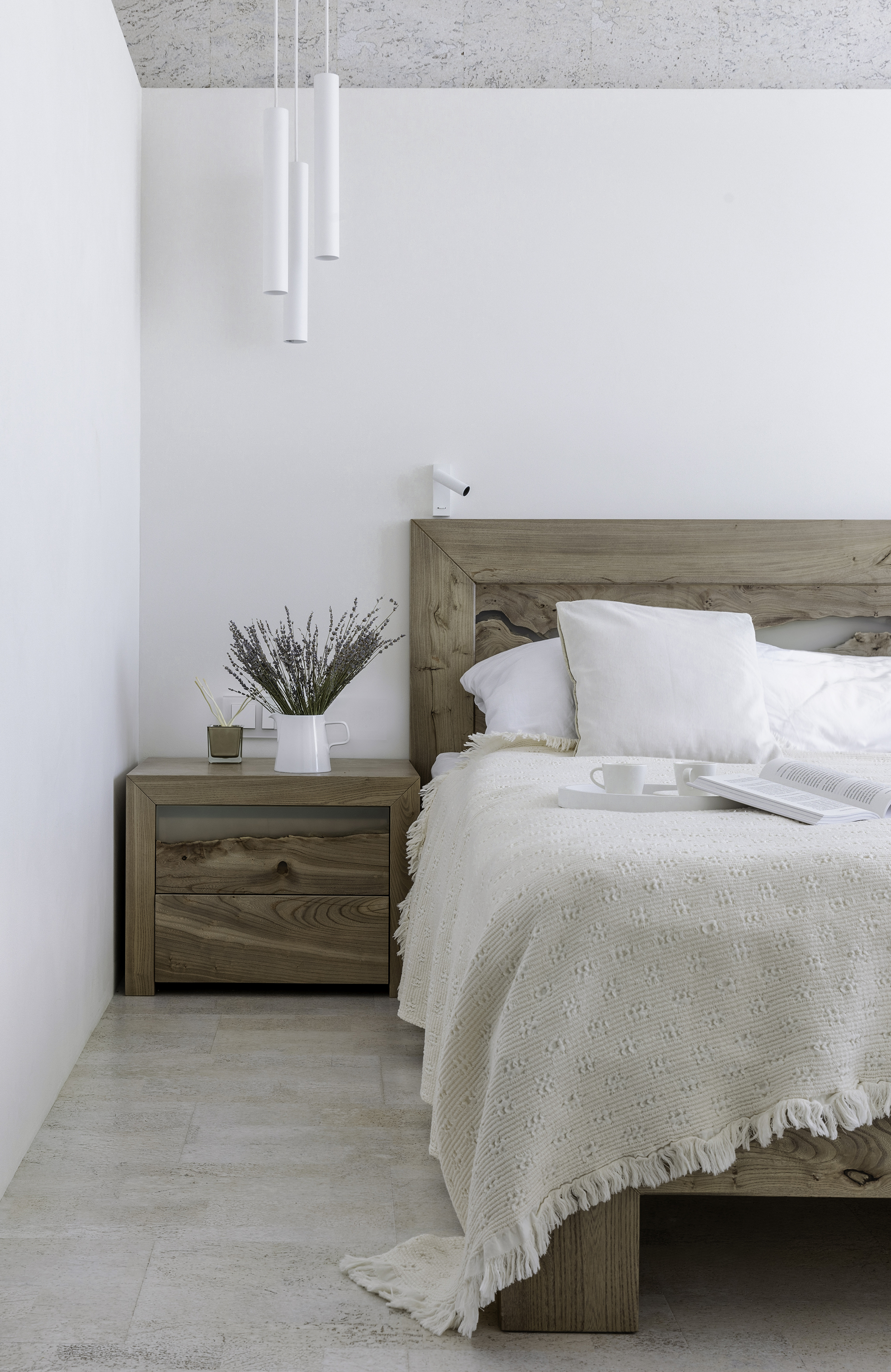 Кровать выделена белой пробкой и объемной конструкцией из гипсокартона с подсветкой по периметру. Основная отделка стен - матовая краска.