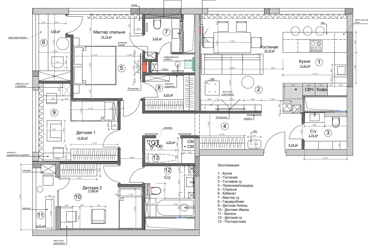 По планировке был запрос на большую вместительную кухню совмещенную с гостиной, отдельный мастер блок (спальня, гардероб и су), также удалось выделить в мастер блоке кабинет.