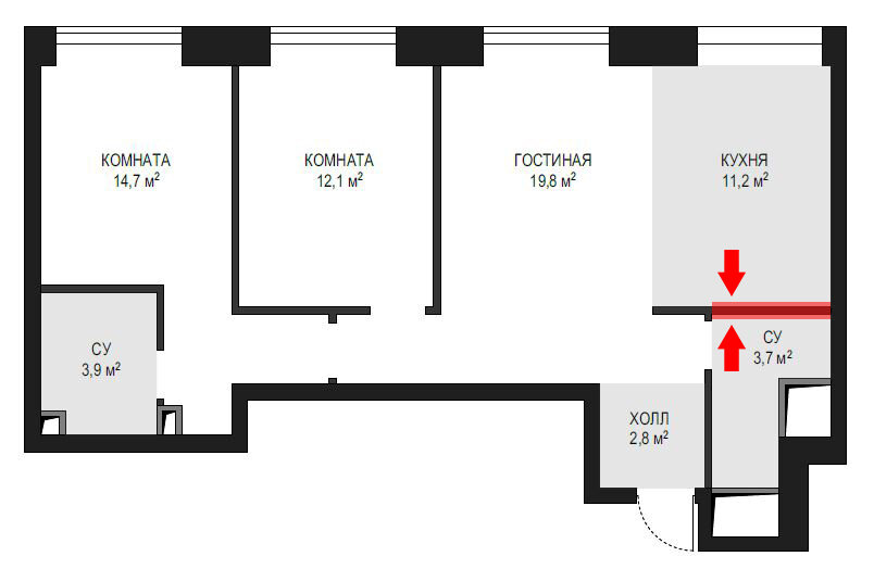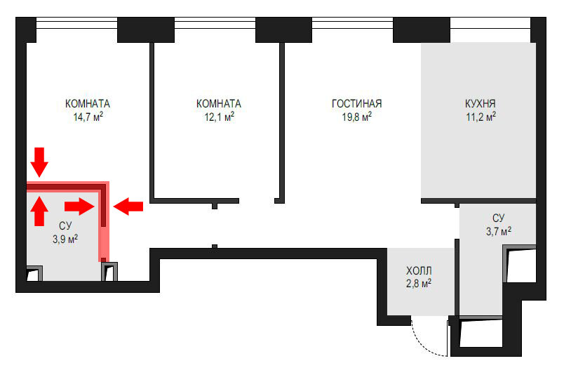 1. Нельзя увеличивать санузел за счёт кухни (кроме первого этажа, под которым располагается нежилое помещение)