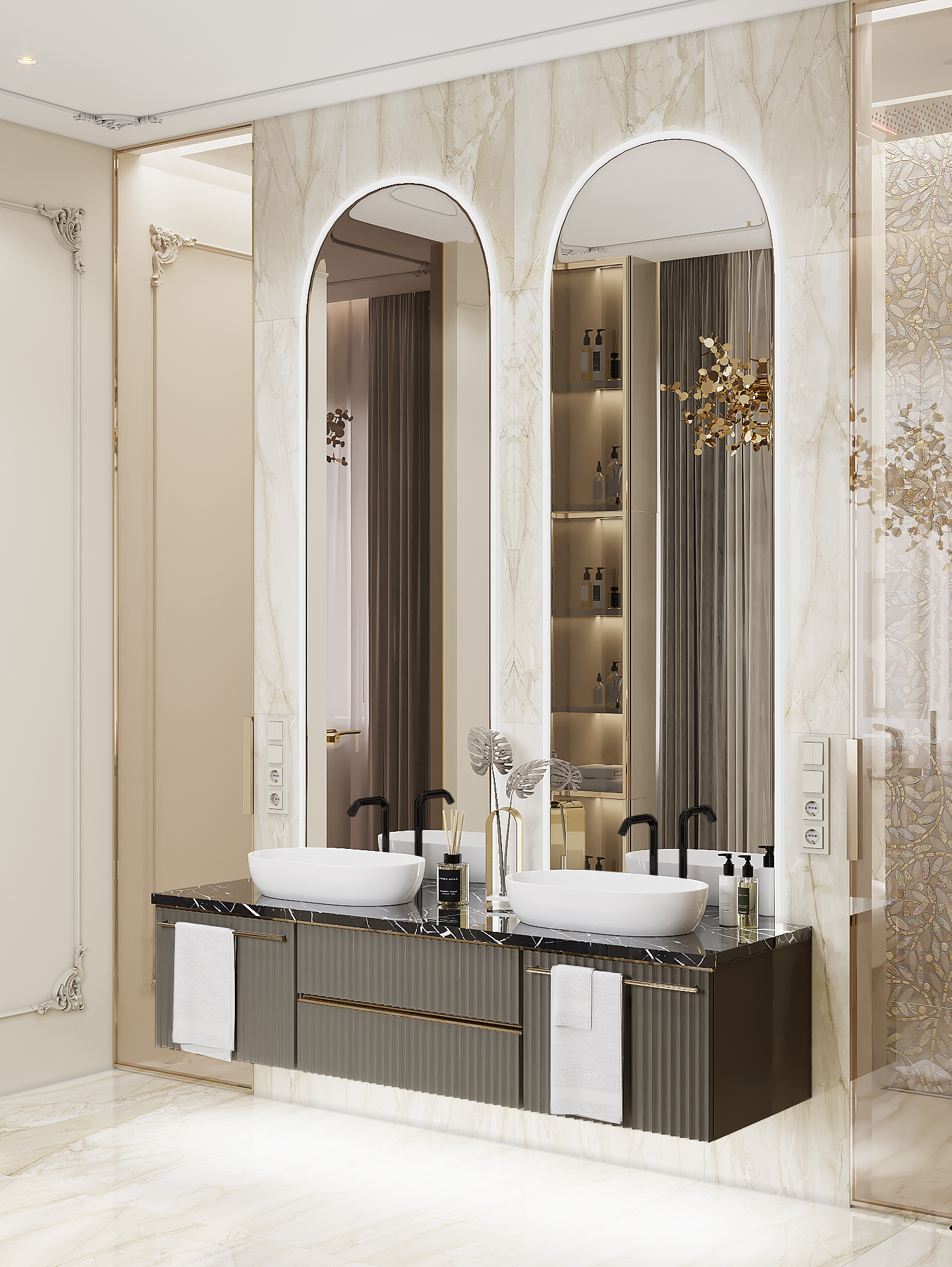 - Изысканные детали. В проекте используются эксклюзивные декоративные элементы: от ручной лепнины до инкрустации и золочения. Каждая деталь создаёт уникальную атмосферу роскоши.