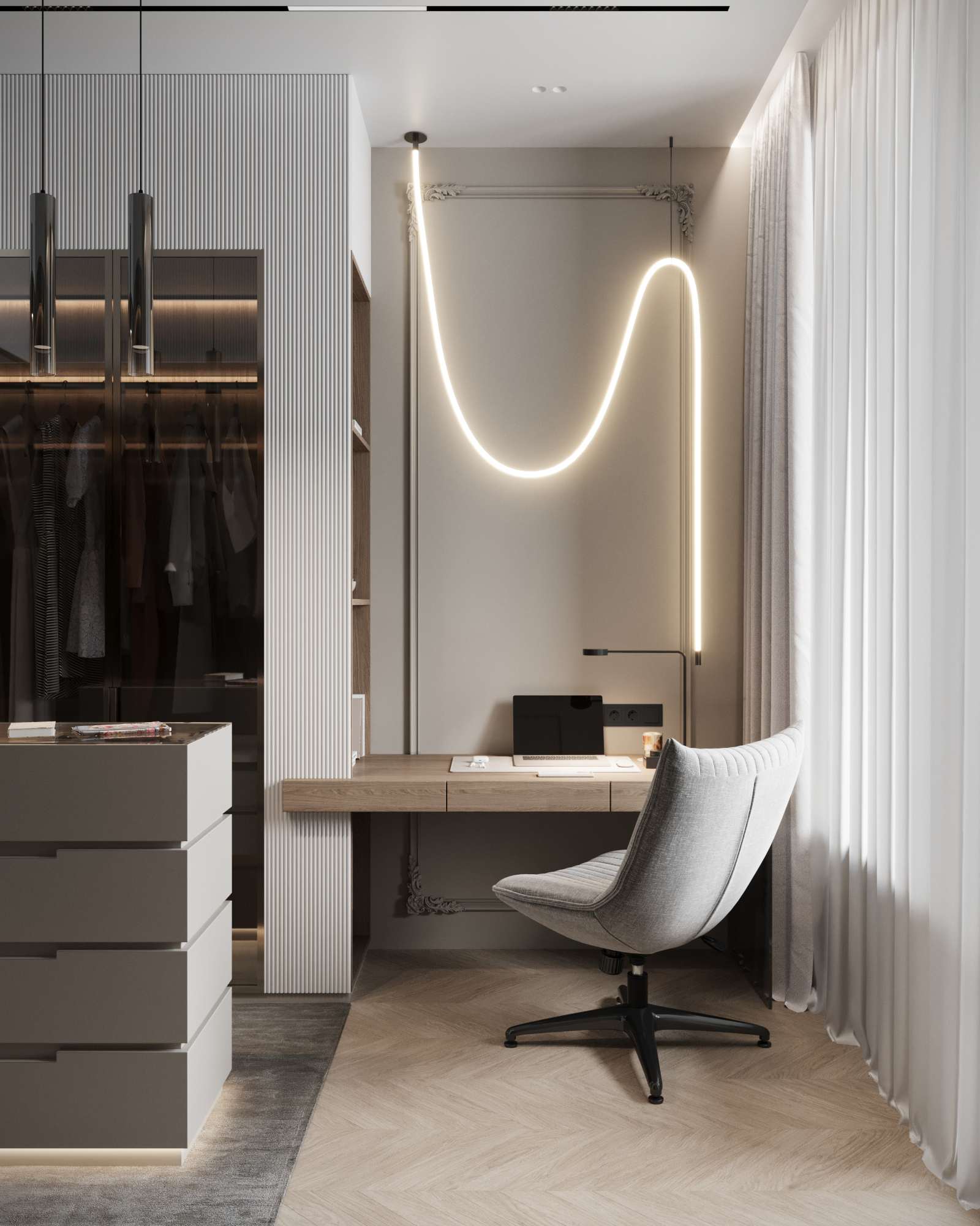 - Эстетика и функциональность. Мы разрабатываем не только визуально безупречный интерьер, но и практичные решения для повседневной жизни. От просторных гардеробных до инновационных кухонных зон — каждый элемент дизайн интерьера проекта продуман до мелочей.