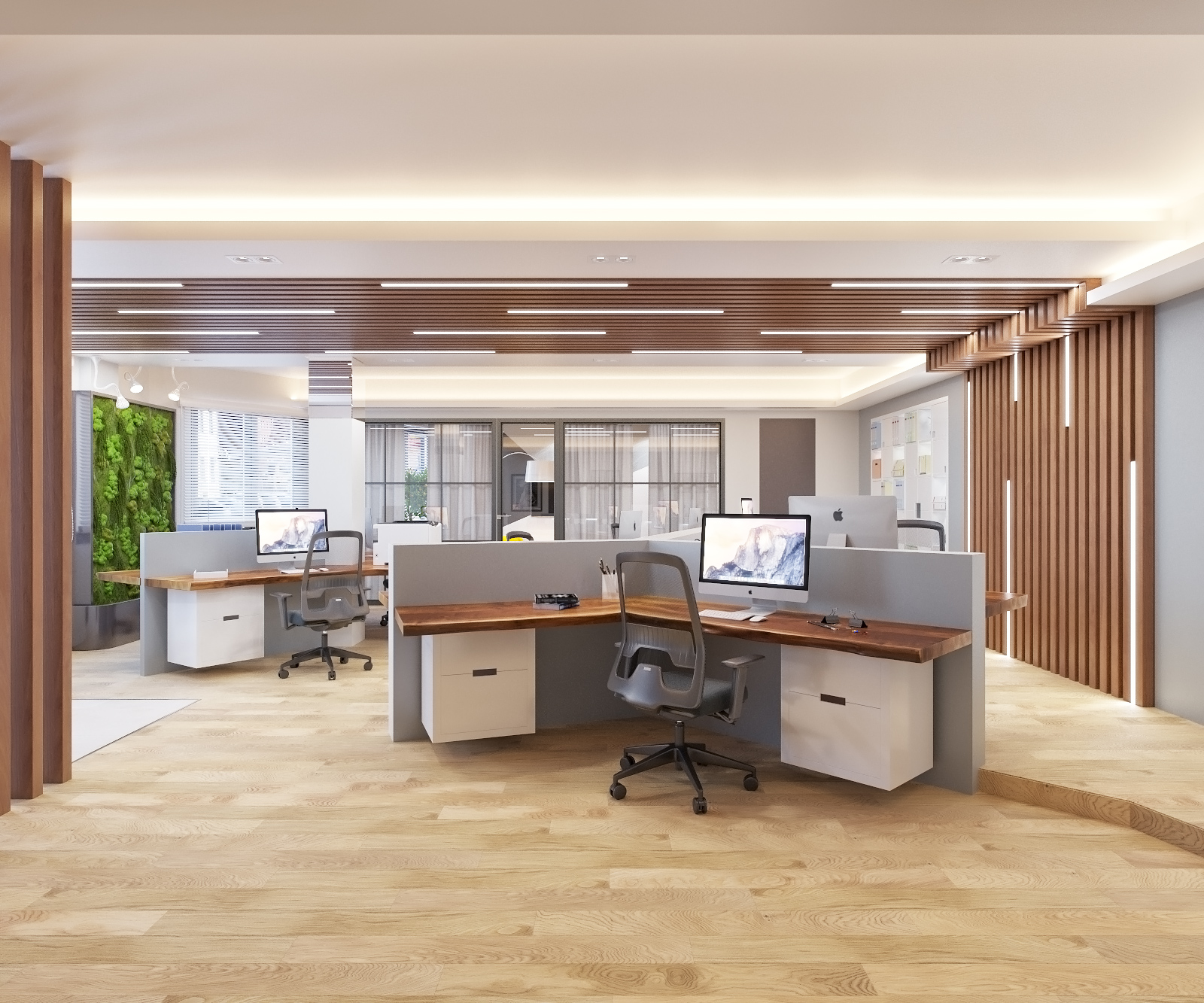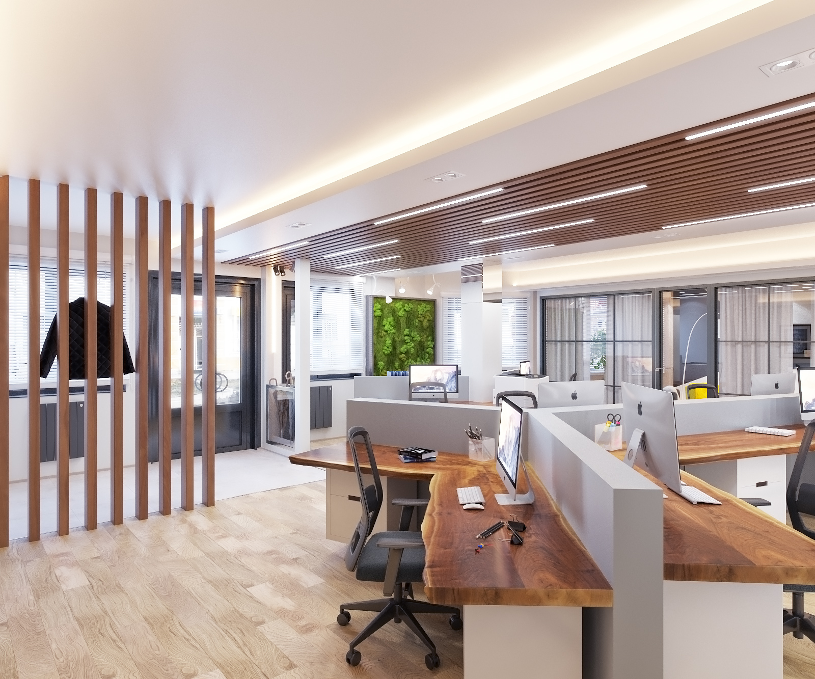 Интерьер офиса в современном стиле, воплощение экологического интерьера. Лучшие производители со всего мира сочетаются с простором и комфортной планировкой