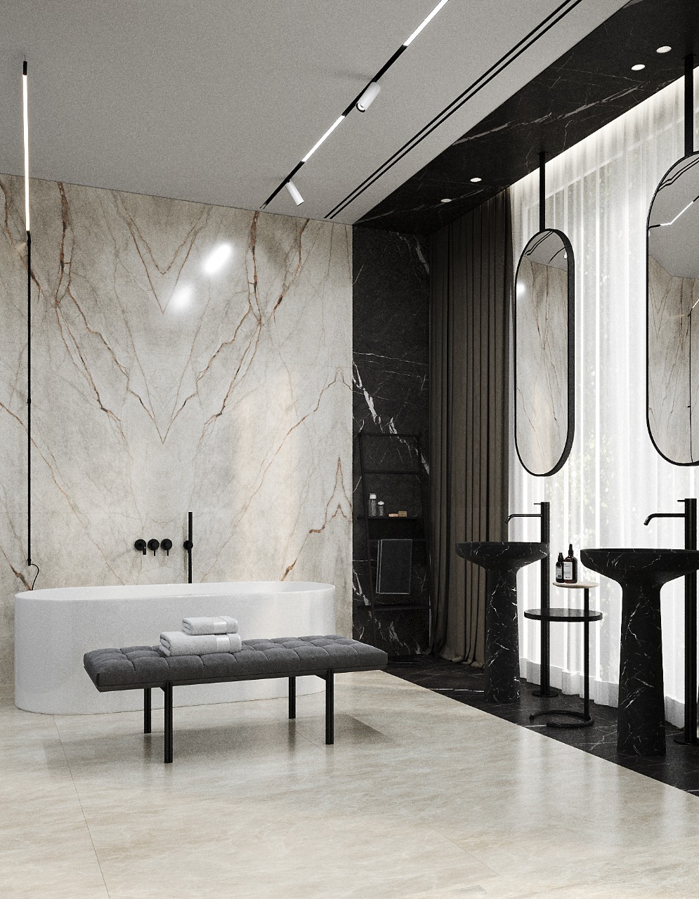 Если посмотреть на картинки с красивыми интерьерами, то на них вы не увидите таких вещей как: гель для душа, моющие средства, гладильные доски, сушилка для одежды, пылесос и т.д. В большинстве случаев их не отображают, либо интерьер хорошо продуман, и они не бросаются в глаза. Если не подумать о размещении всех этих вещей, то они испортят эстетику вашего интерьера, поэтому очень важную роль визуально дорогого интерьера занимает порядок. Больше всего захламлению подвержены санузлы. Очень важно продумать зоны хранения гигиенических средств. Например, в душе нужно предусмотреть ниши, спрятанные от глаз при входе в санузел. Так же чтобы избавиться от визуального шума на открытых полках стоит применить дозаторы в одной стилистике и цветовом решении. А для бытовой химии обязательно предусмотрите закрытый шкаф, например, над инсталляцией.