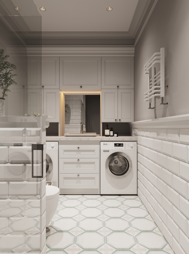 В гостевом санузле мы так же разместили прачечную, получилось совместить красивый классический стиль с практичностью и высокой функциональностью.