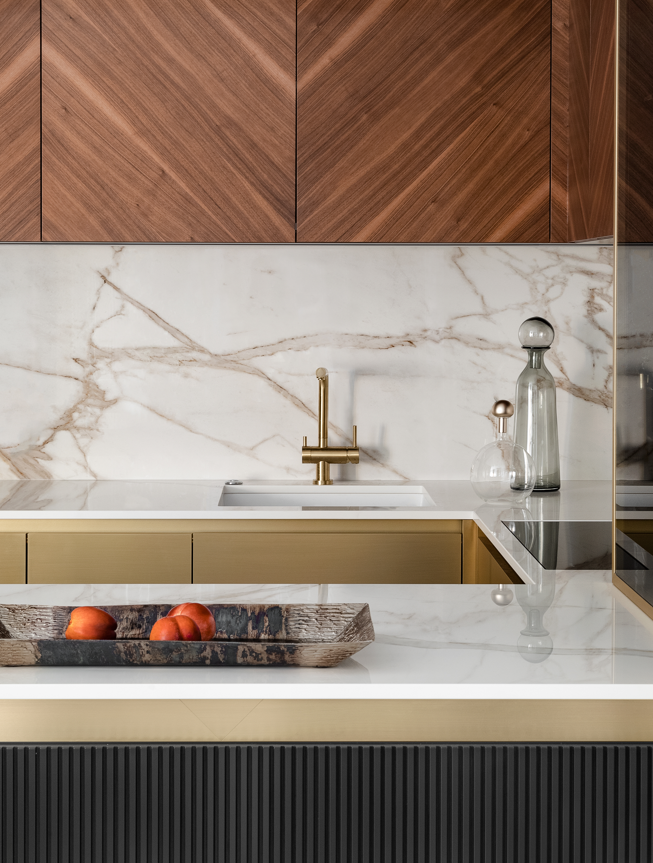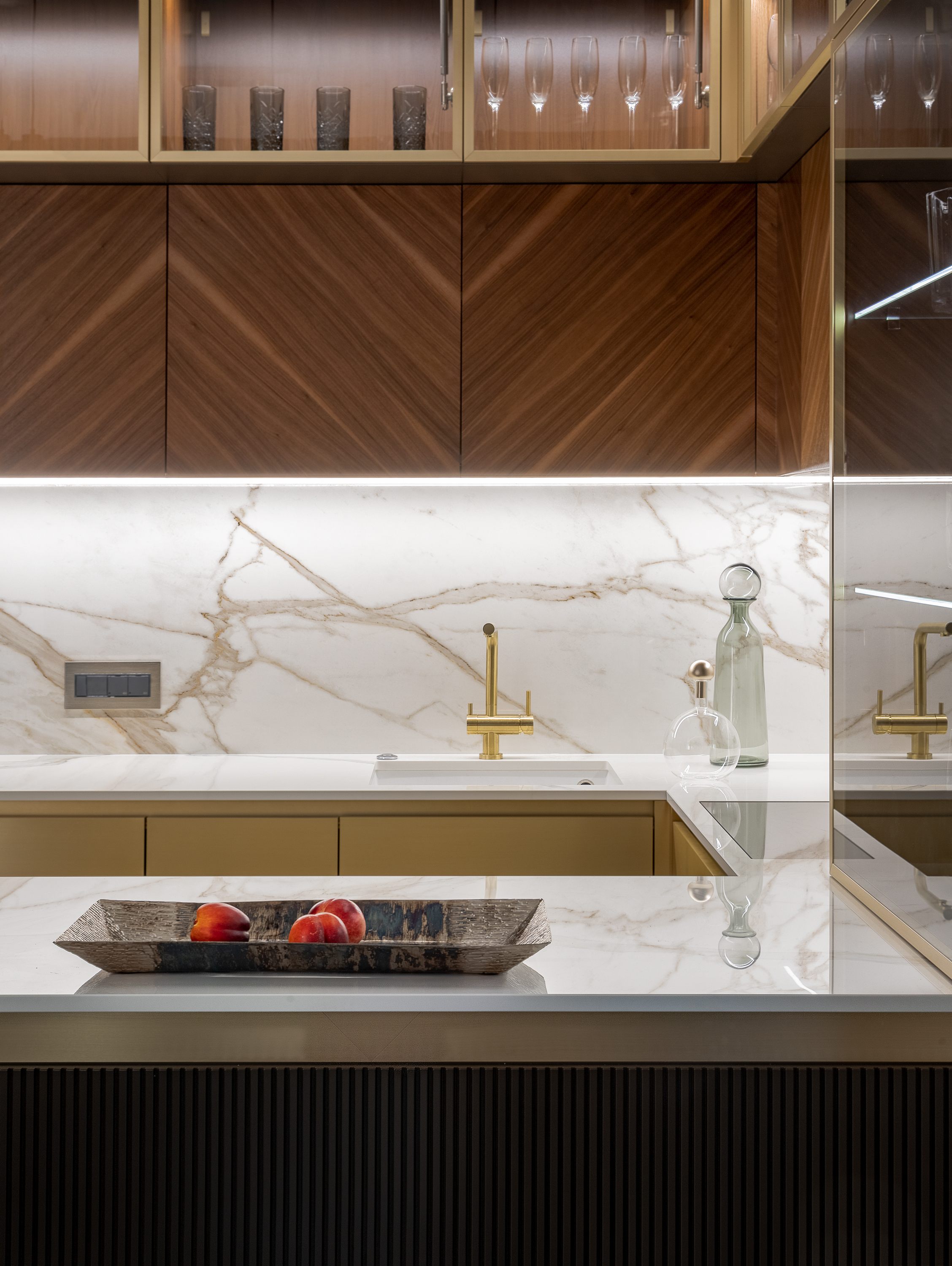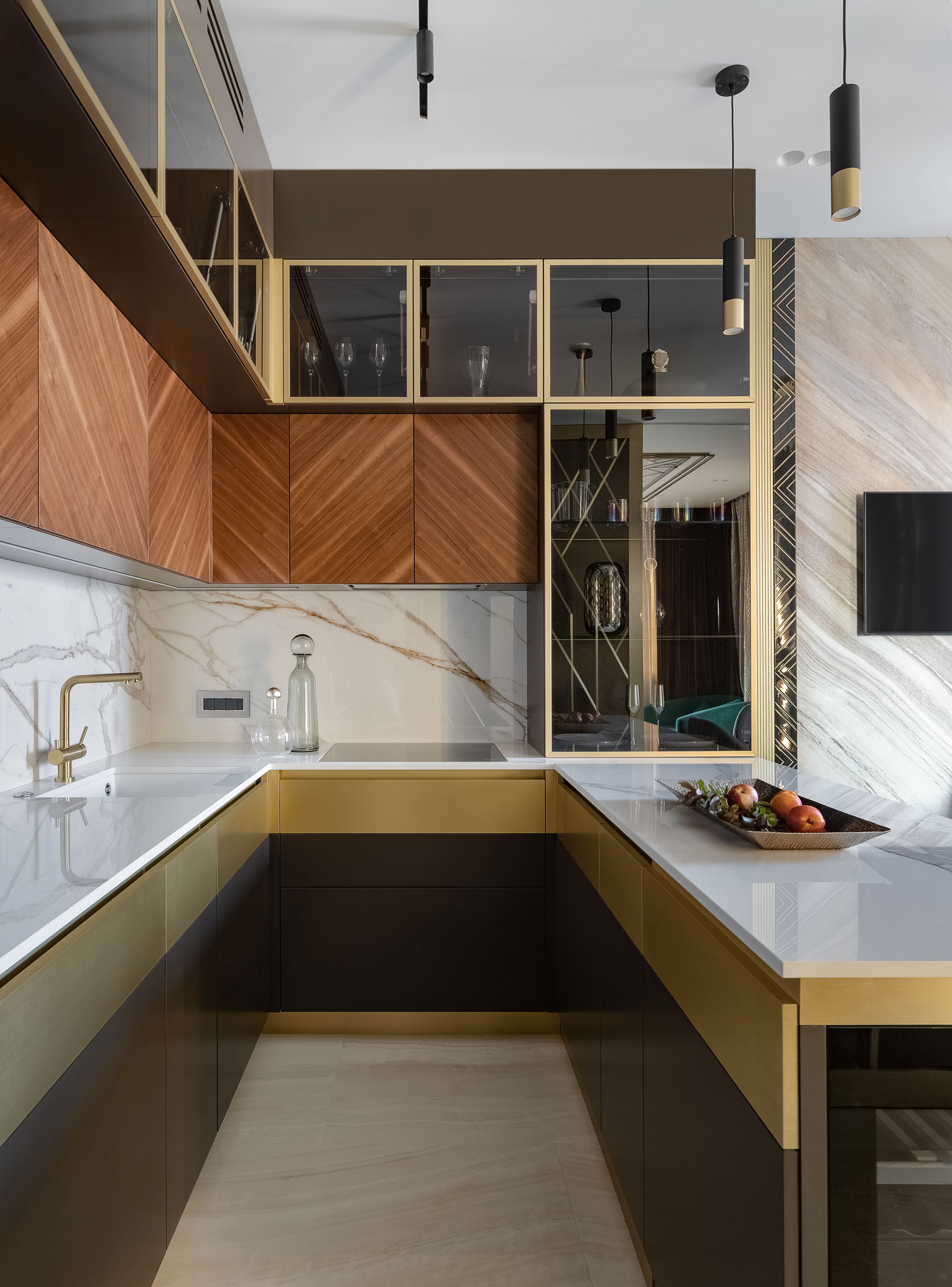 Кухня с фасадами из шпона натурального ореха, латуни и шпона дуба тонированного в благородный темный цвет. Планировка кухни П- образная с баром. С торца бара мы, по нашему дизайн проекту квартиры в Москве, расположили винный шкаф.