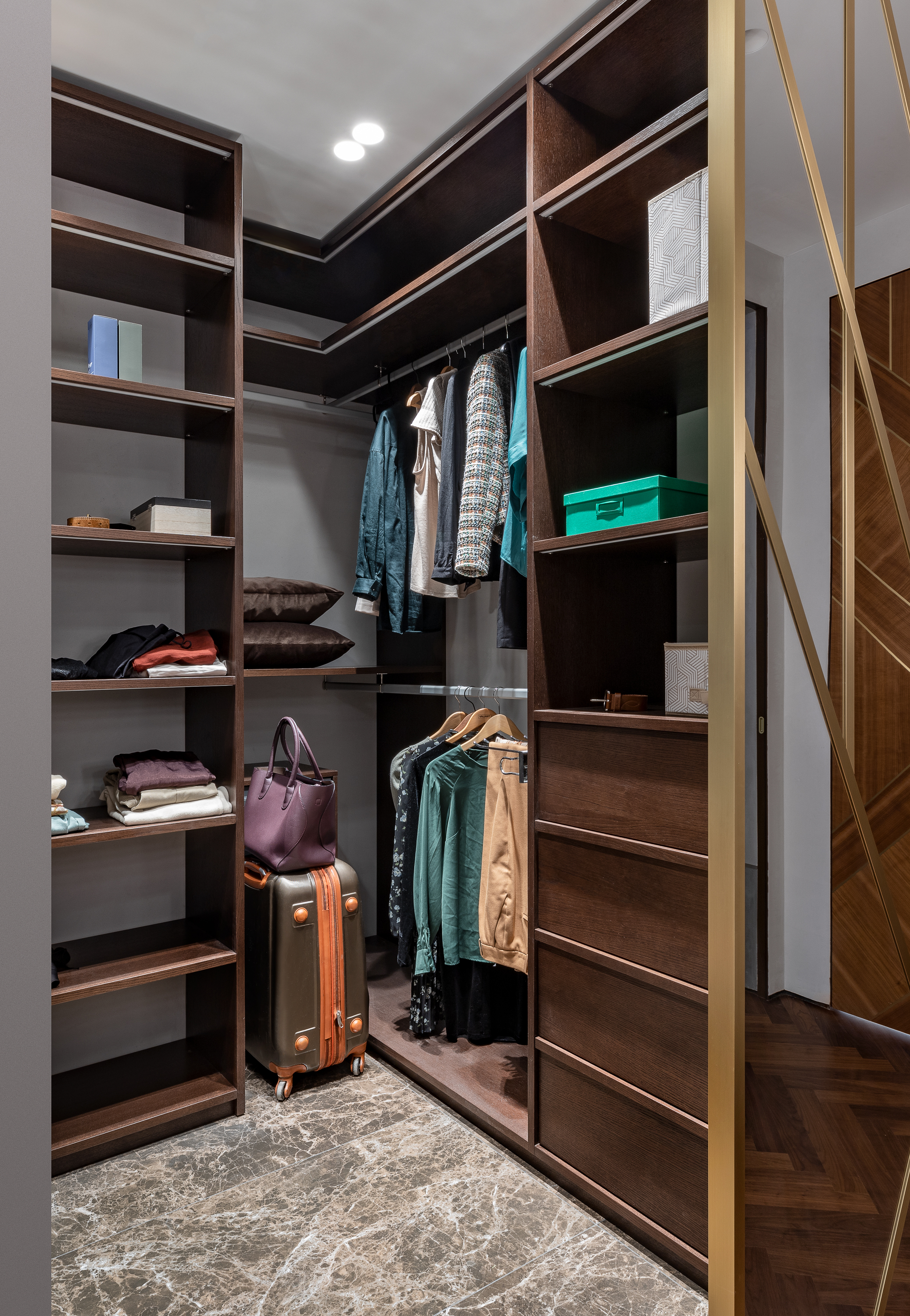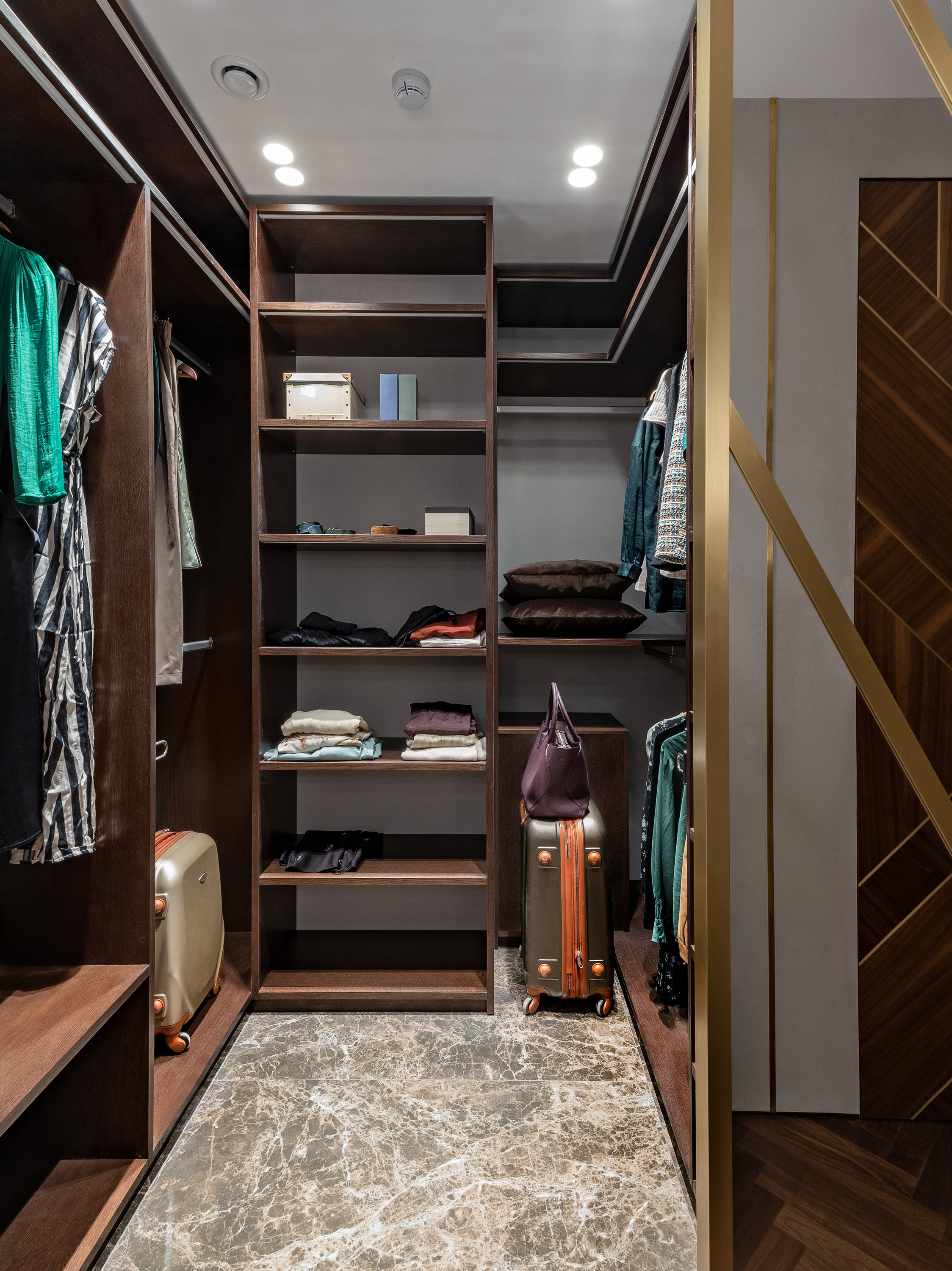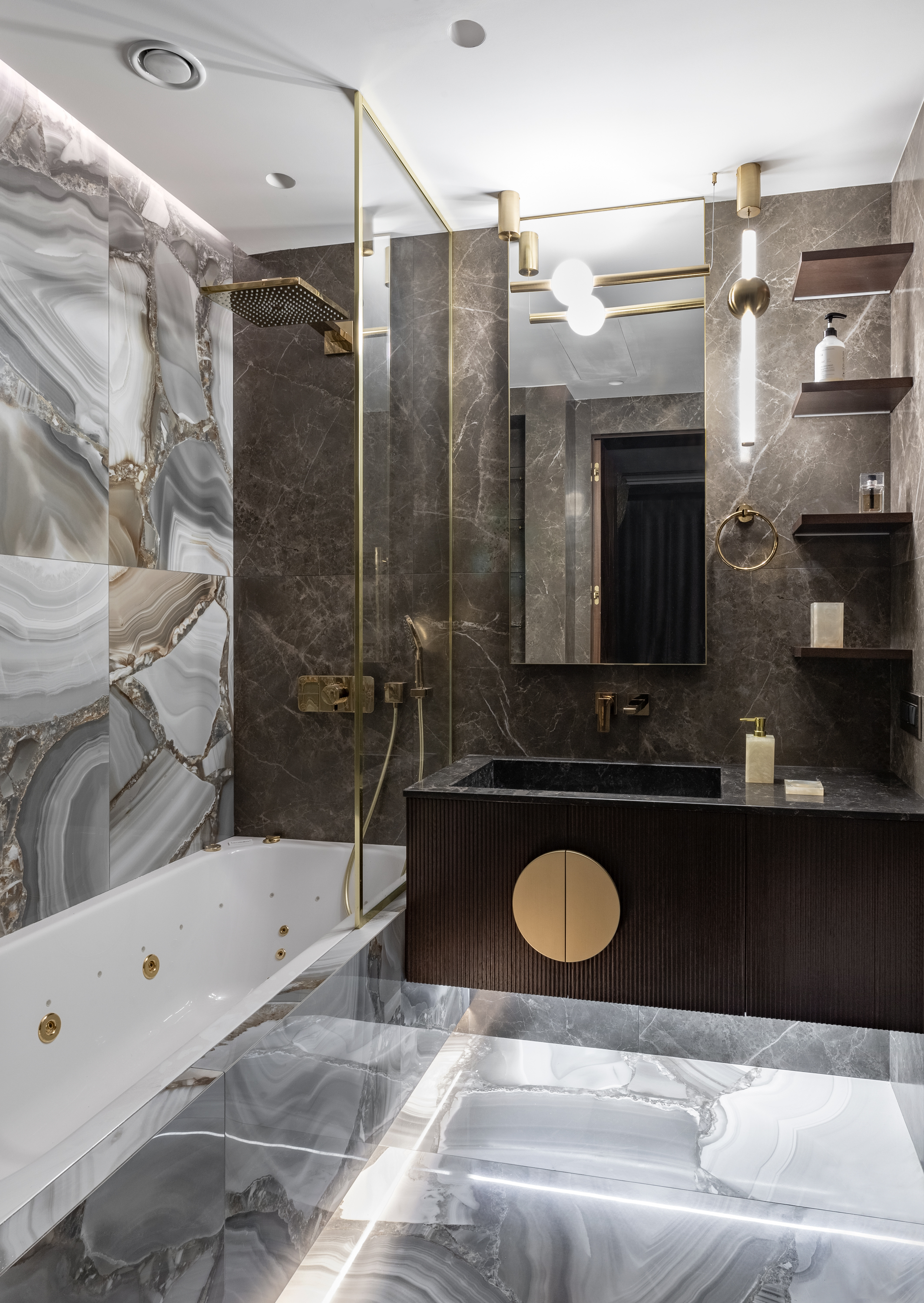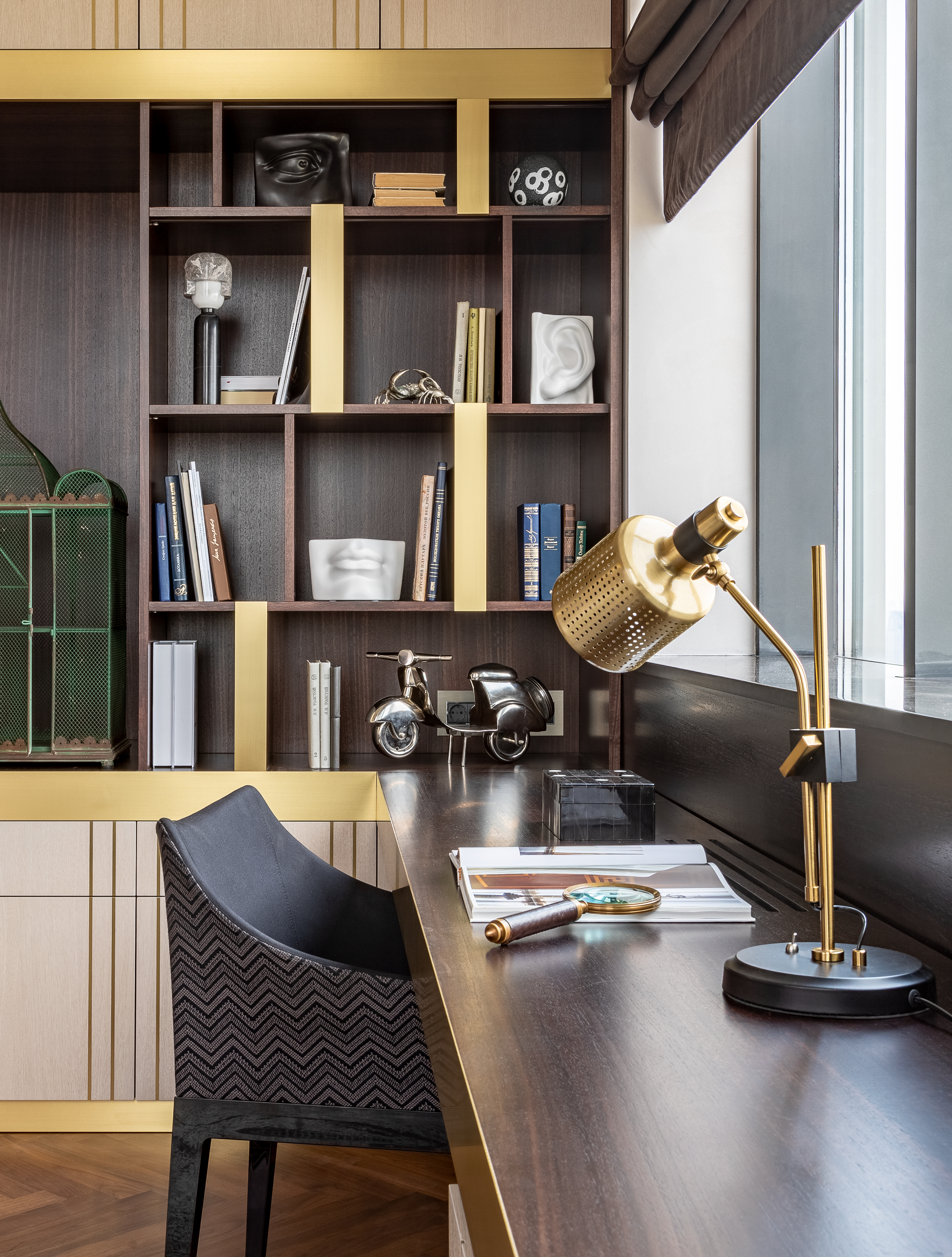 Кухня с фасадами из шпона натурального ореха, латуни и шпона дуба тонированного в благородный темный цвет. Планировка кухни П- образная с баром. С торца бара мы, по нашему дизайн проекту квартиры в Москве, расположили винный шкаф.