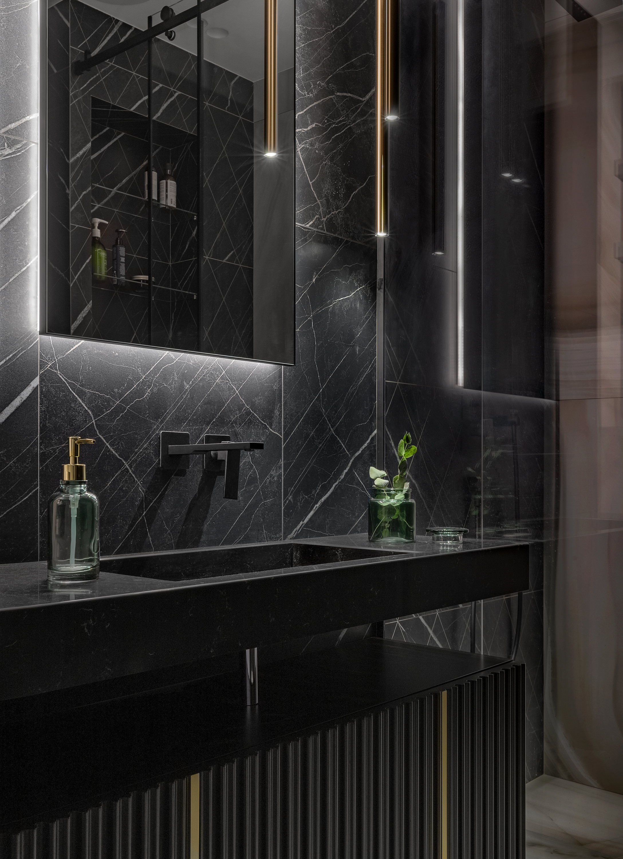 Сверху и над столешнице бара, мы предусмотрели секции для хранения за тонированным стеклом.