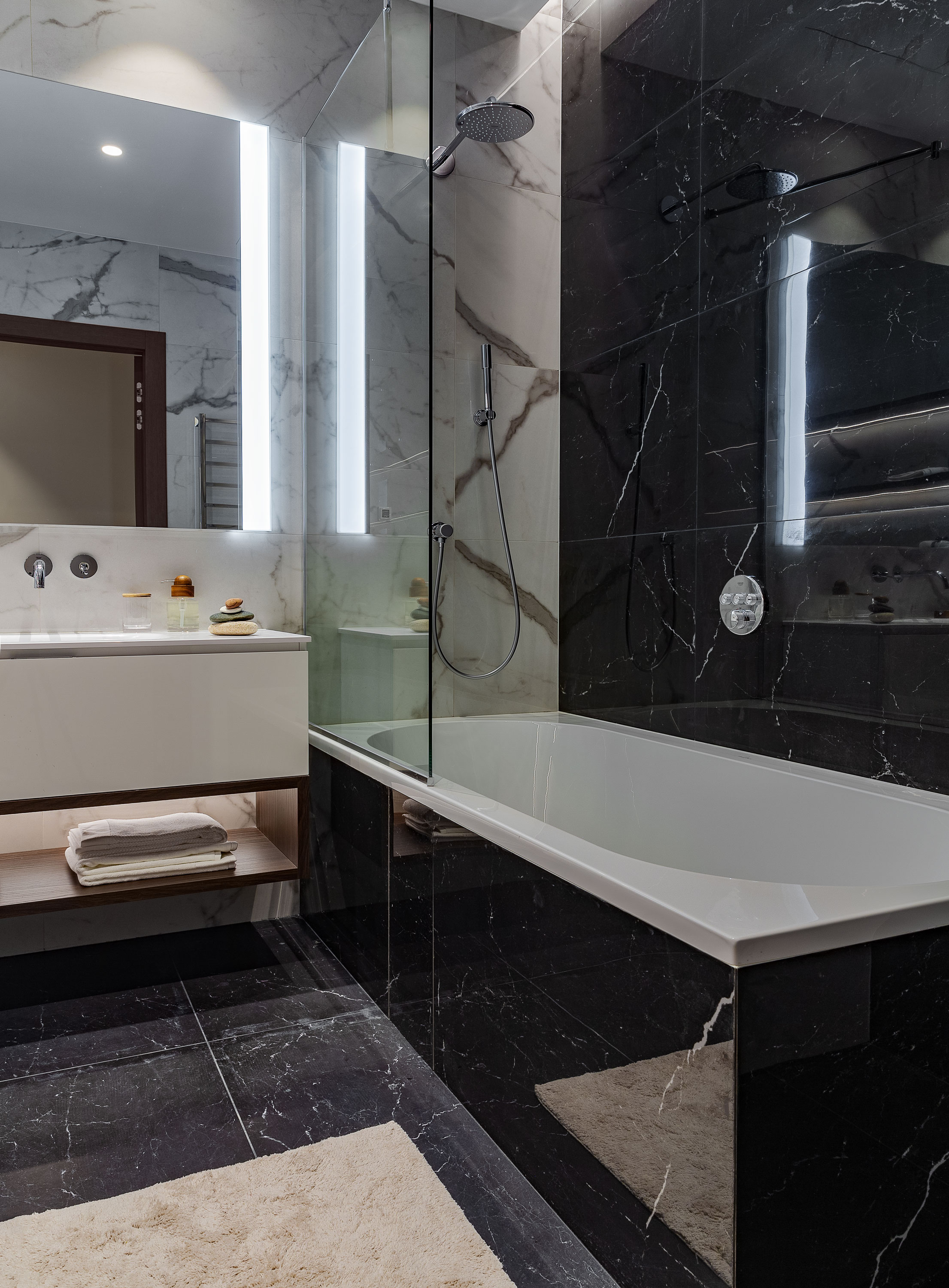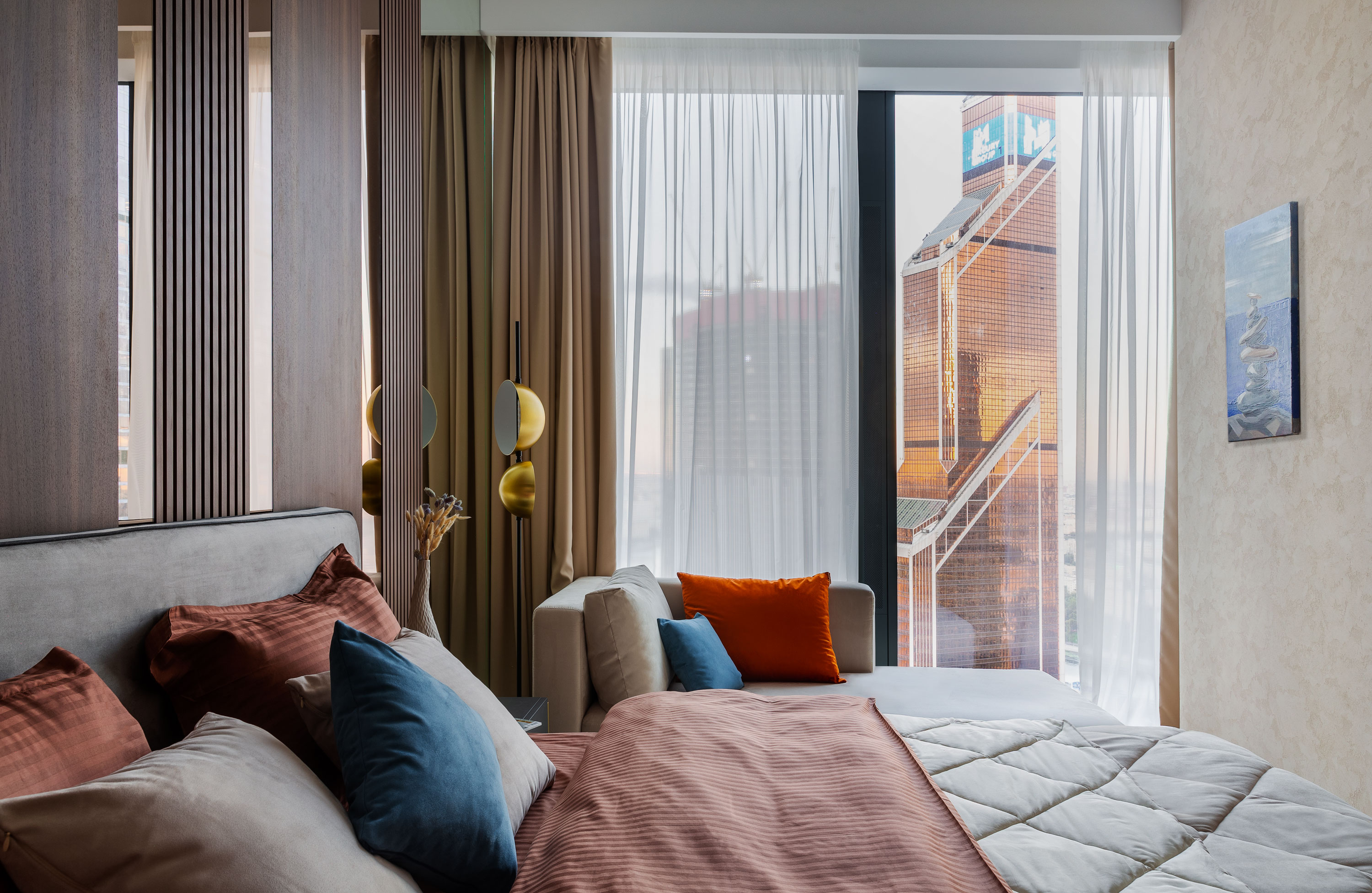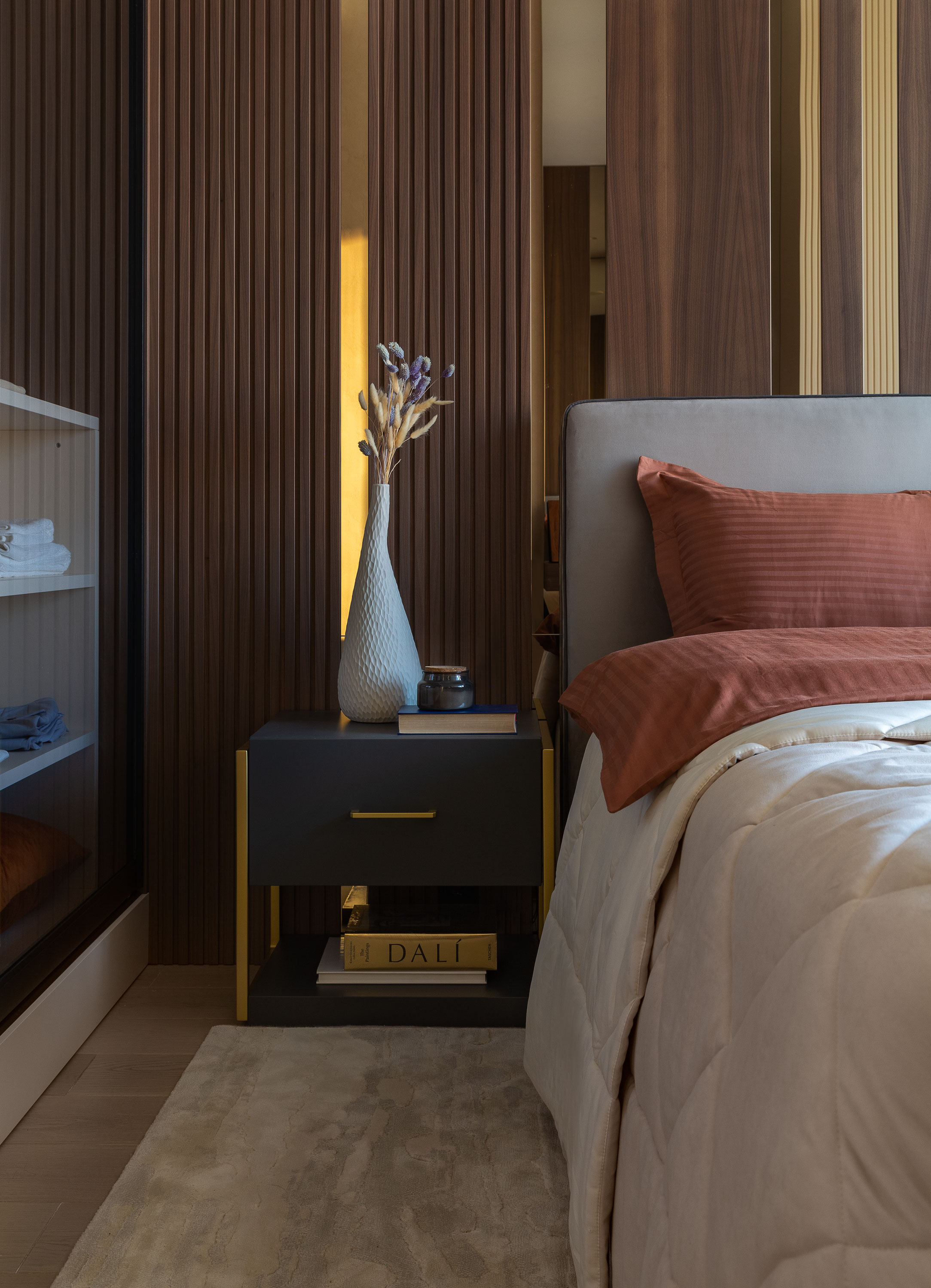 - С другой стороны от кровати идет стеклянный гардероб от пола до потолка.