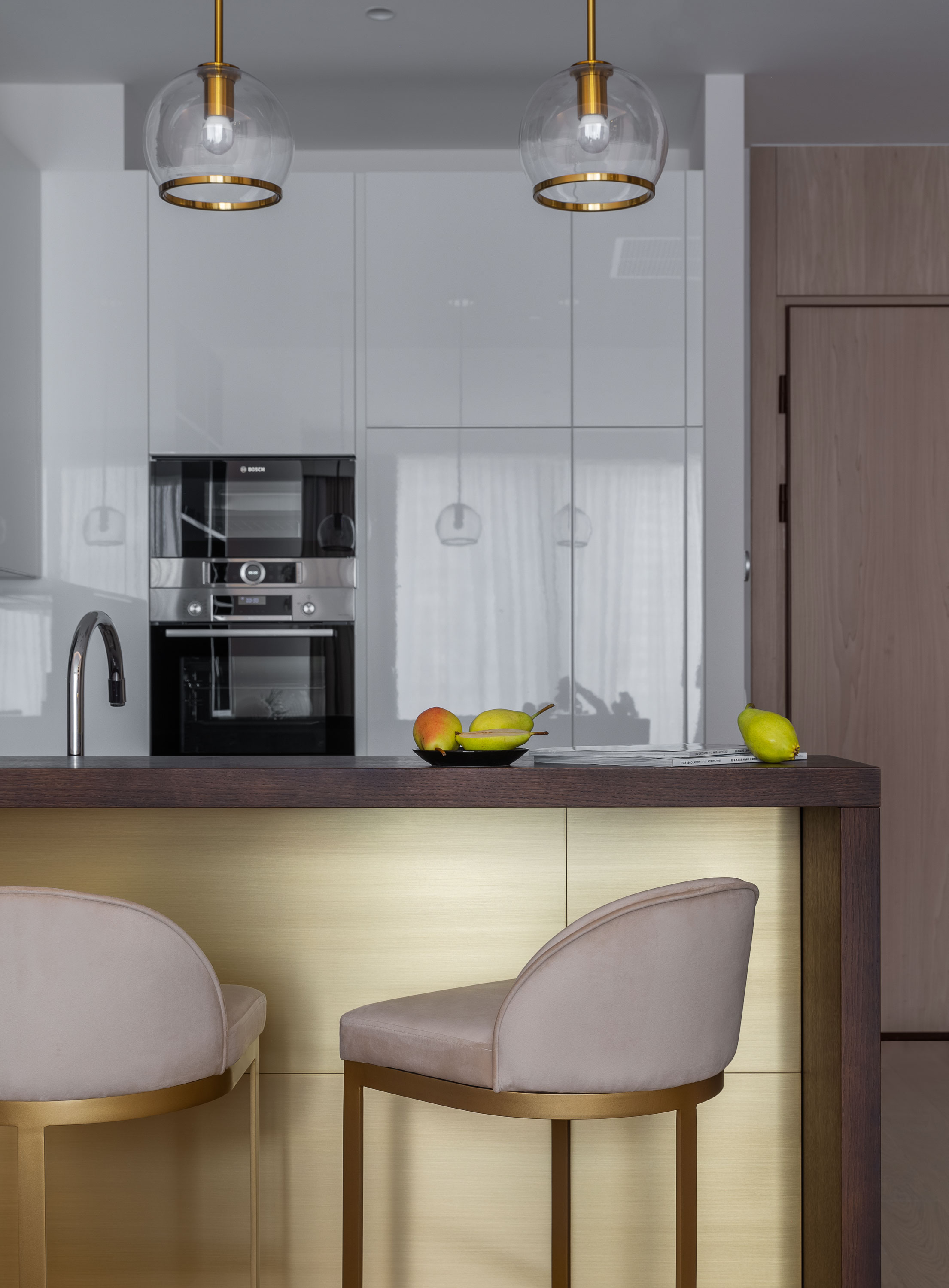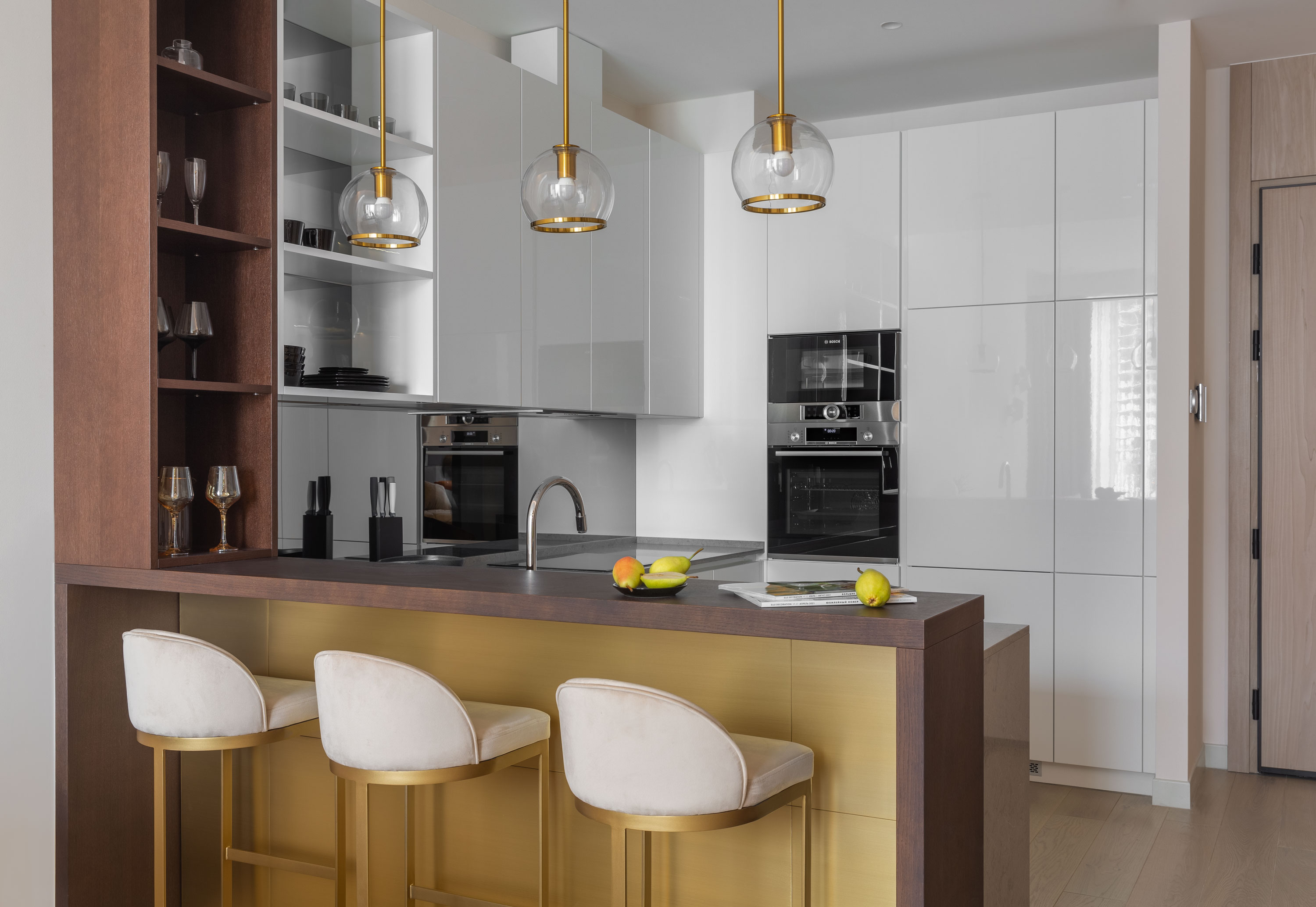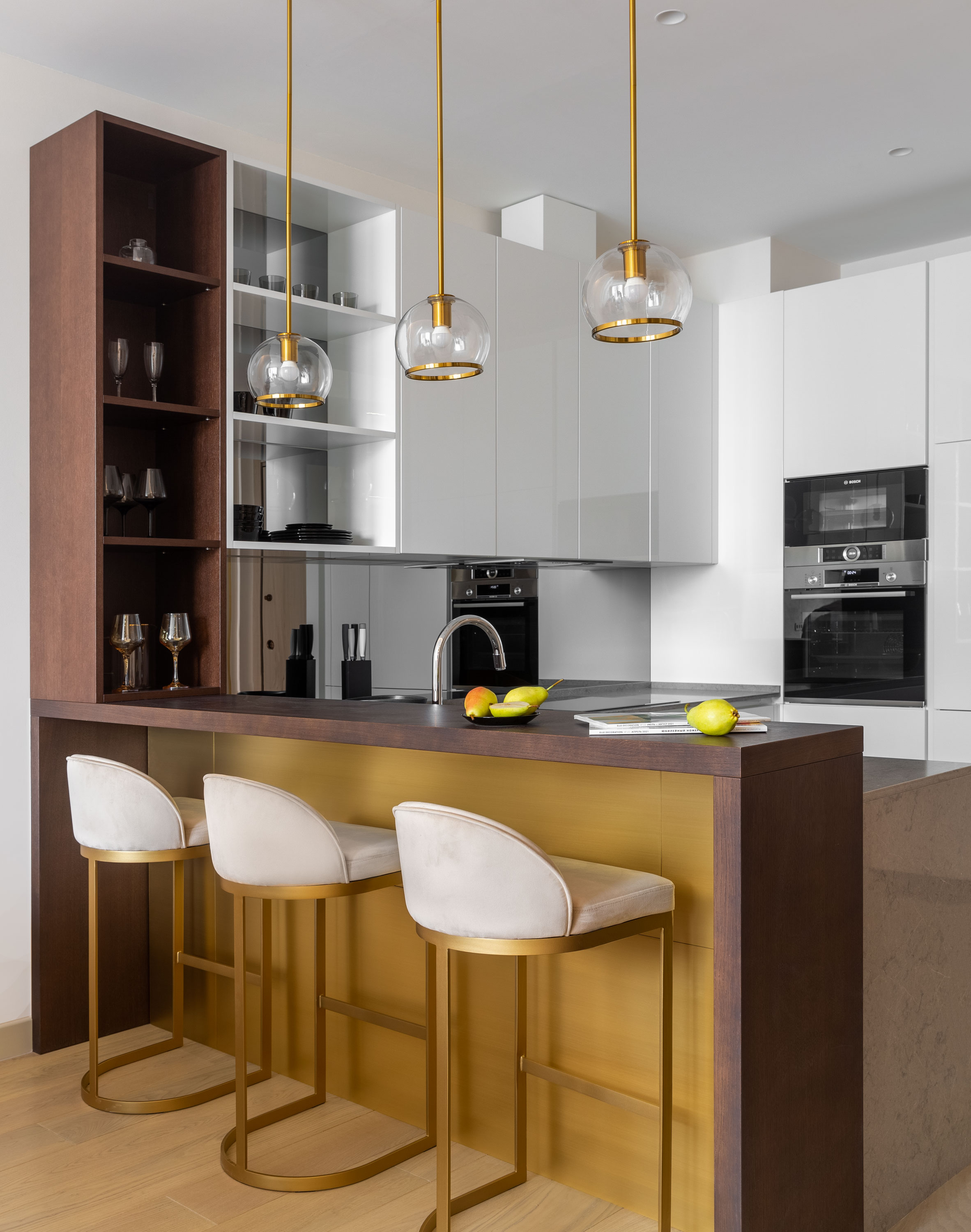 - На кухне под баром мы сделали латунную панель в зоне стульев, а изначально там было зеркало.