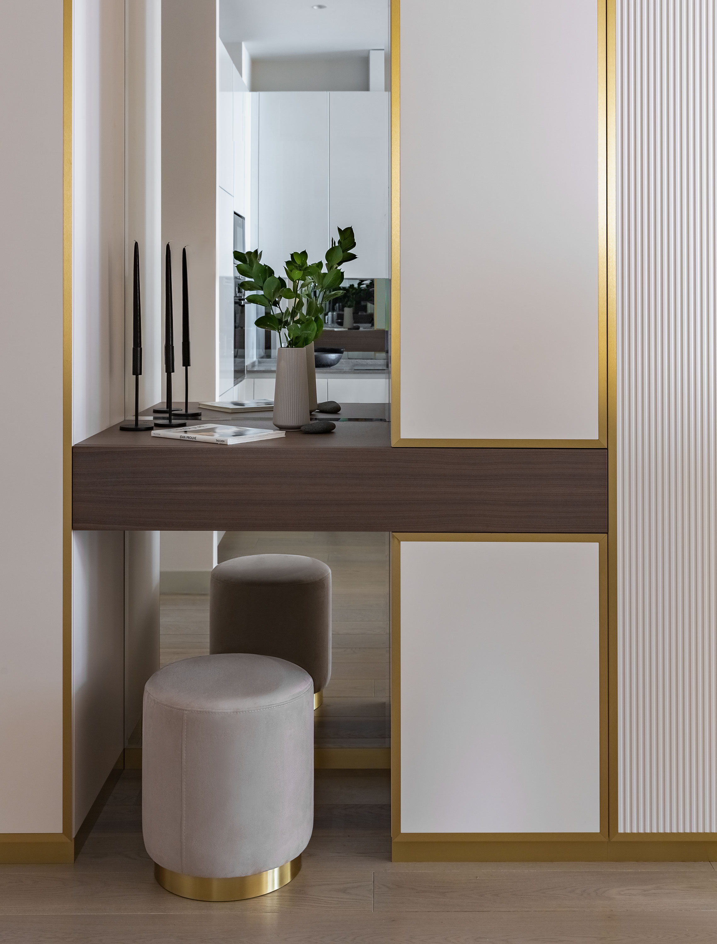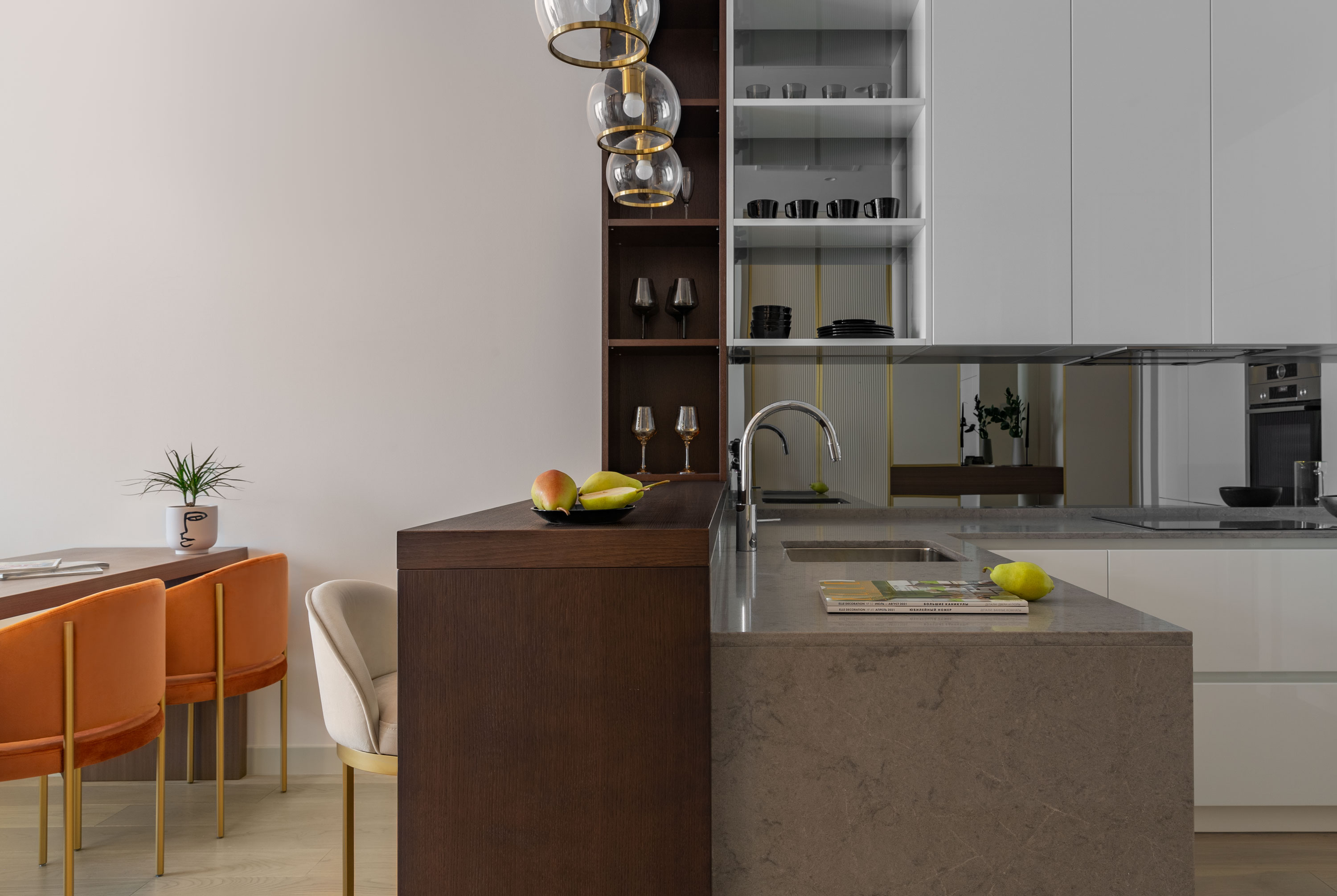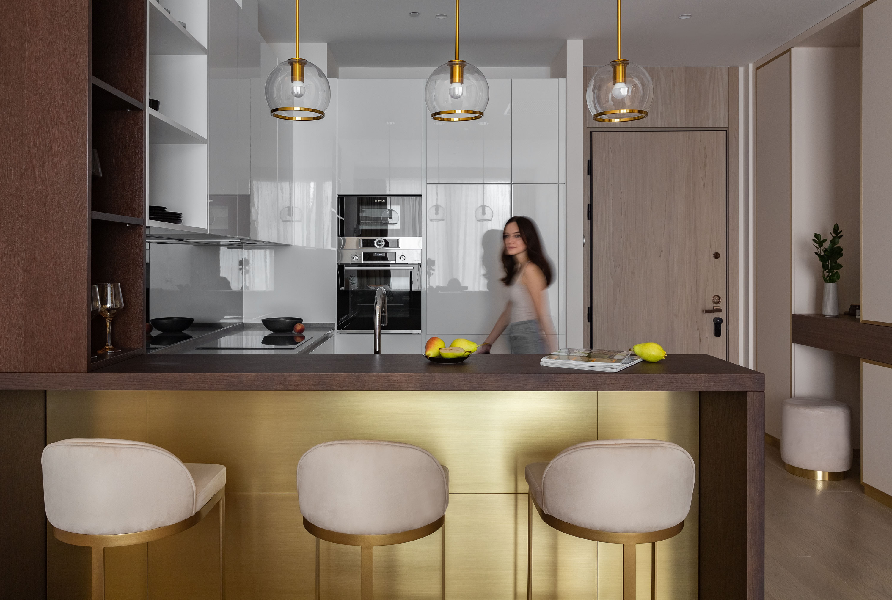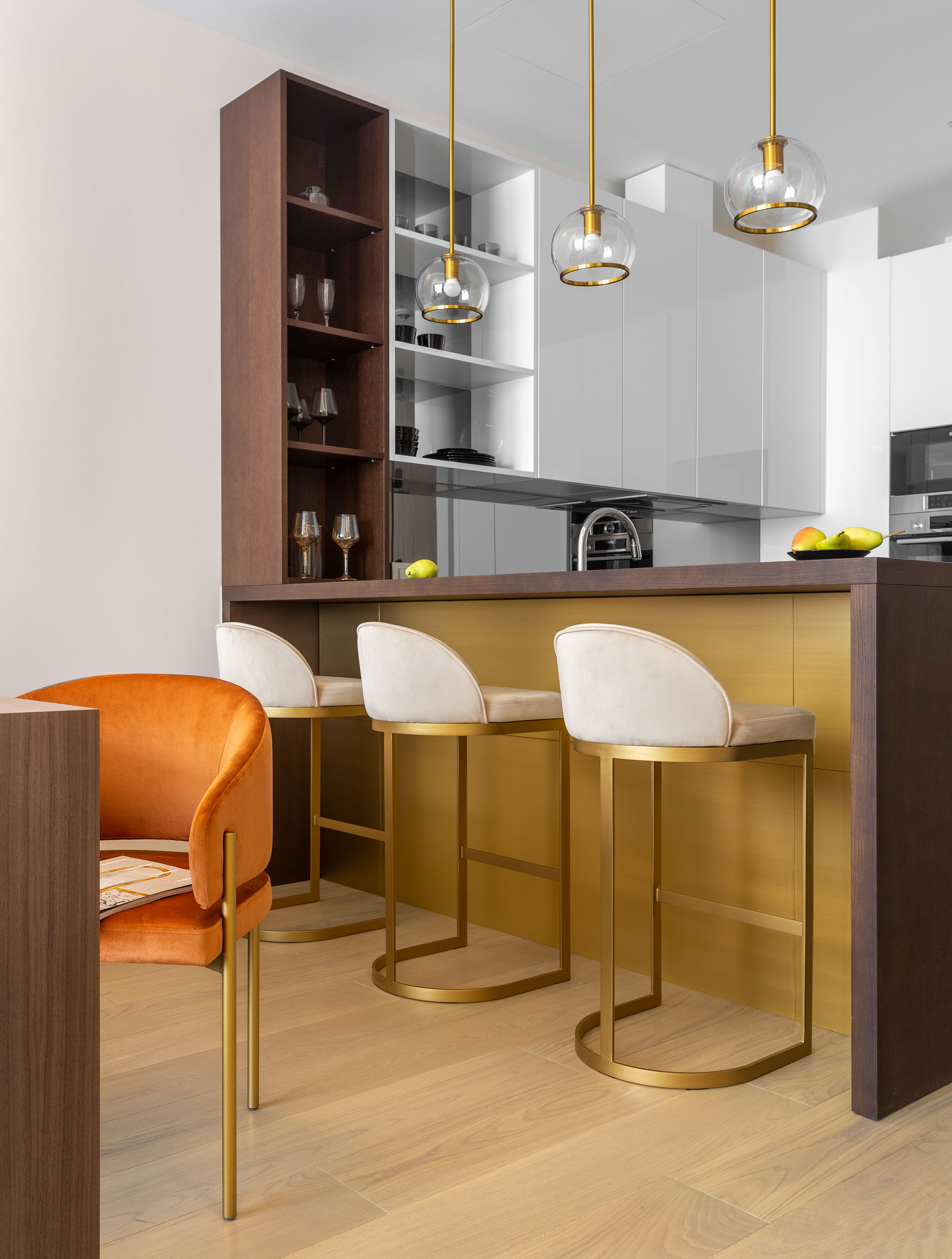 - На кухне под баром мы сделали латунную панель в зоне стульев, а изначально там было зеркало.