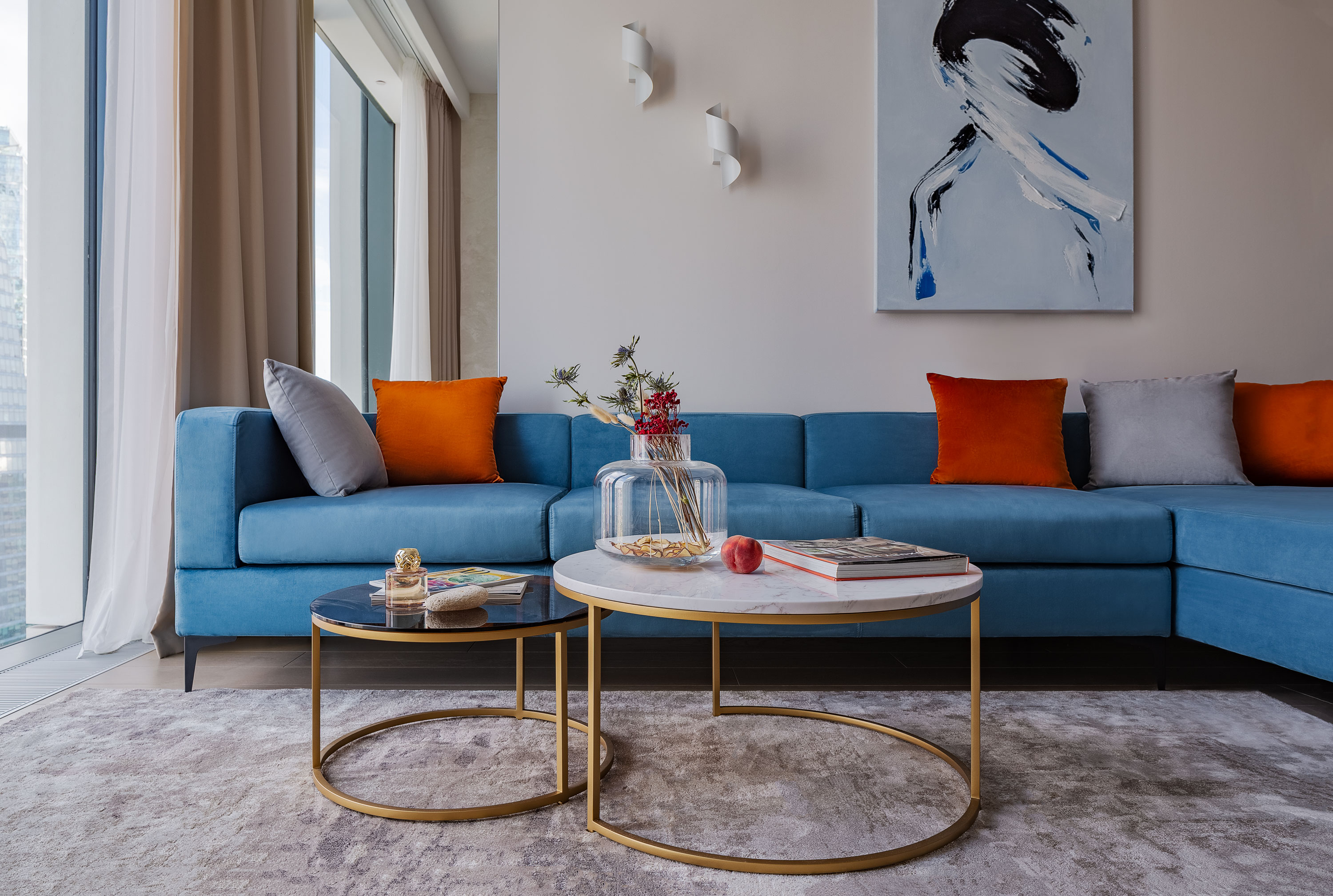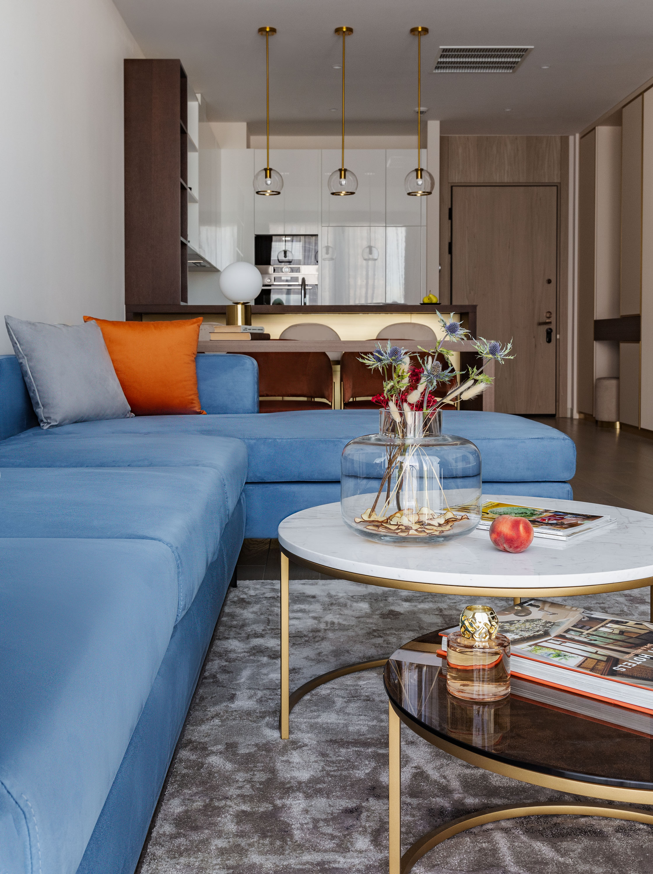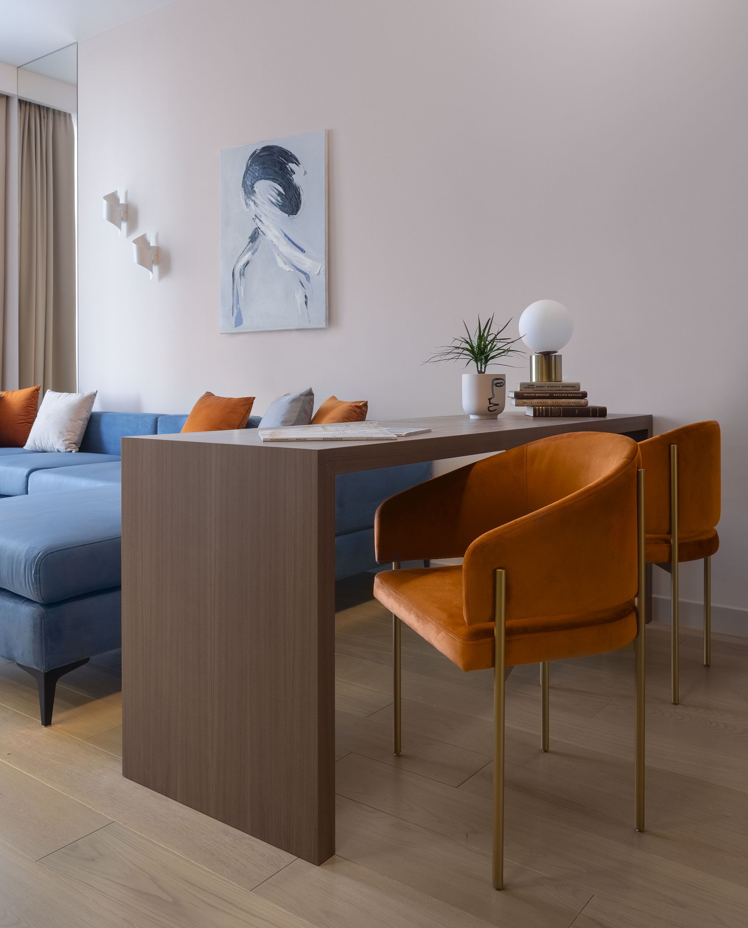 - Напротив расположили угловой диван синий и за диван добавили зеркальную полосу, как прием для расширения пространства, имитации продолжение прохода.