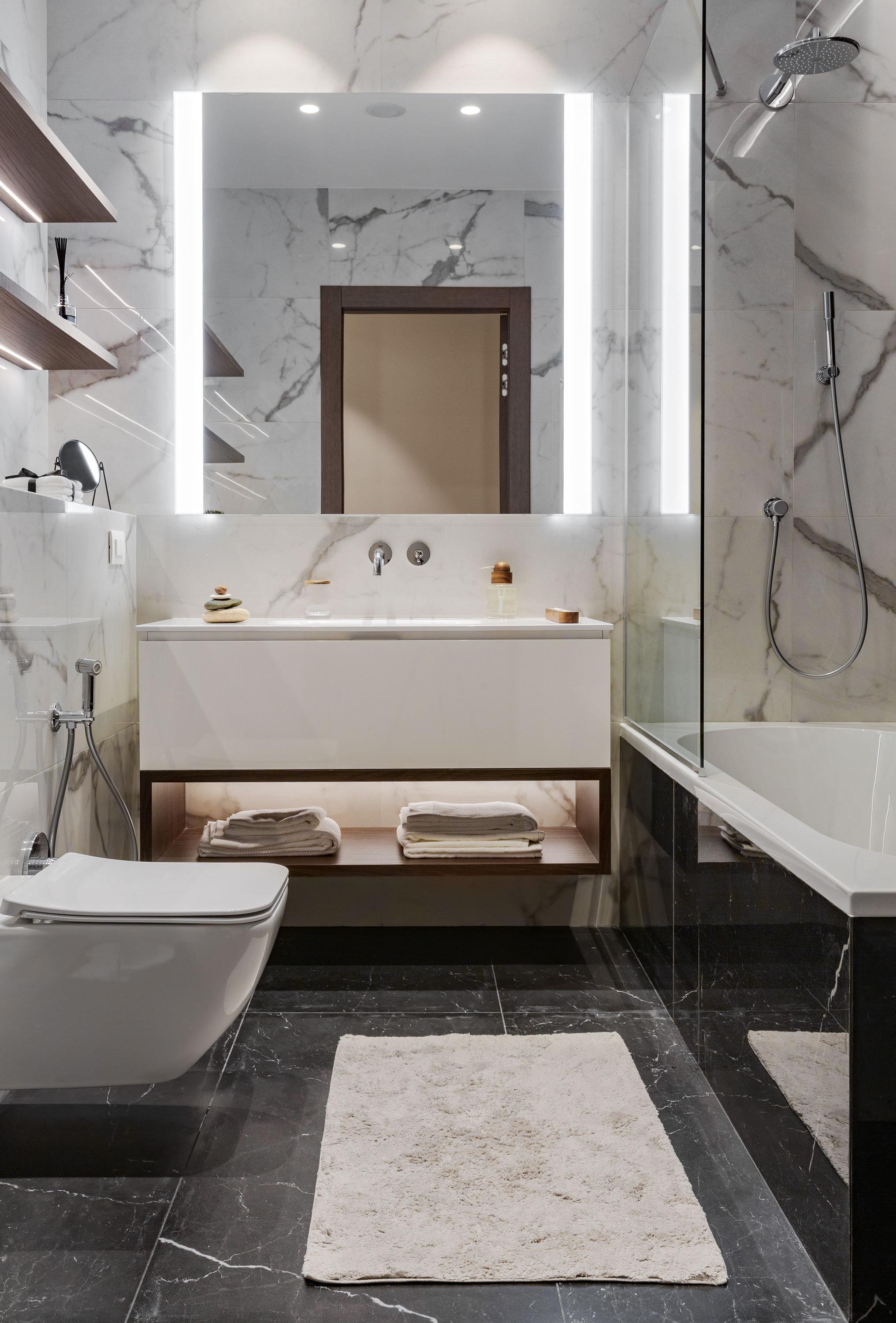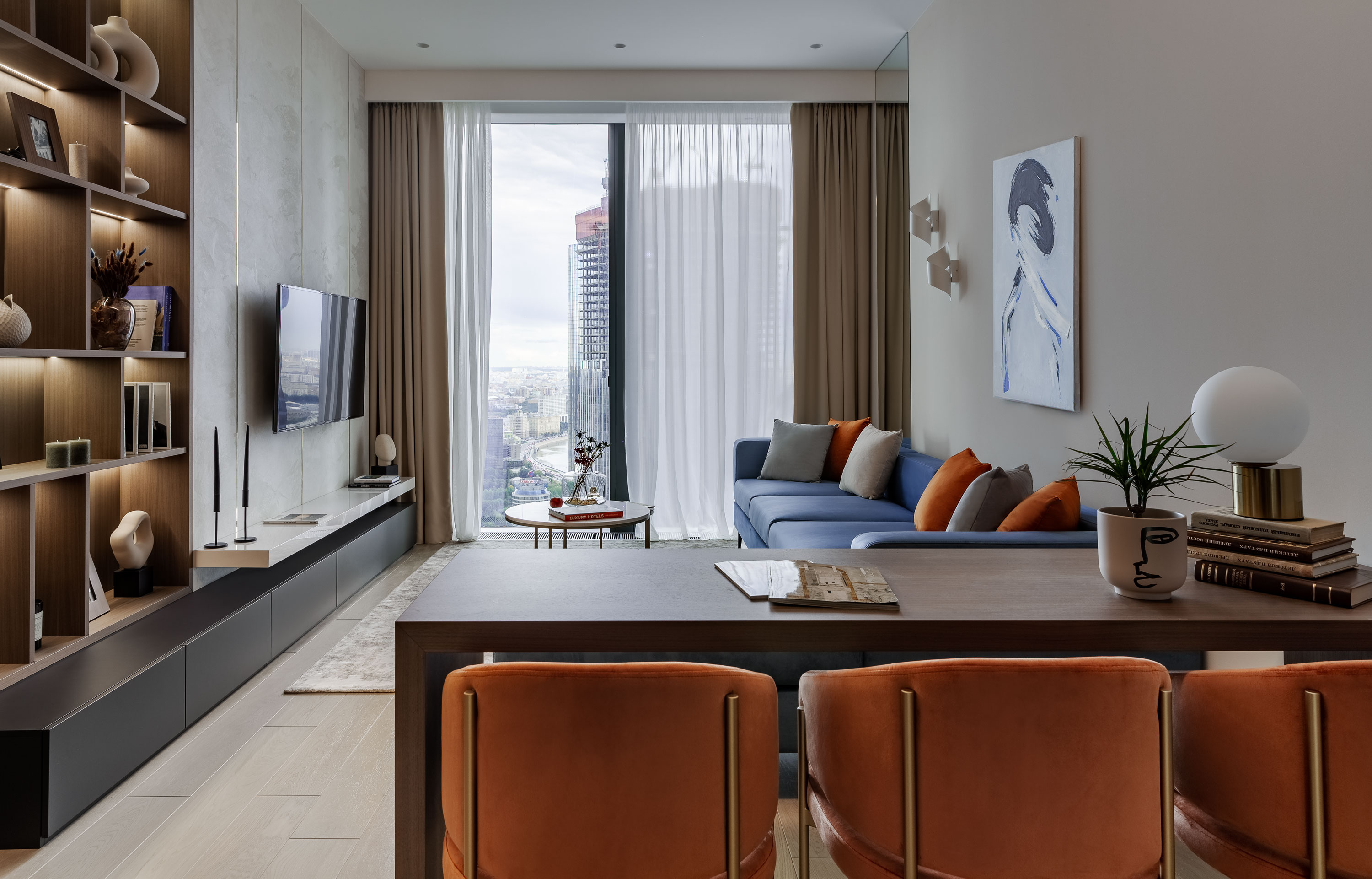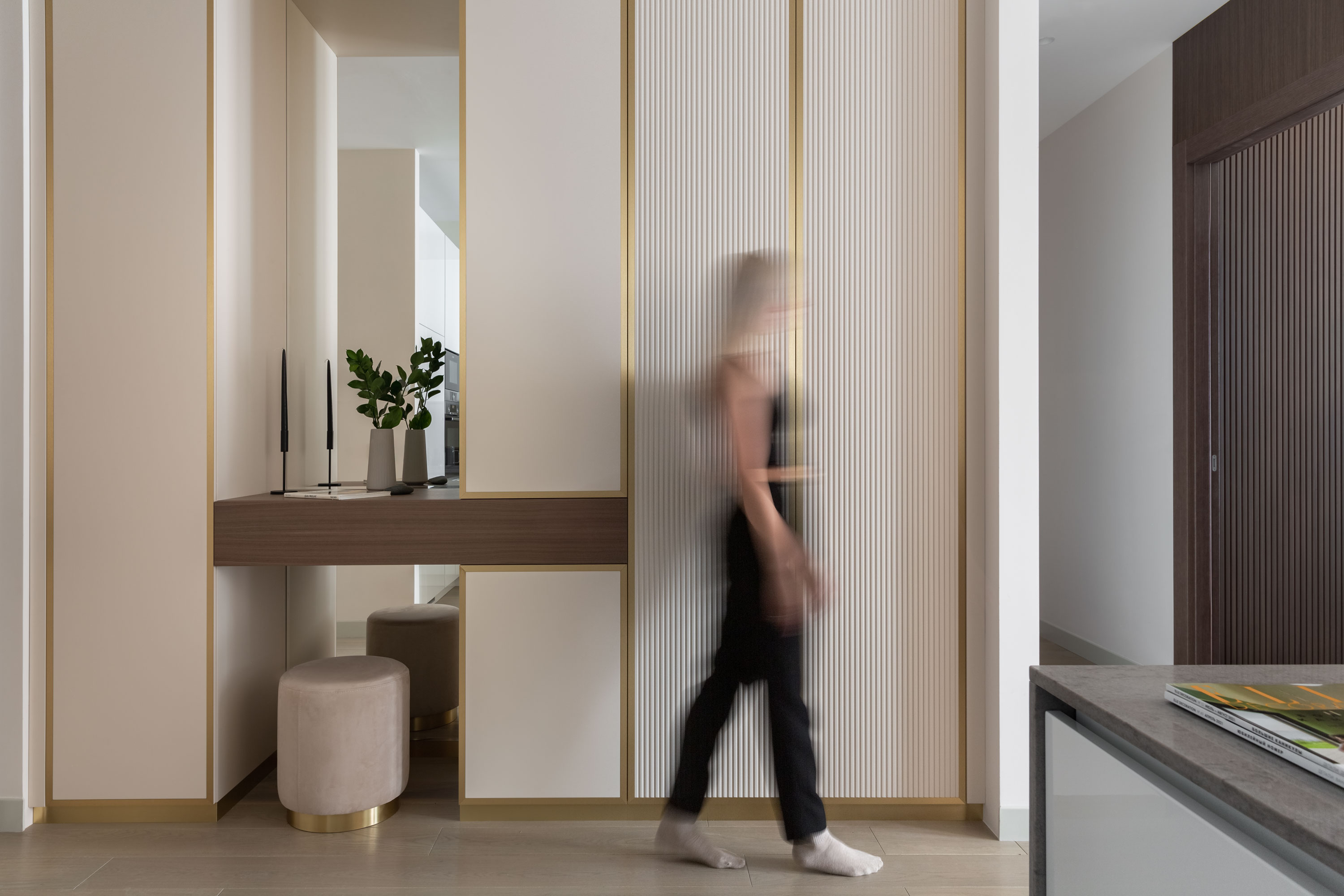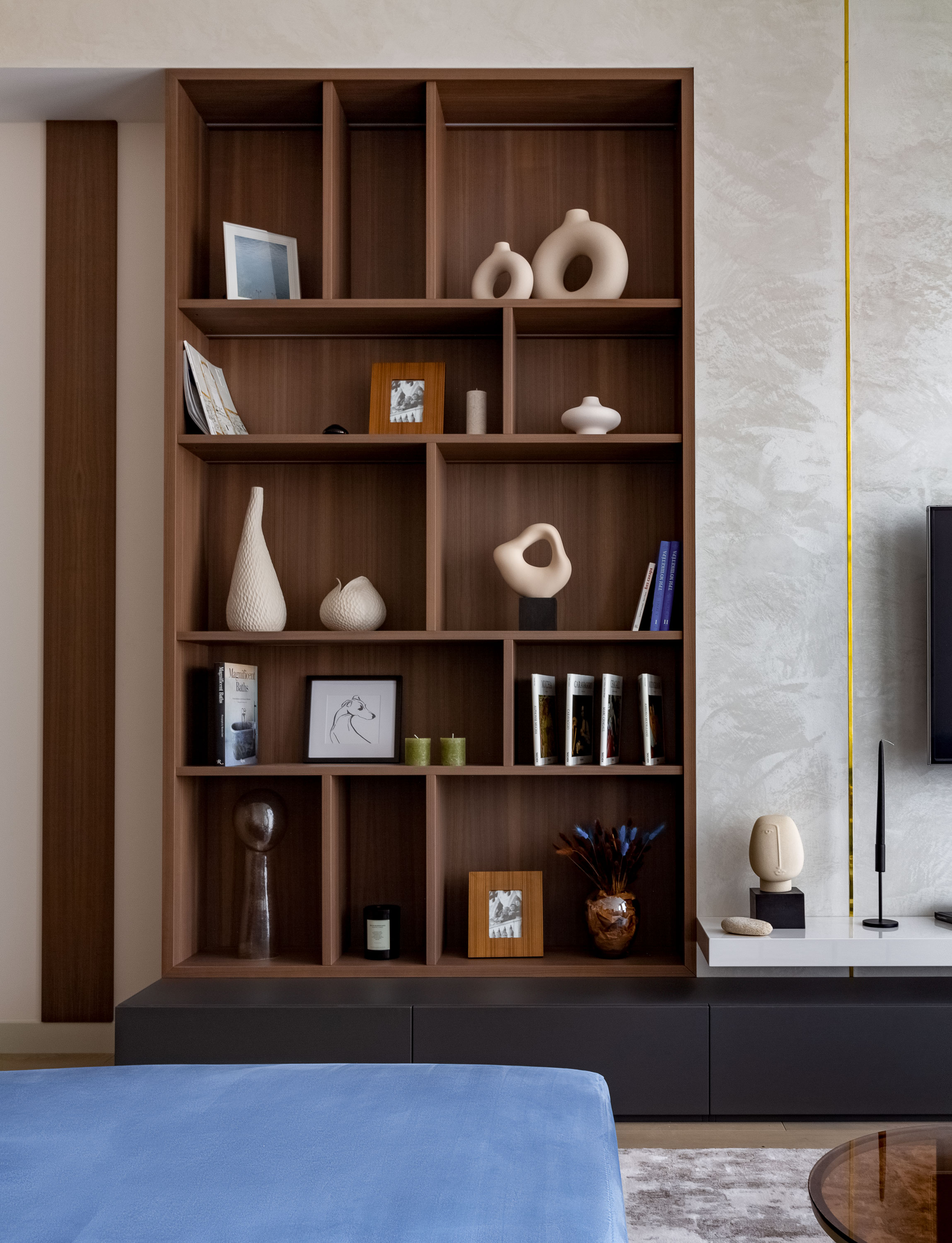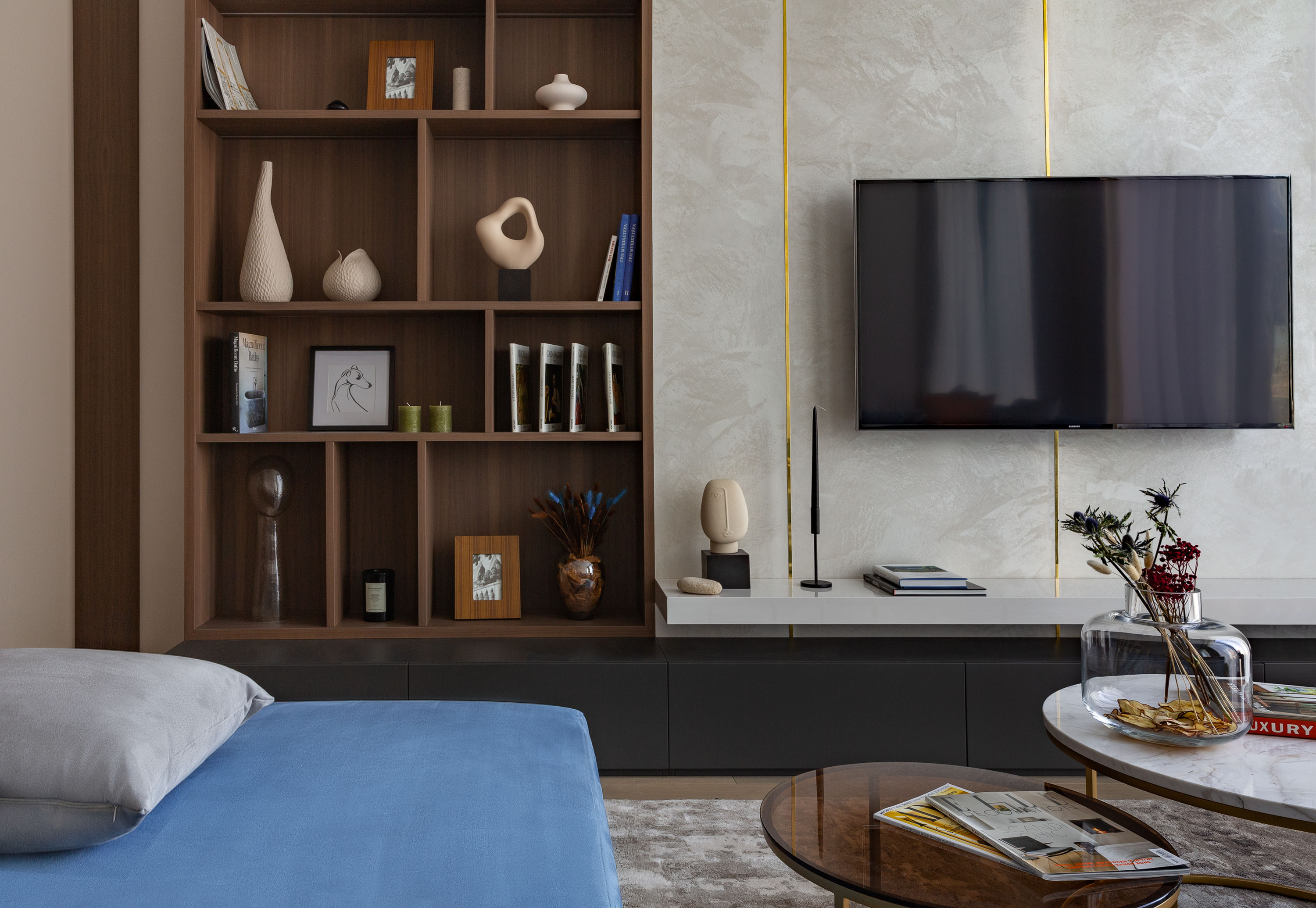 - Весь шпон в квартире выполнен из одного цвета, это американский орех. В зоне ТВ применили декоративную штукатурку с встроенными латунными профилями и меблировали эту зону: стеллаж из шпона с подсветкой, того же цвета напольная тумба в темно-серой матовой эмали, и полка бежевая в глянцевой эмали.