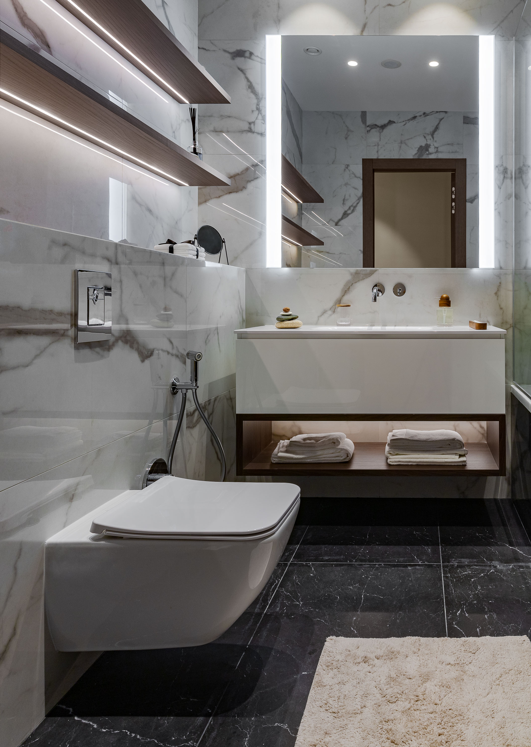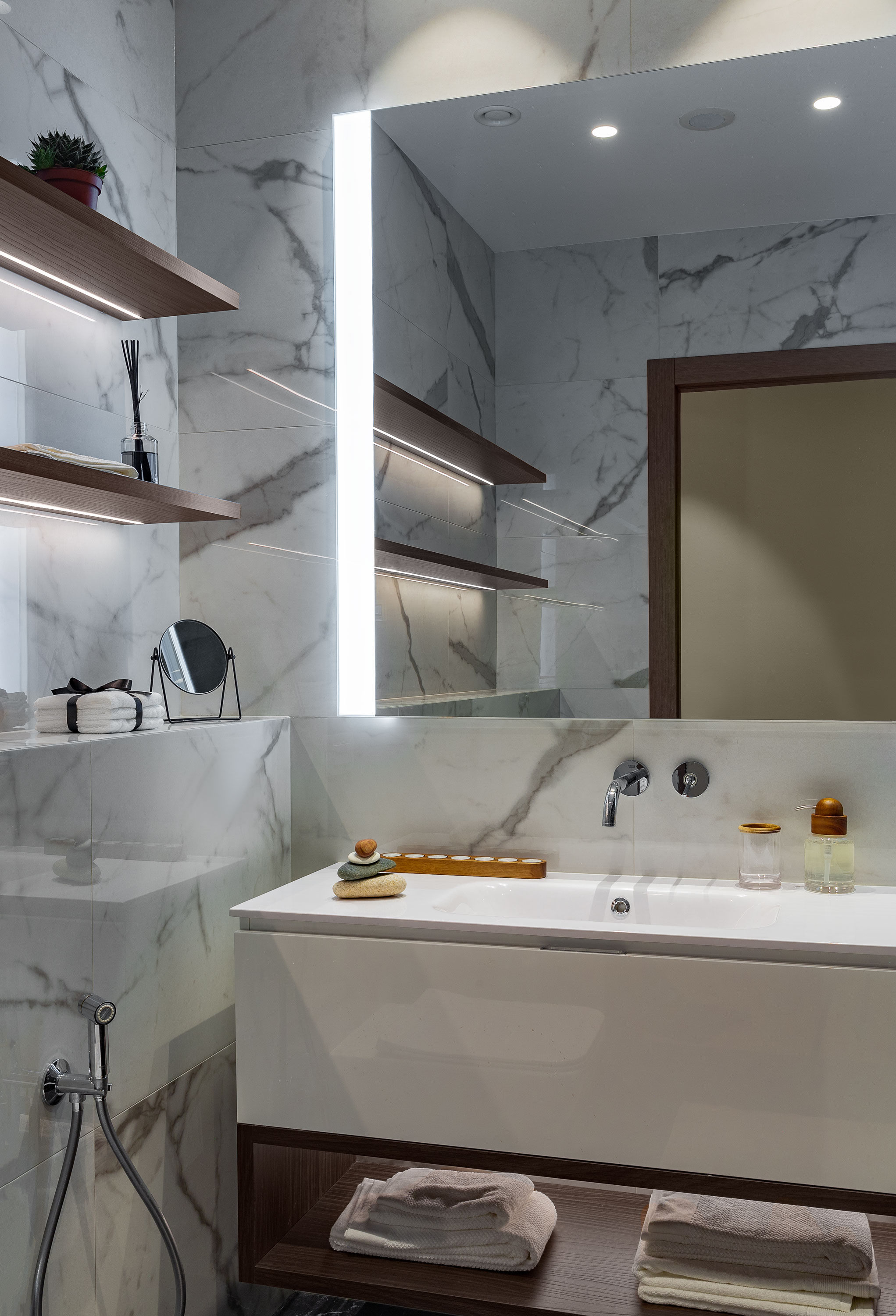 - В ней мы использовали сочетание фактуры и текстуры ореха, и добавили зеркальные вставки.