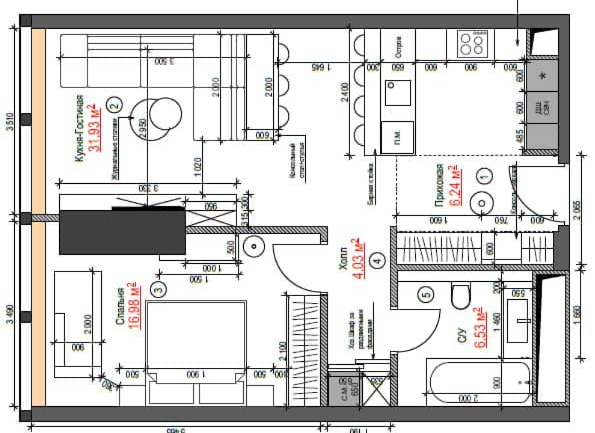 Площадь кухни гостиной 31 м2.