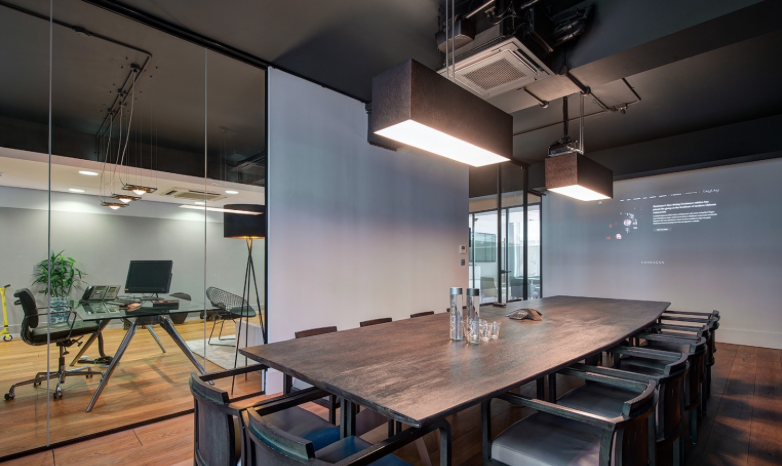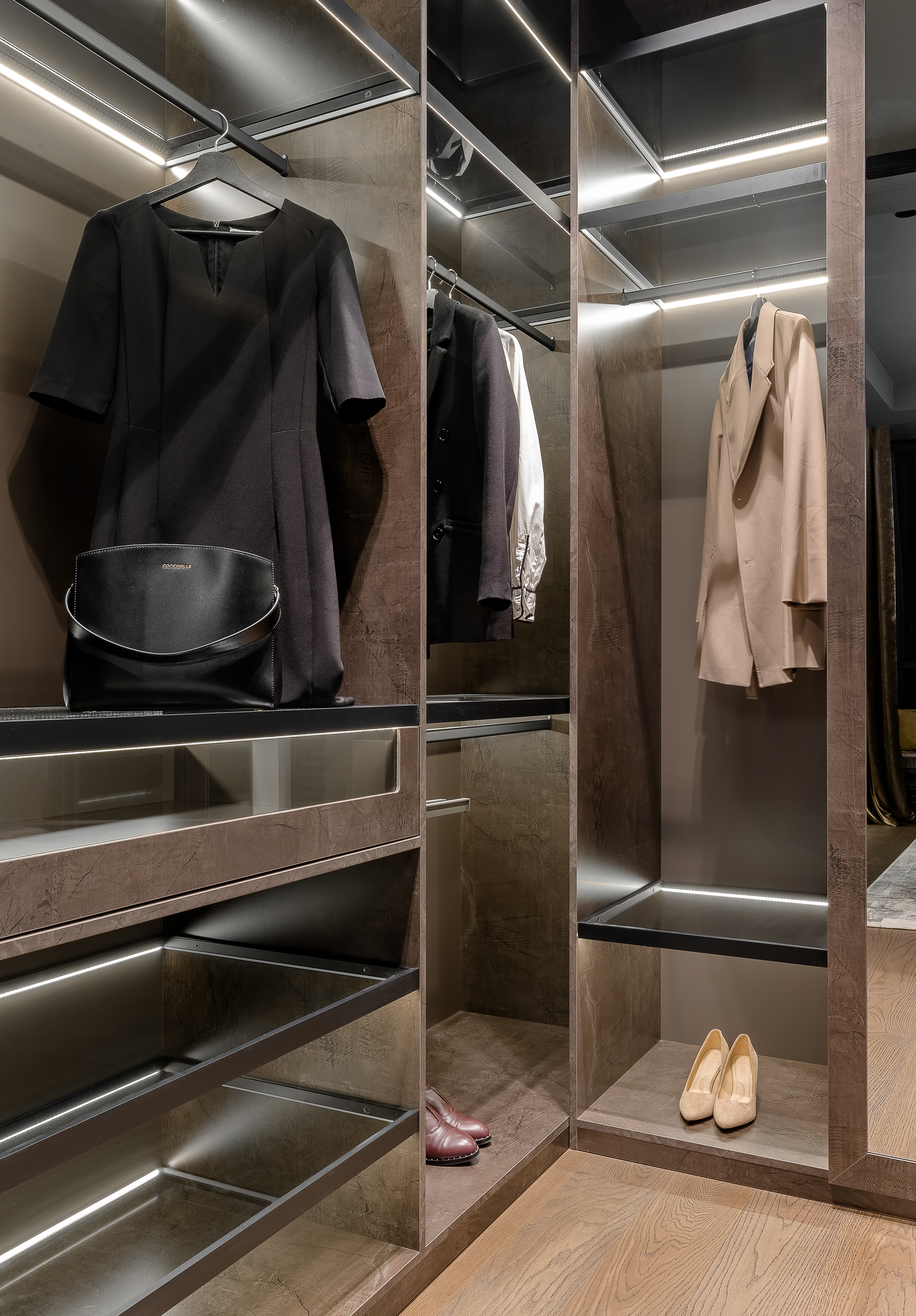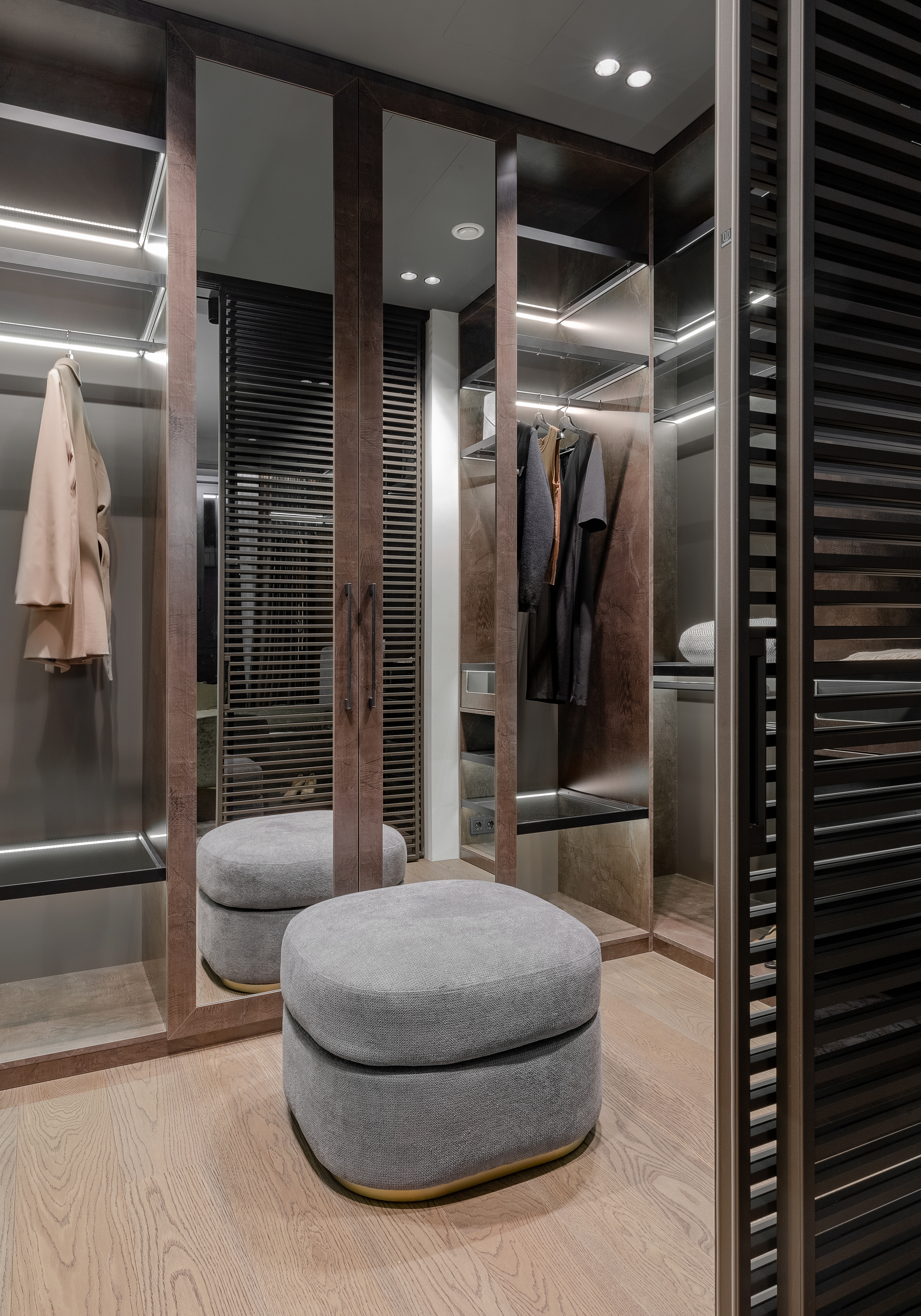 Из спальни мы попадаем в темный брутальный гардероб. Перегородки сделаны из тонированного стекла, Union.