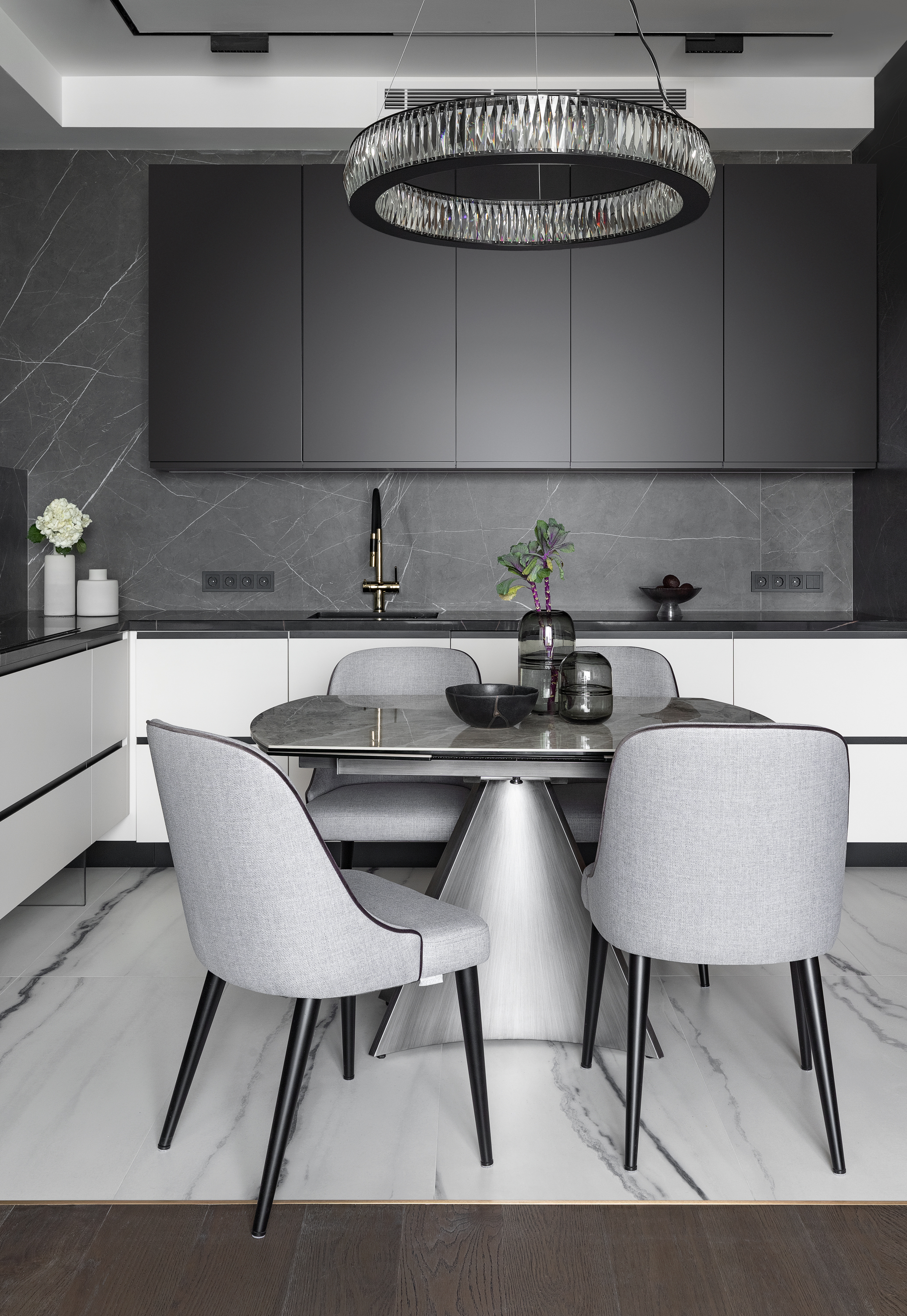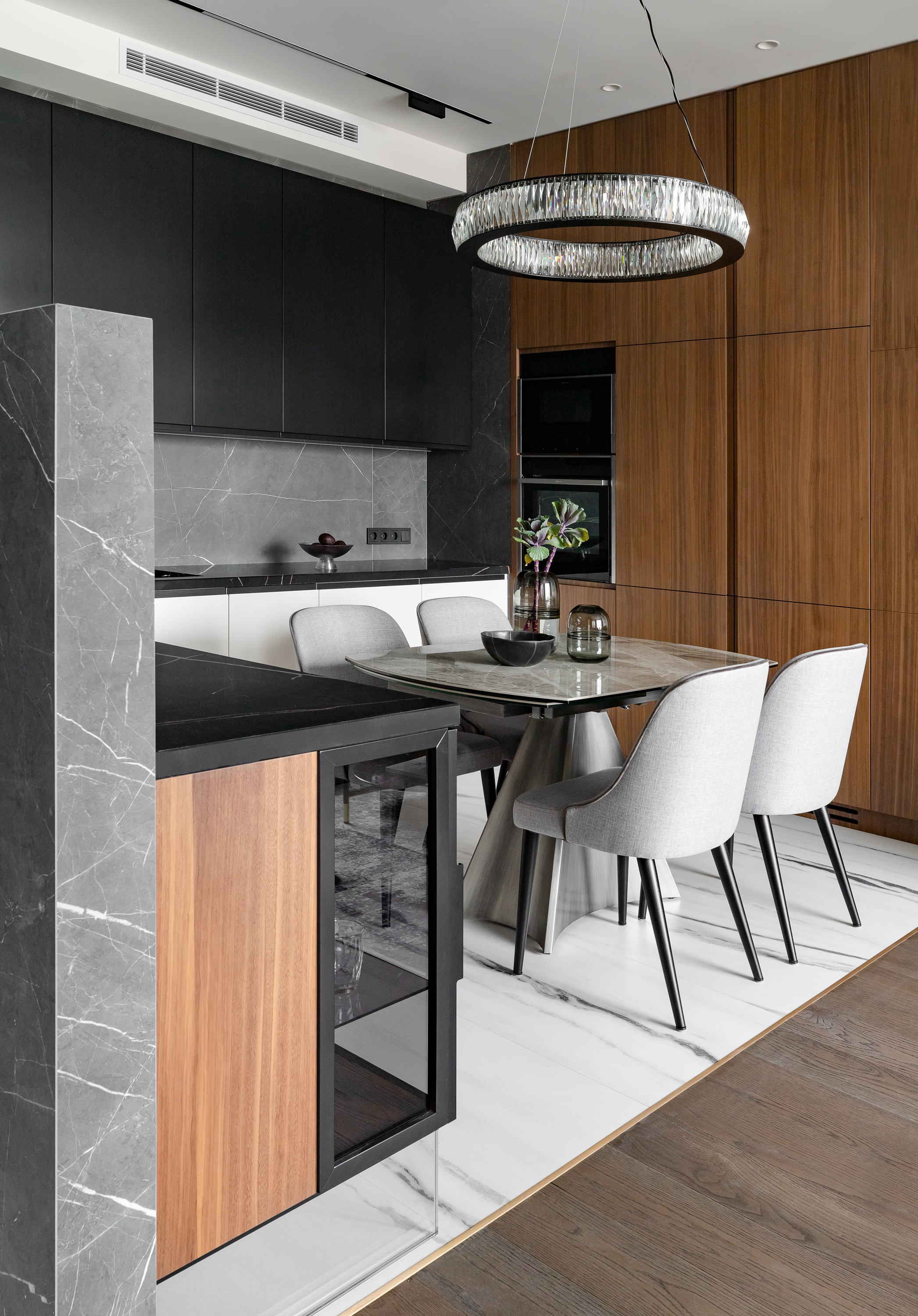 Выполнена в таком же стиле как и гостиная, современный брутальный интерьер сочитается с небольшими интеграциями классики, в виде молдингов, в виде классической текстуры и оттенка ореха, и освещение с претензией на современную классику.