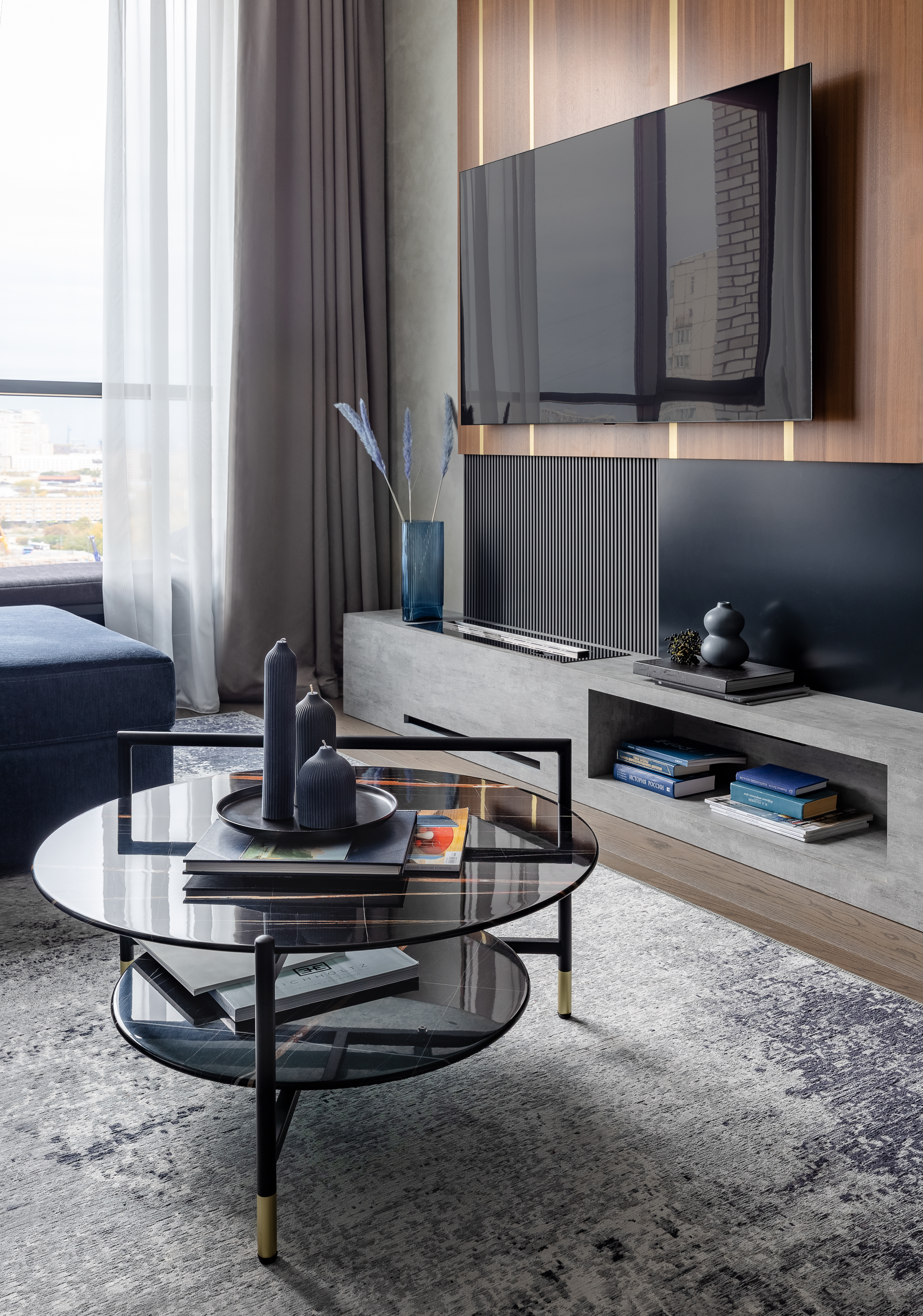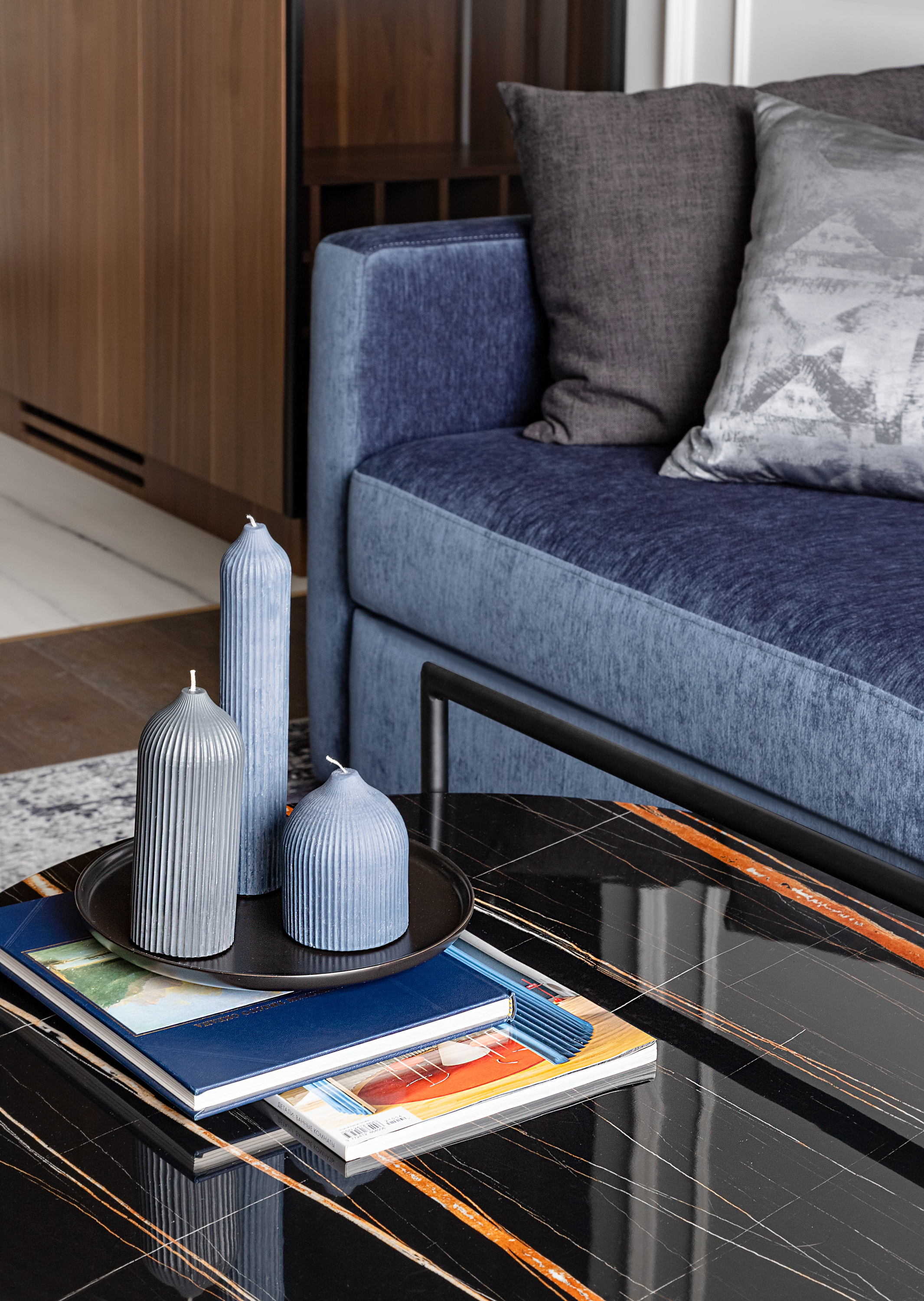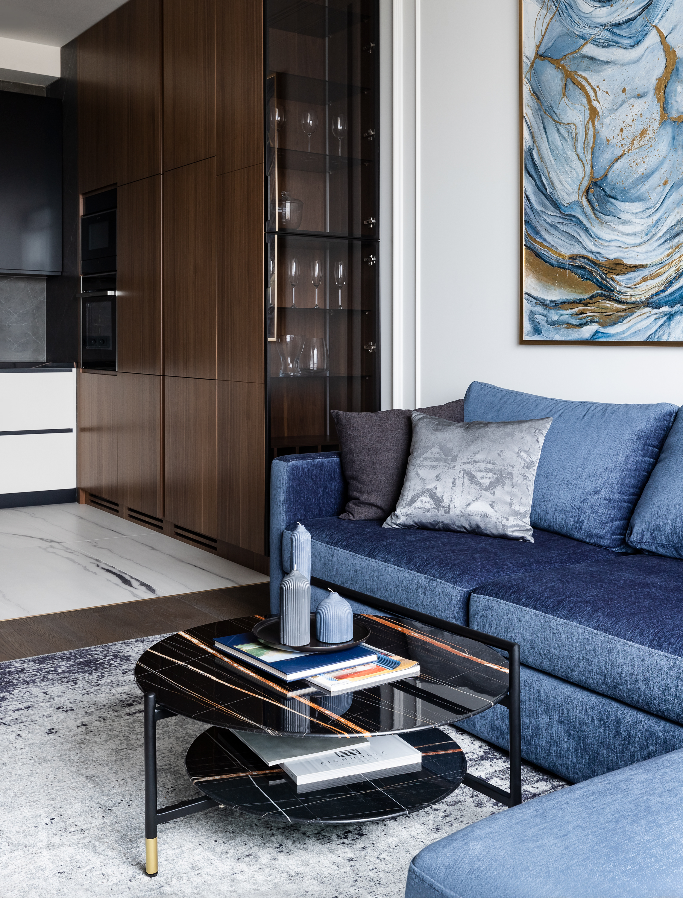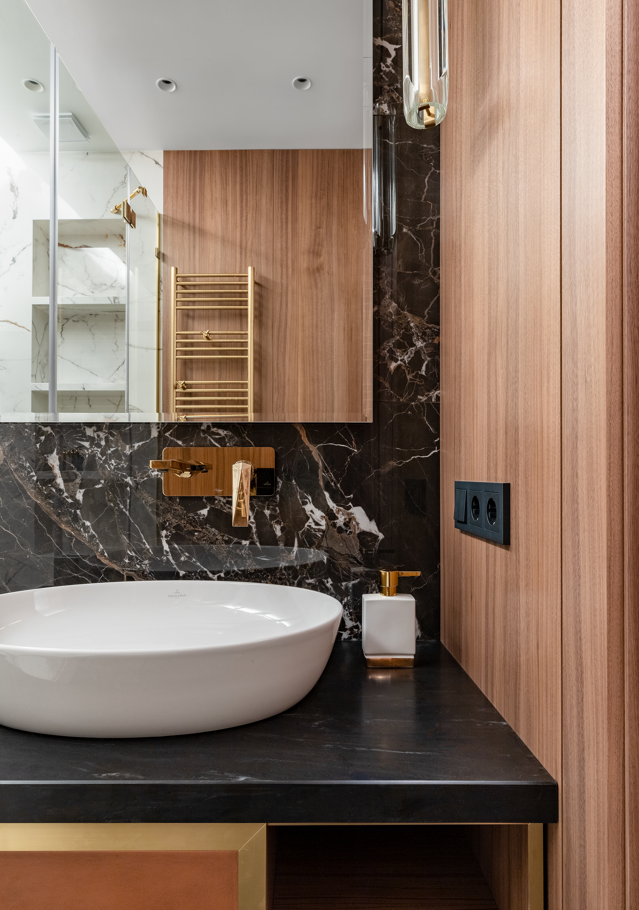 - Вся мебель выполнена на заказ, в отделке использован шпон ореха, единый для всей квартиры, и латунь.