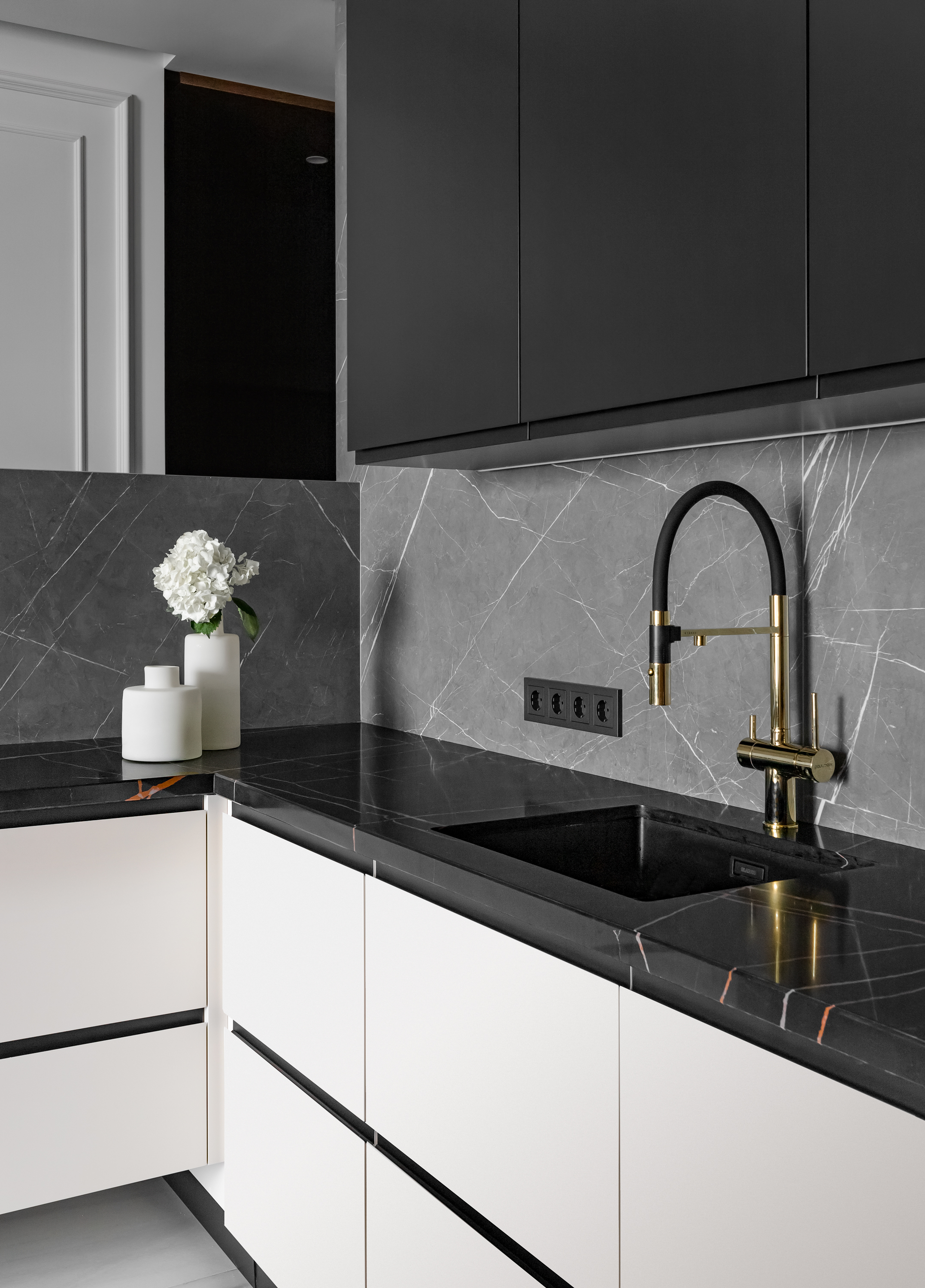 - Фартук кухни отделан крупноформатным керамогранитом.