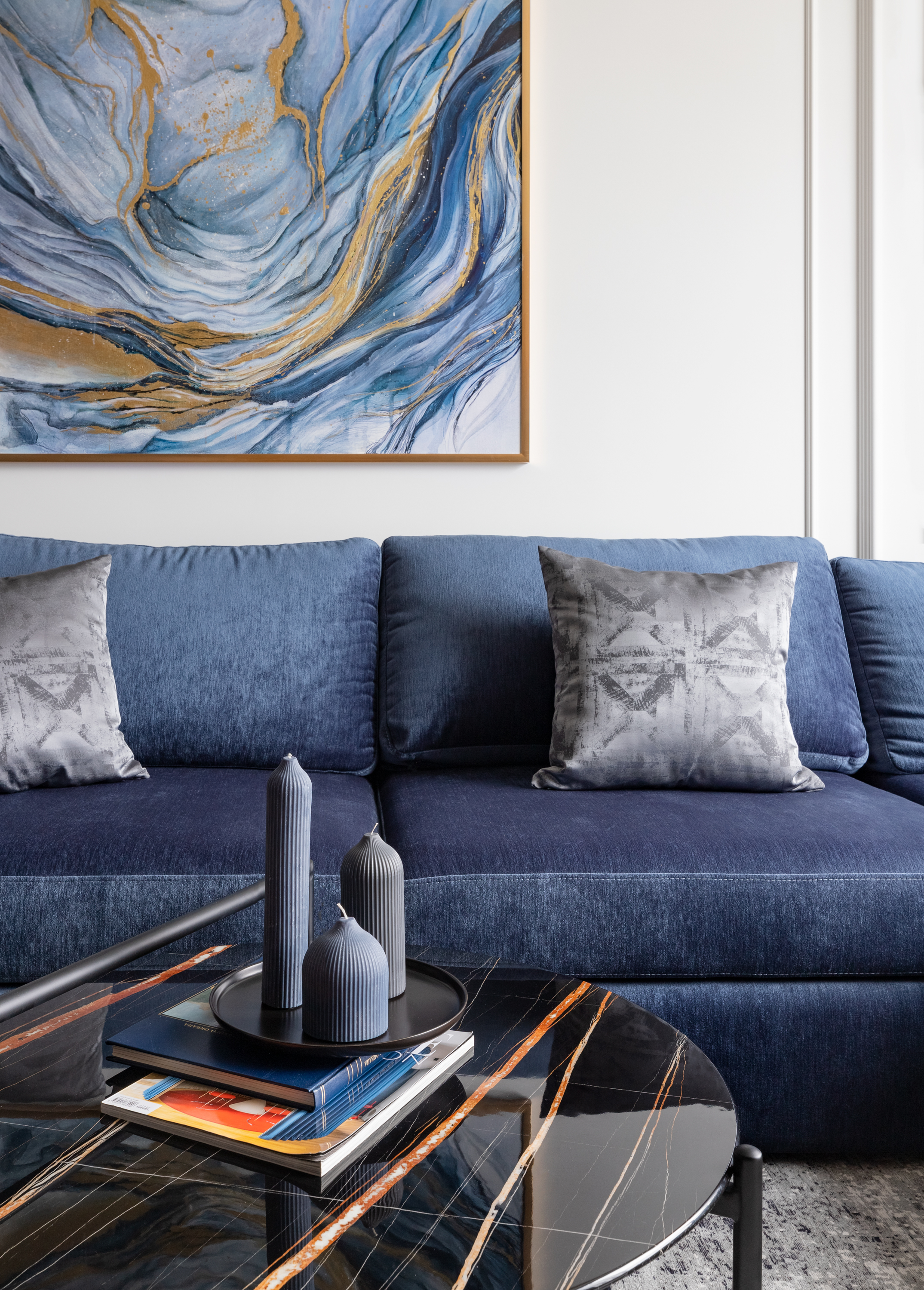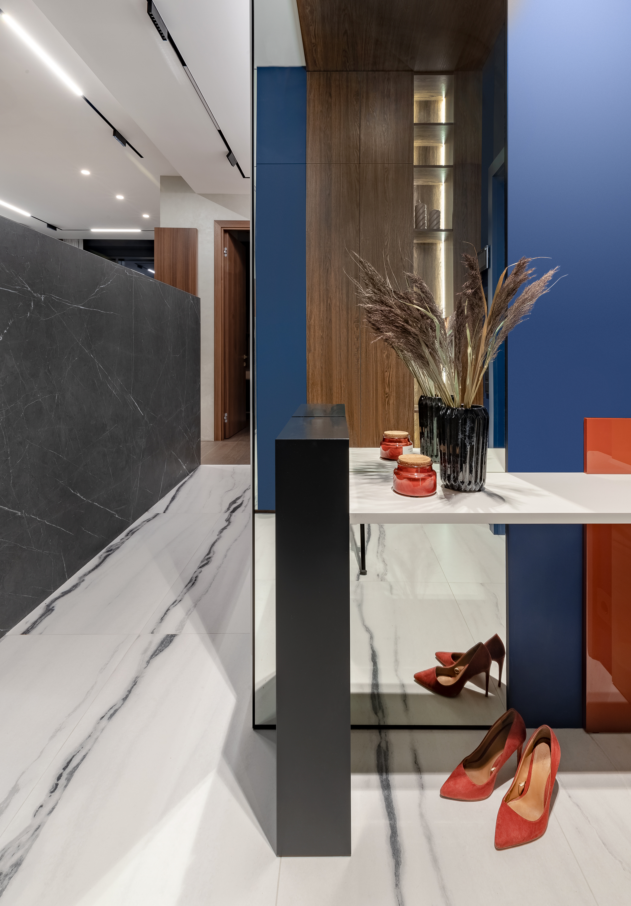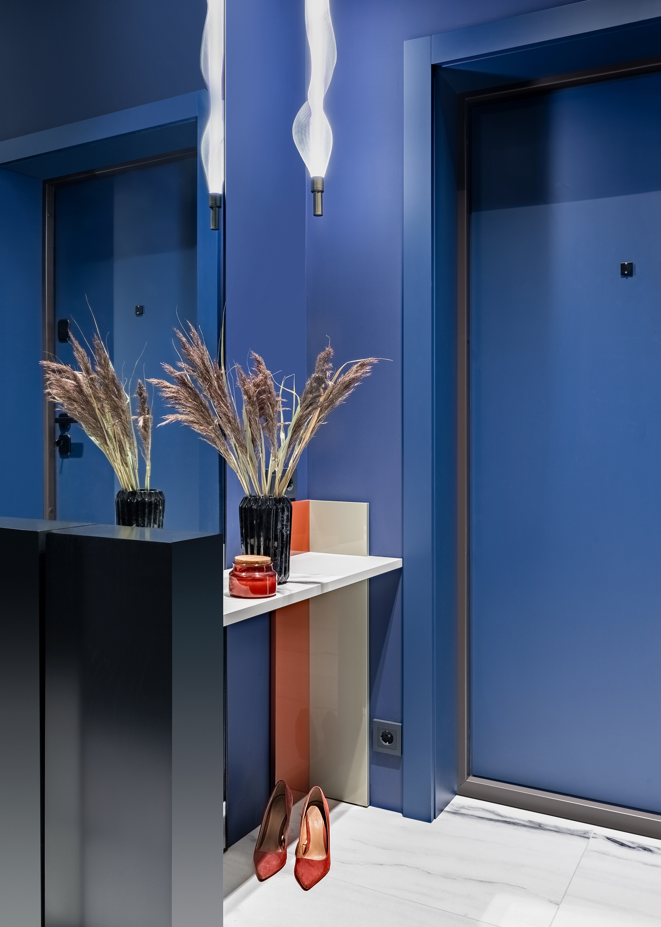 - Яркая прихожая синей акцентной стеной с порога заявляет о яркости проекта. Дверь мы интегрировали со стеной, заменили накладку двери нашей панелью в цвет панели вокруг двери.