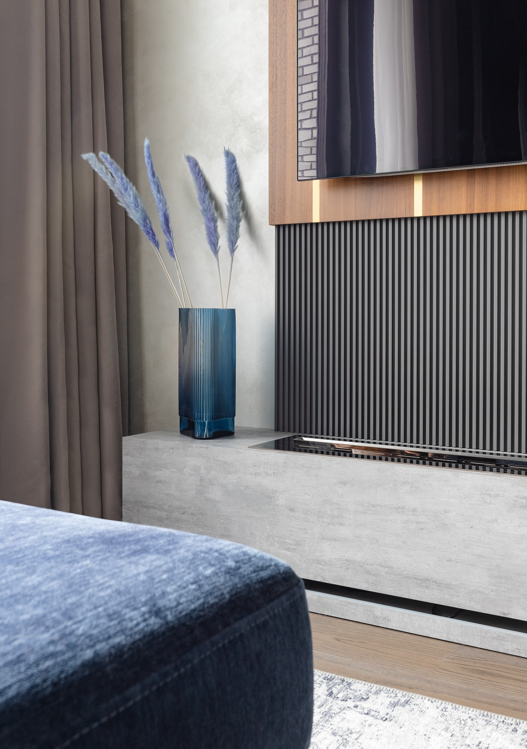 - В гостиной под телевизором мы расположили паровой камин, его интерная особенность в шикарном эффекте подсветки и схожестью с настоящим огнем, при этом не требует каких то сложных эксплуатационных элементов, он работает на воде, и не греет все предметы вокруг.