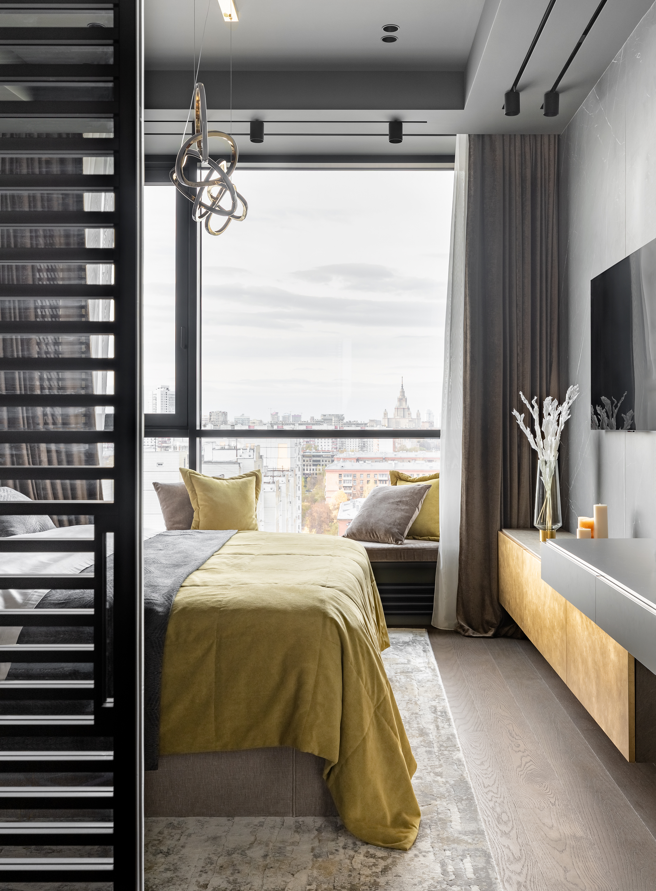 Потолок окрашен в темно серый цвет и в данном случае этот прием, визуально расширил помещение, при этом в вечернее время спальня очень уютная и камерная.