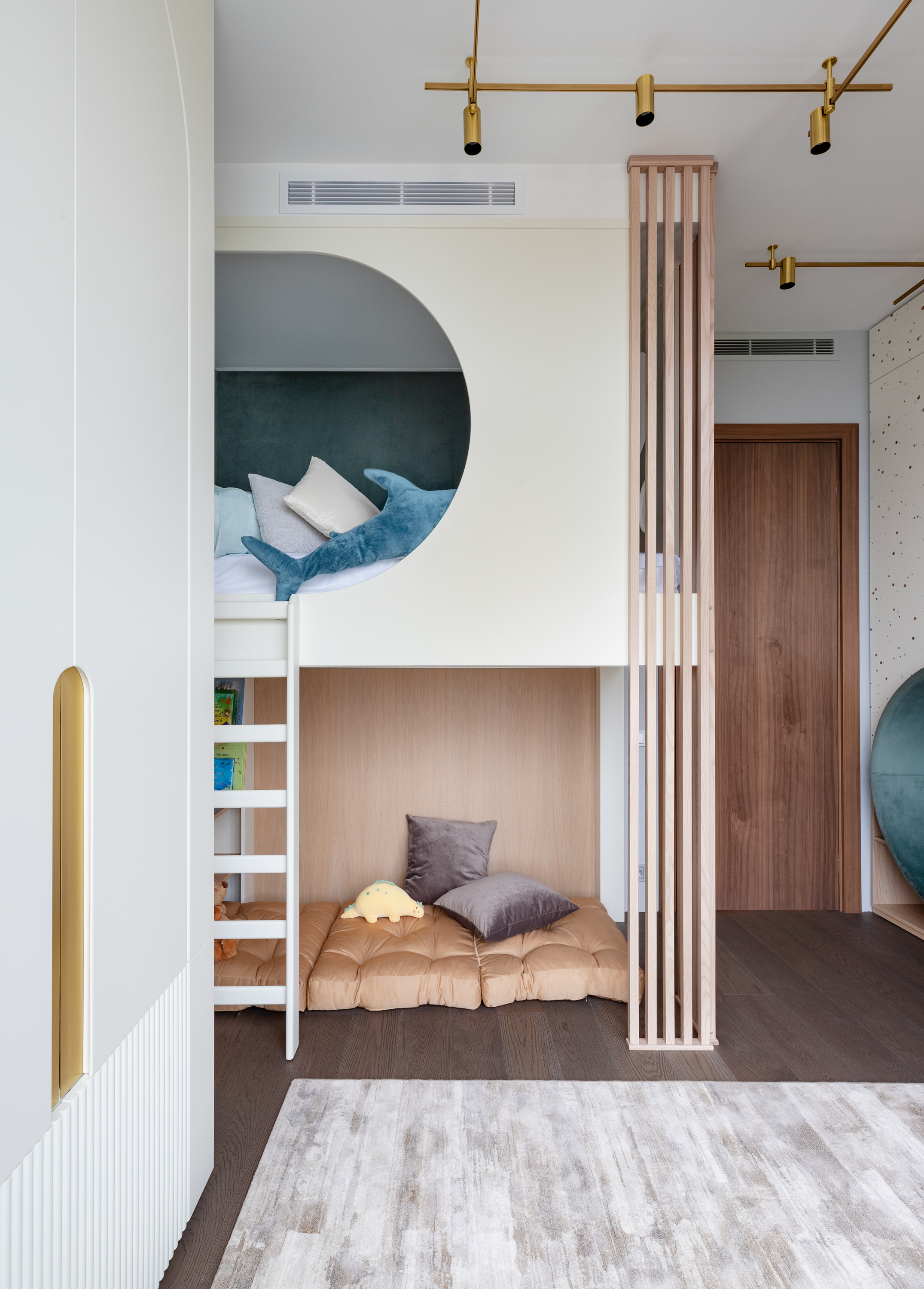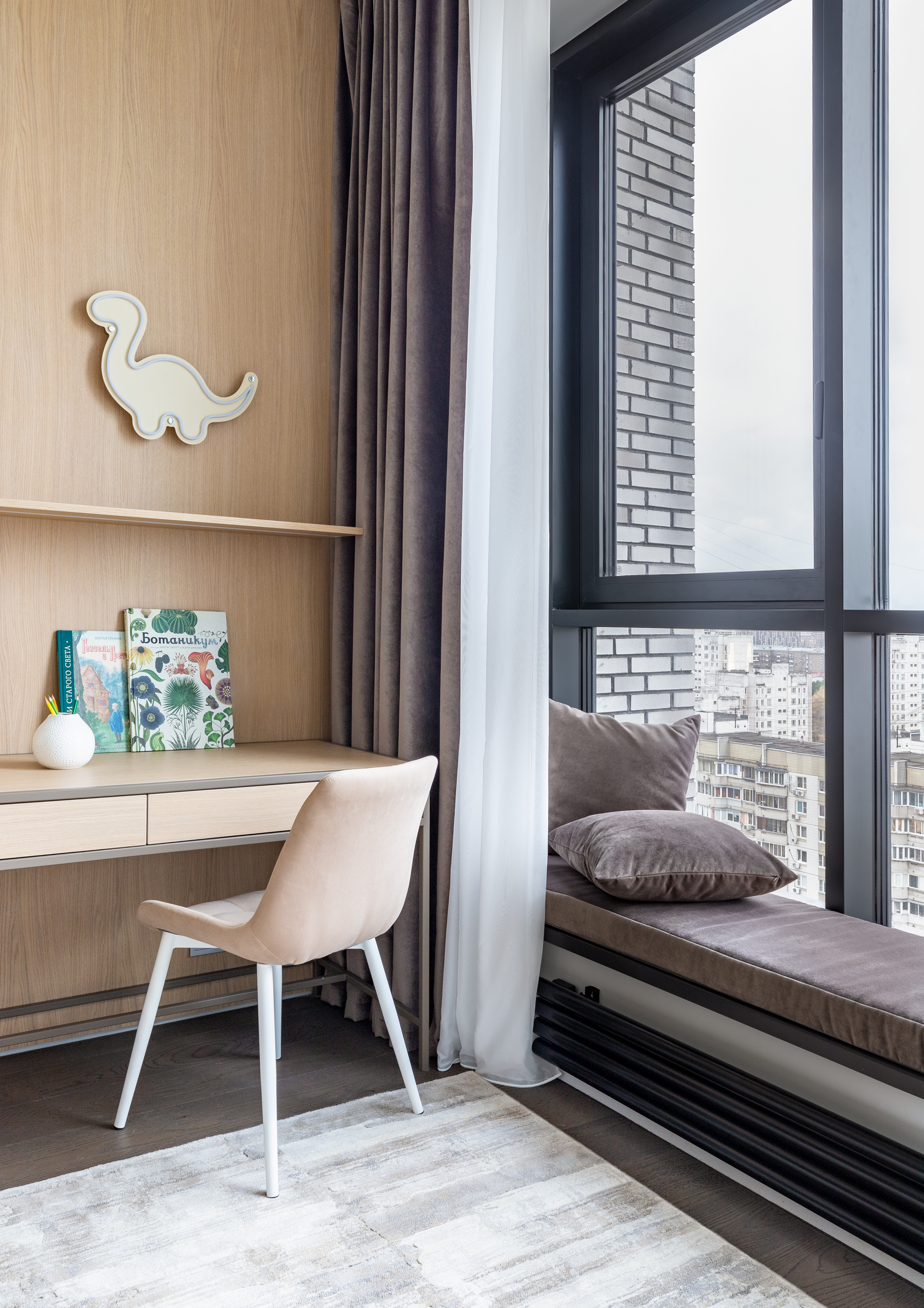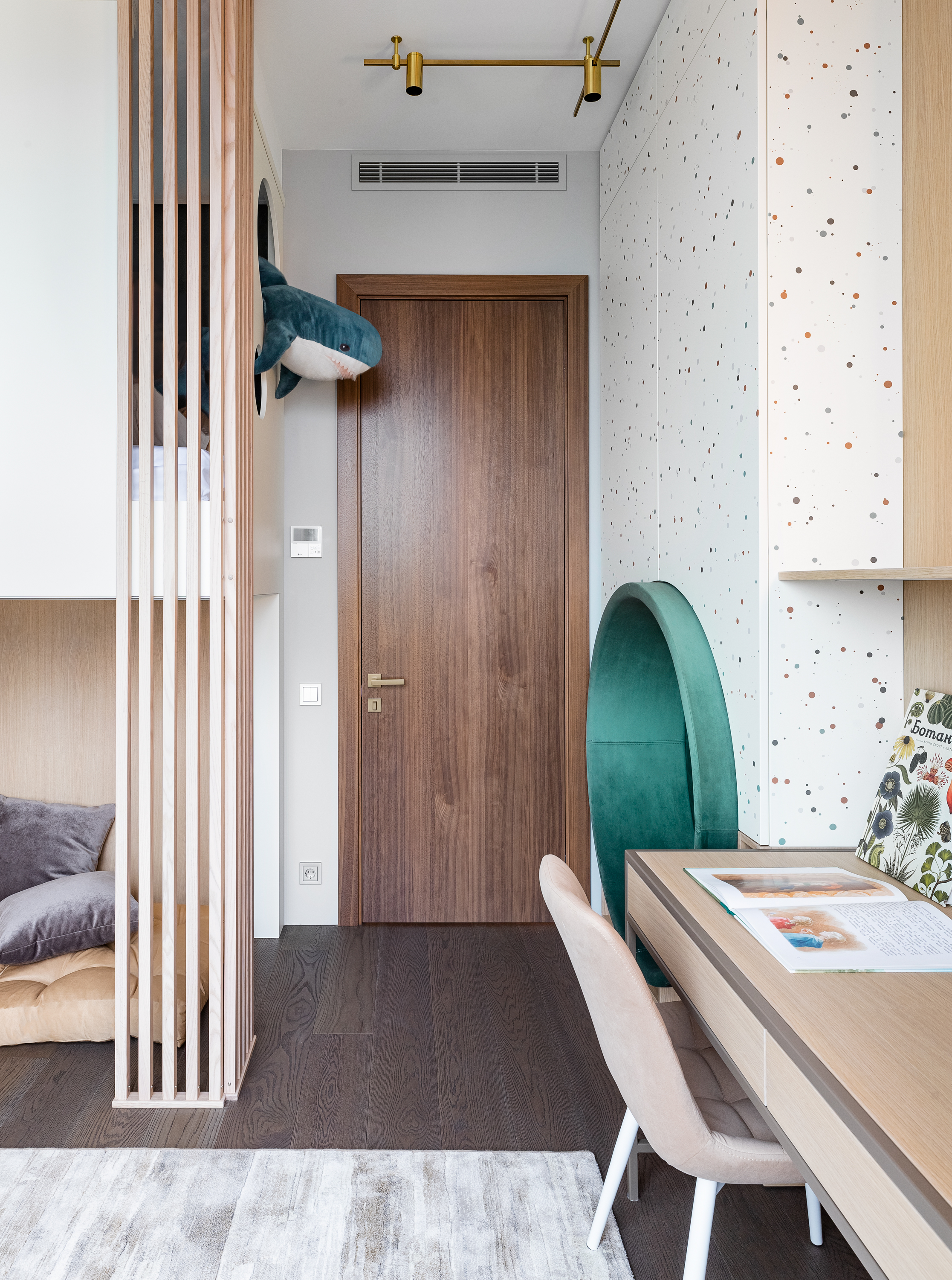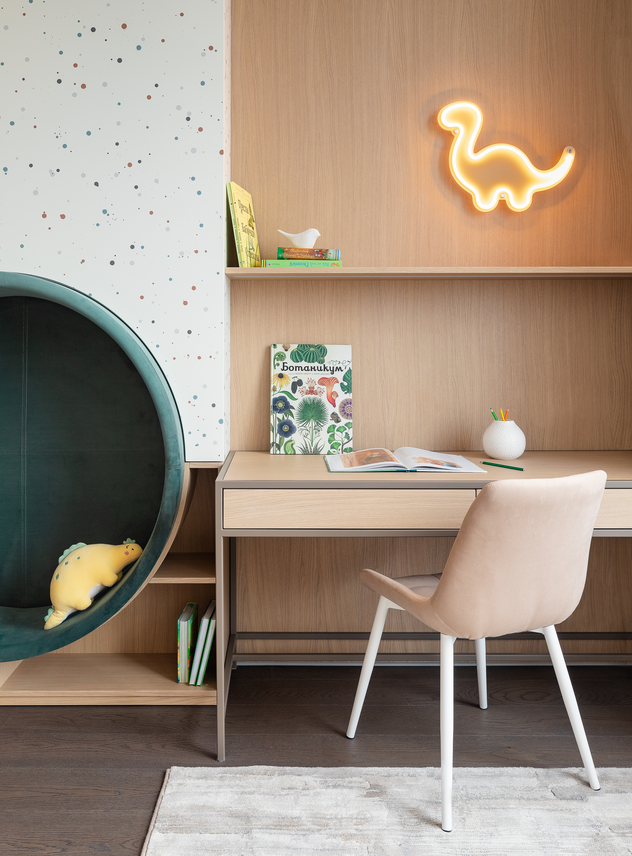 - Вторая более юная детская комната, с мягкими пастельными оттенками и динозавриками))