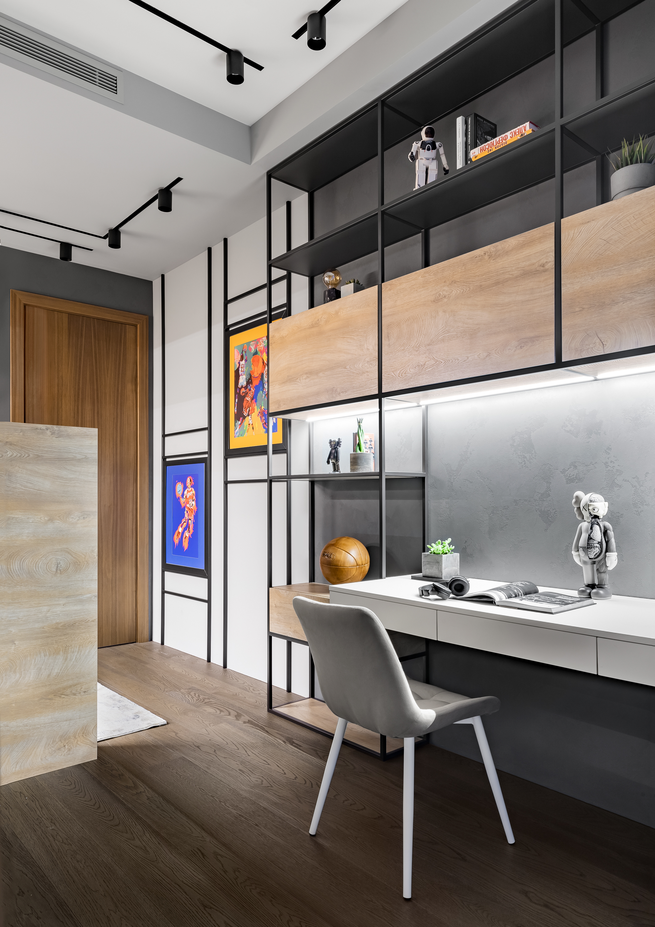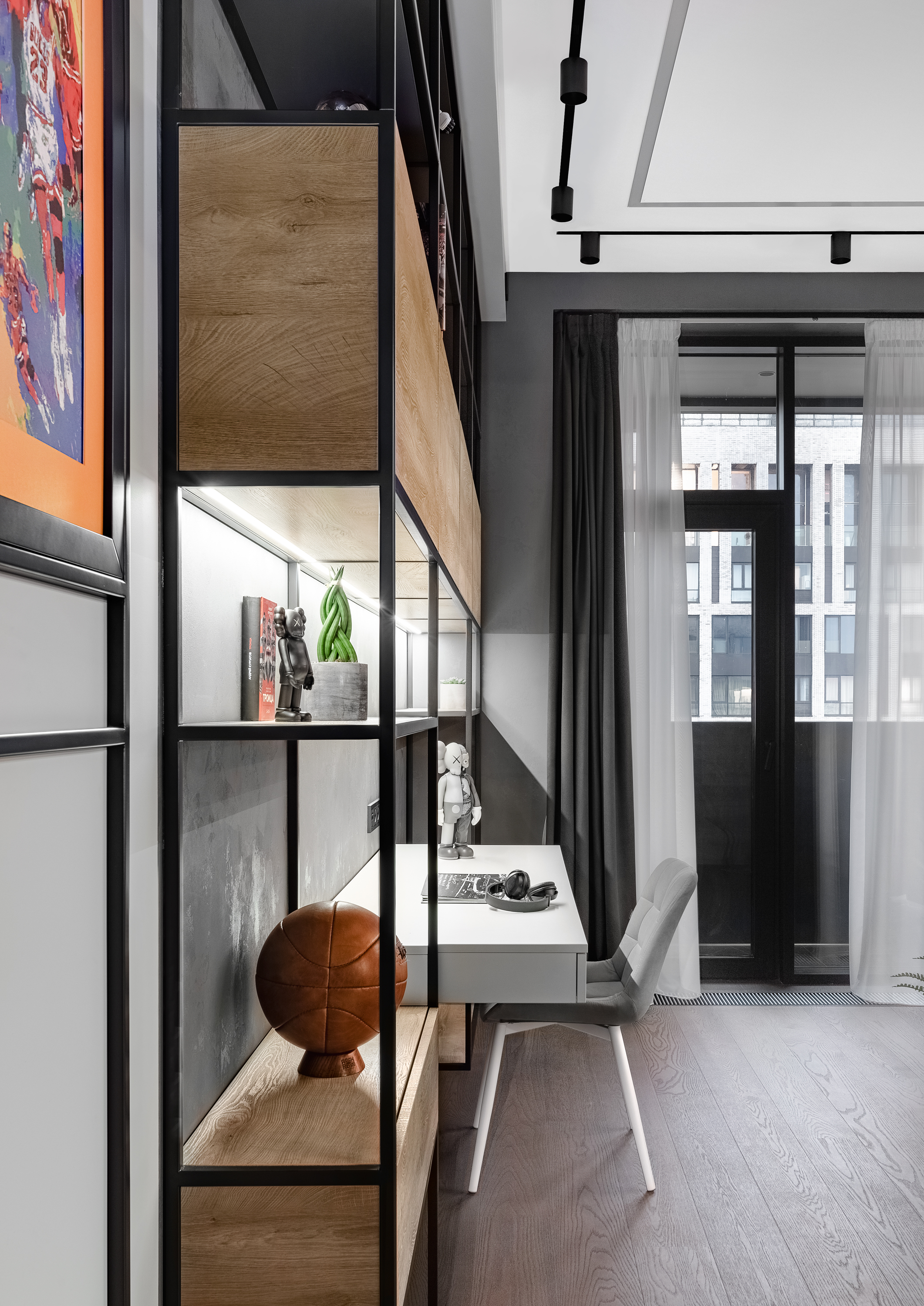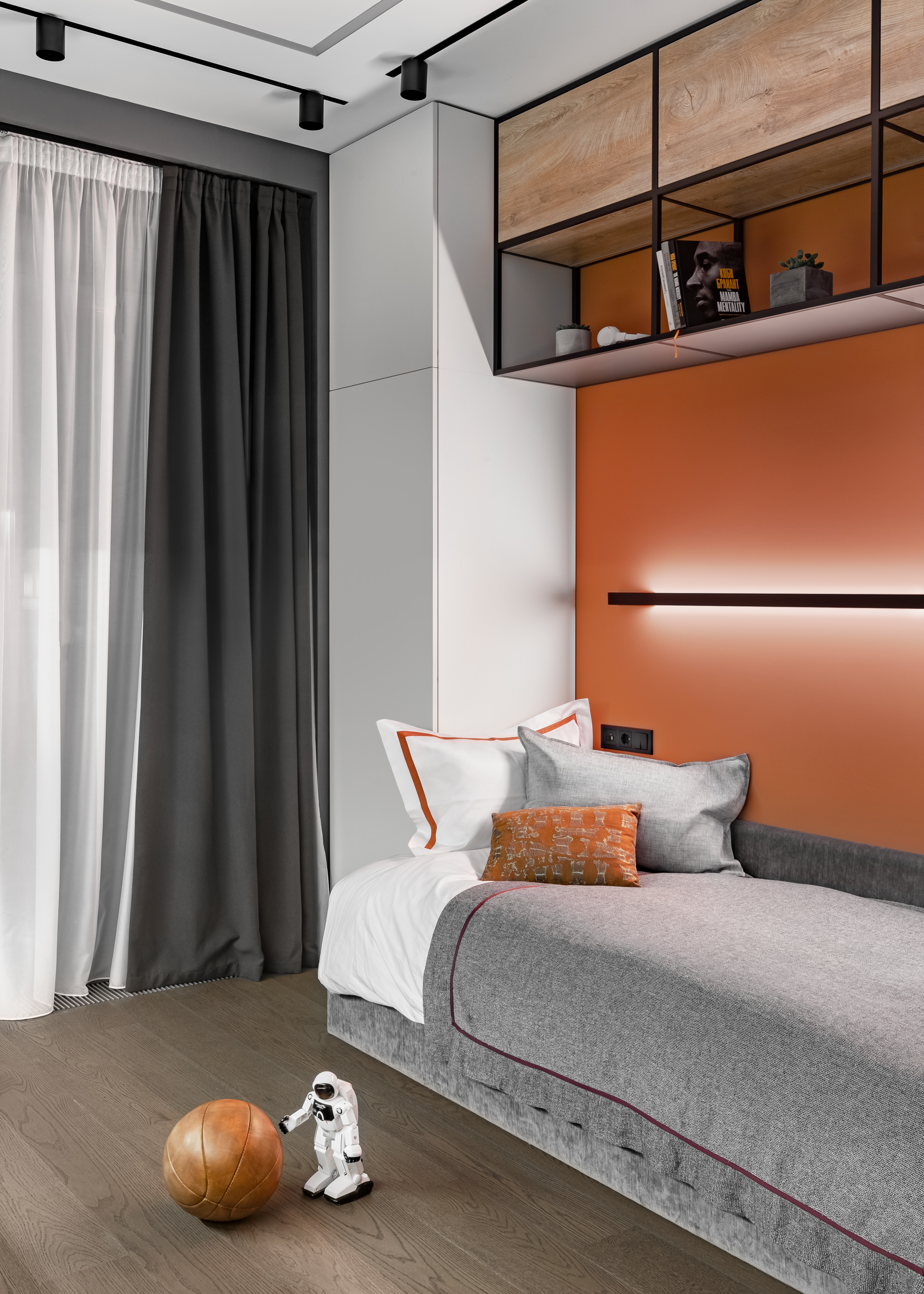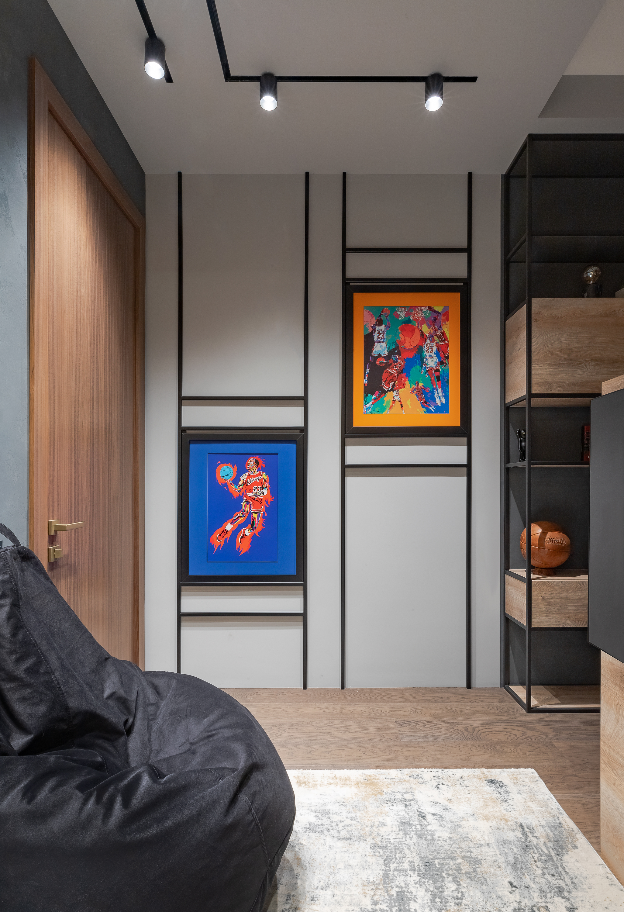 - Две детские выполнены в разных цветовых решениях, одна более взрослая и брутальная, с элементами из лофта, баскетбольной тематикой, зоной с игровой консолью, яркими акцентами и явно подростковым характером.