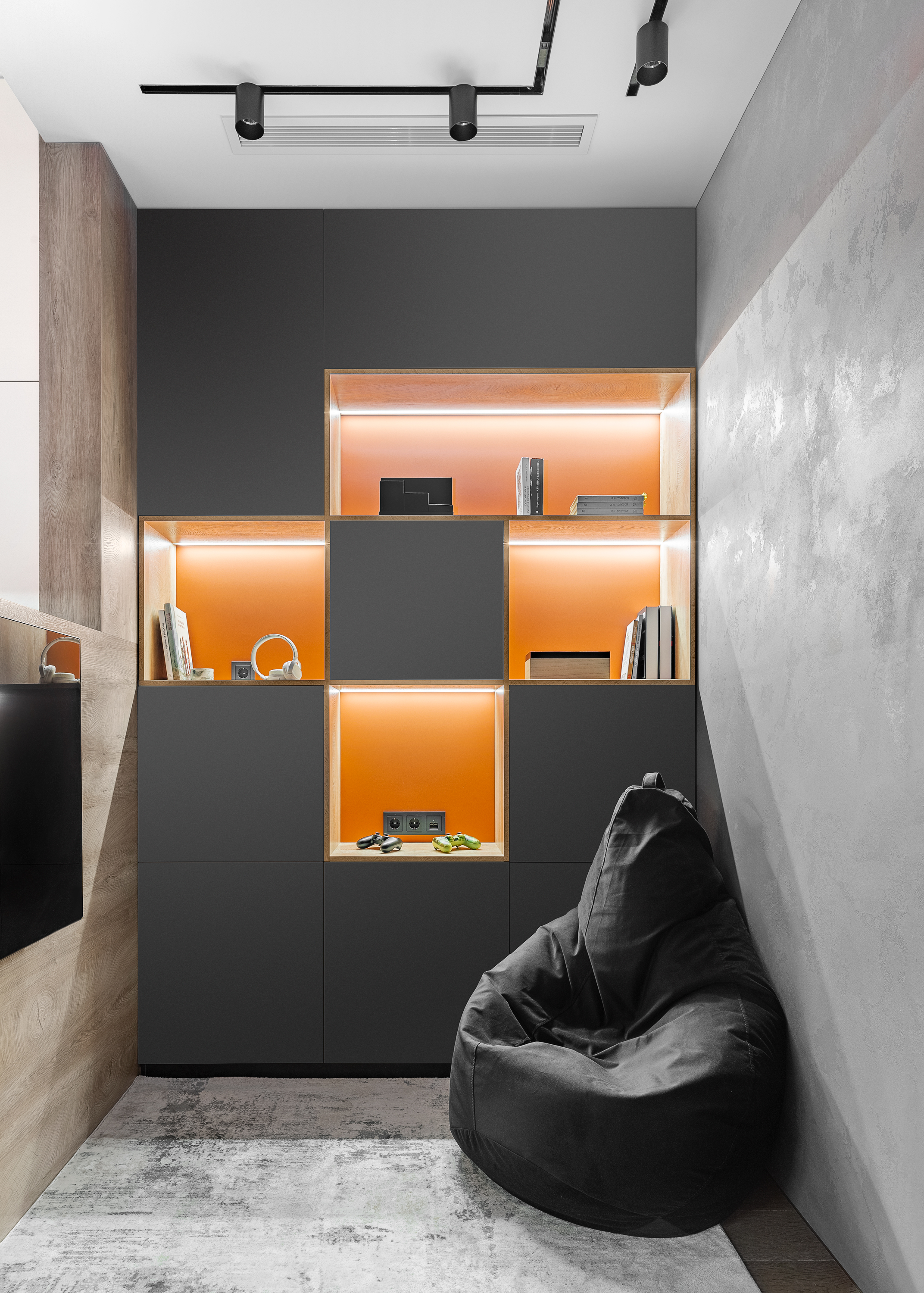 Напротик кровати мы зонировали стену на 2 части: зона ТВ и будуарная зона с минималистичной подвесной консолью.