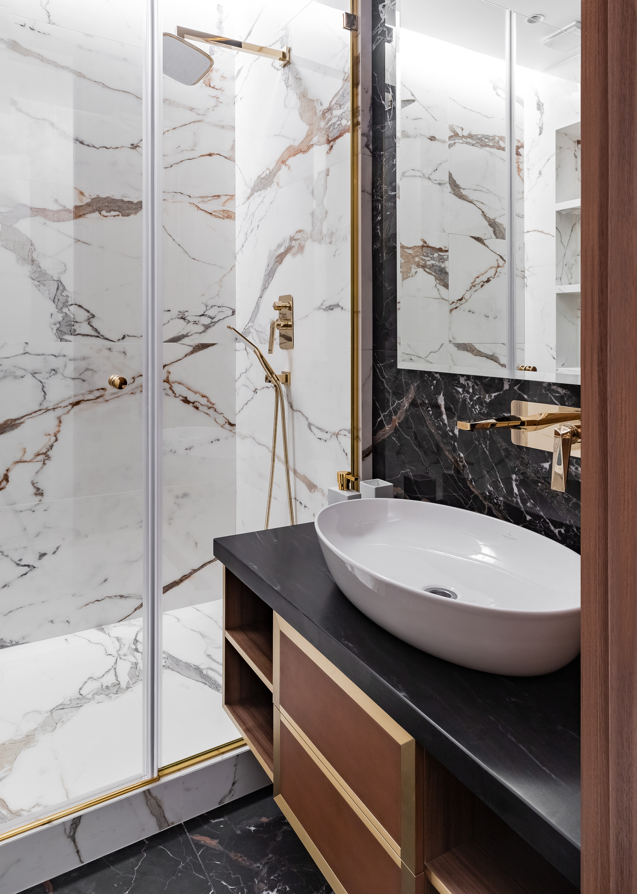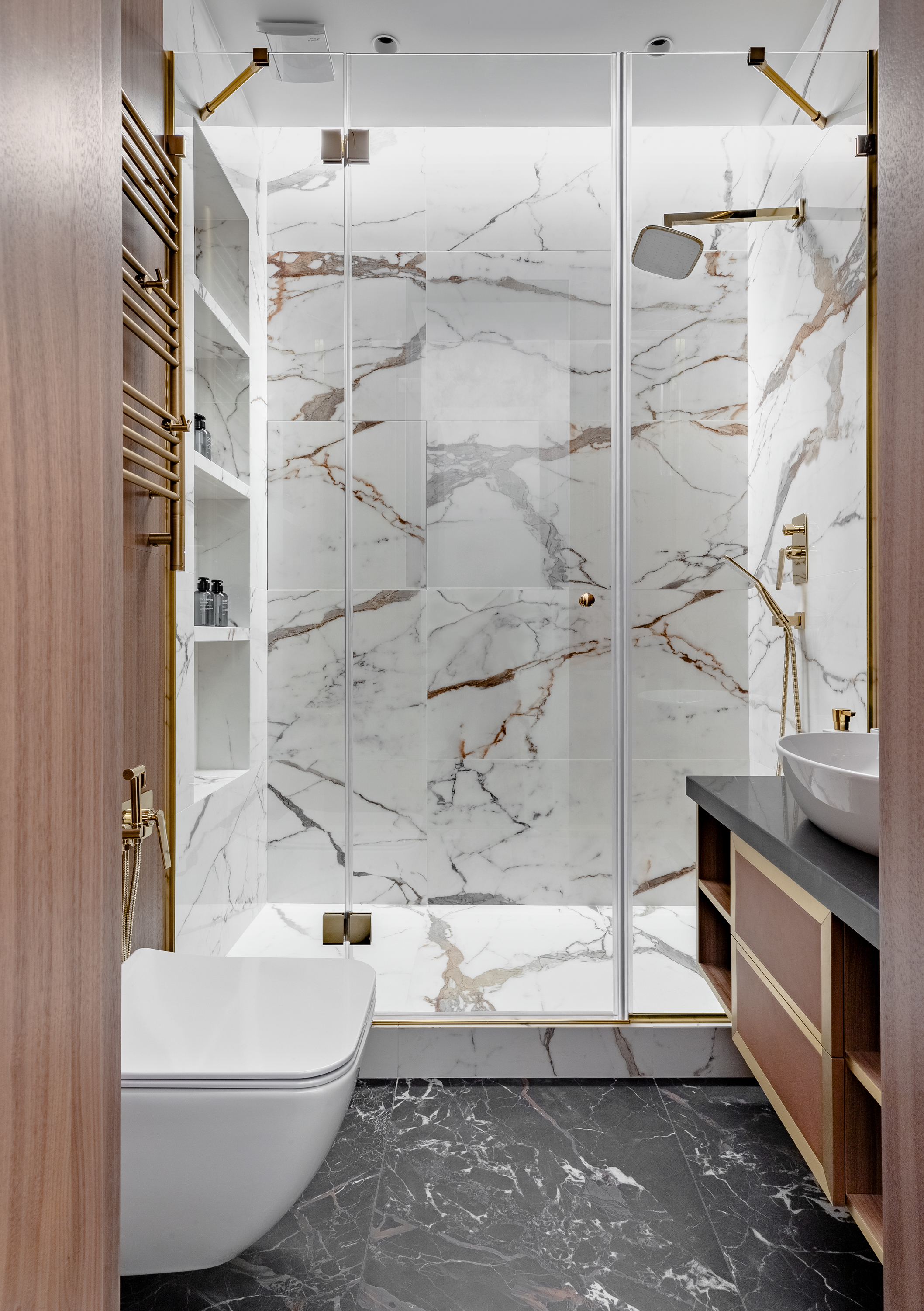 - В санузлах использовали крупноформатный керамогранит, большое внимание уделили подбору золотой сантехники и фурнитруы.