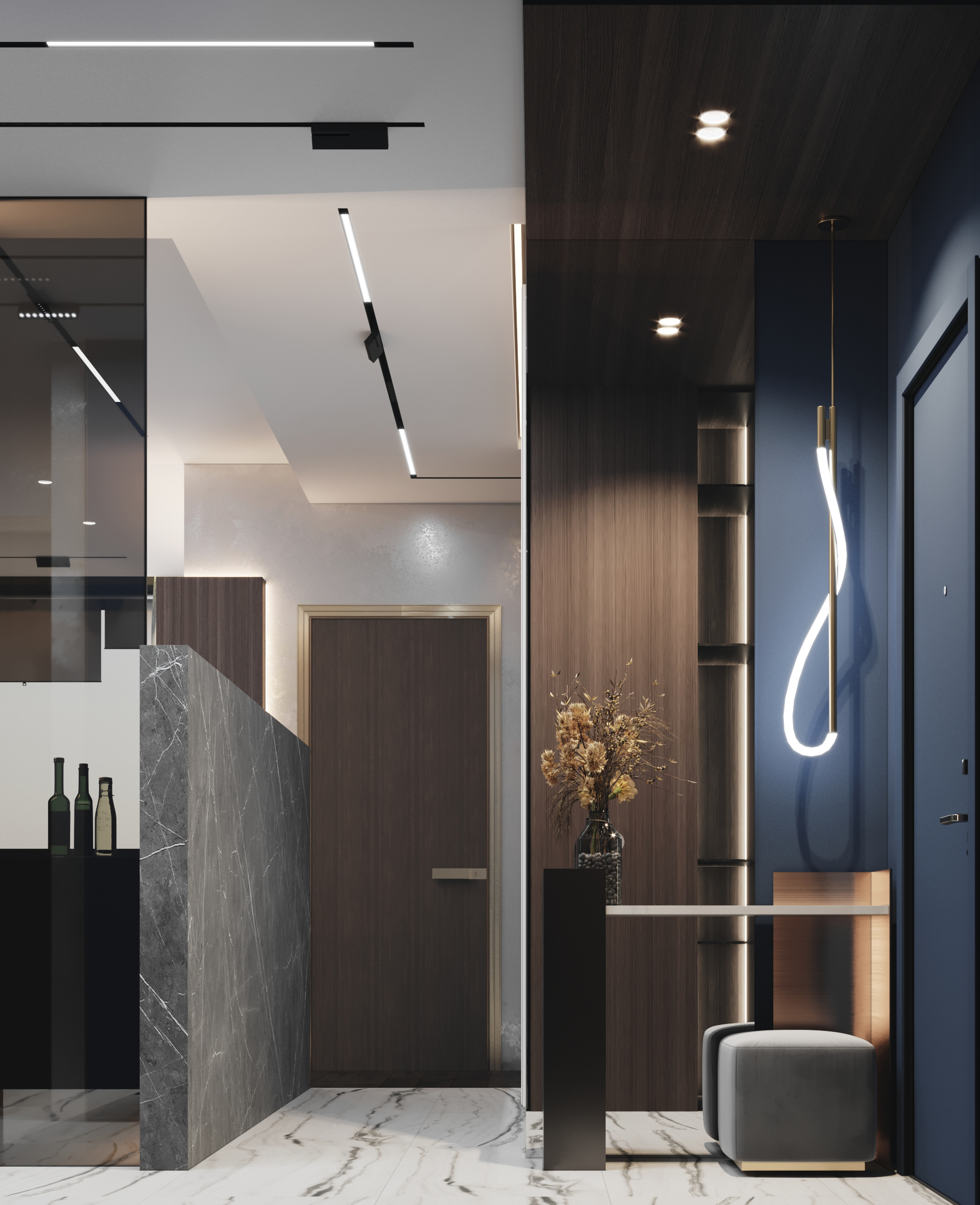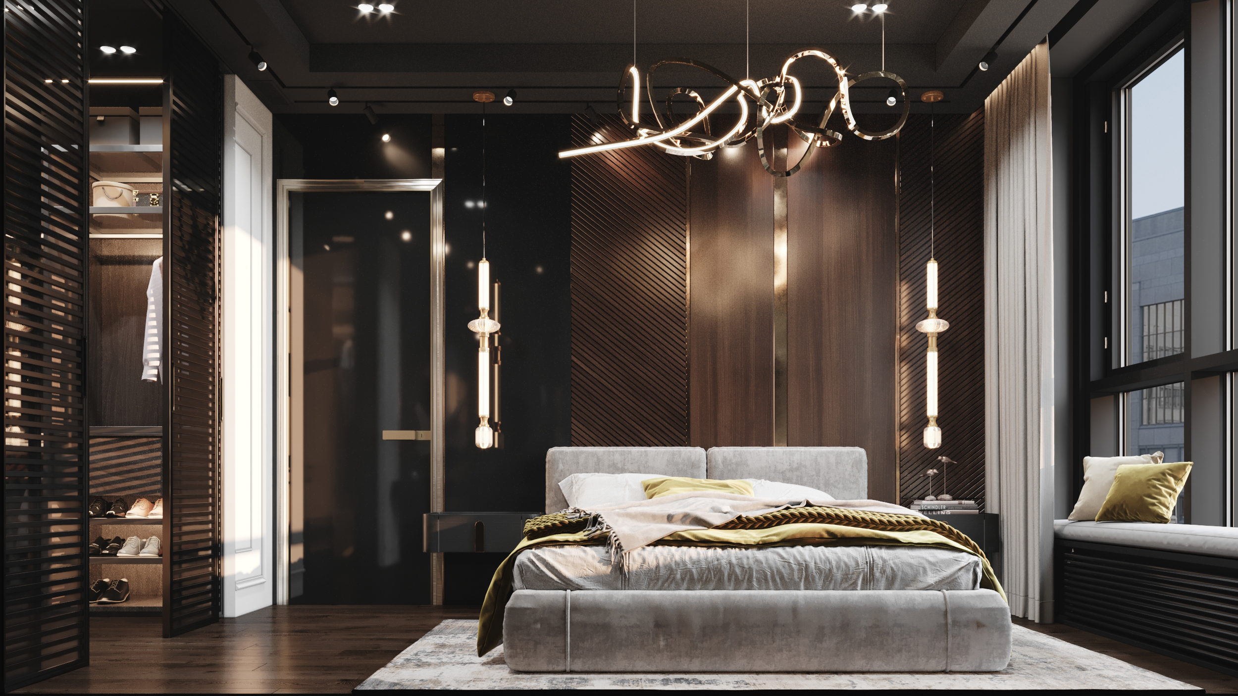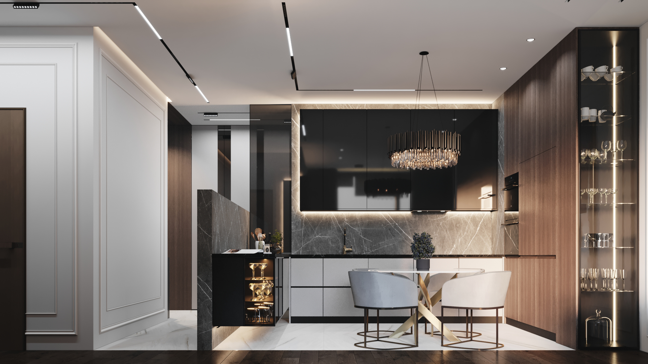 Выполнена в таком же стиле как и гостиная, современный брутальный интерьер сочитается с небольшими интеграциями классики, в виде молдингов, в виде классической текстуры и оттенка ореха, и освещение с претензией на современную классику.