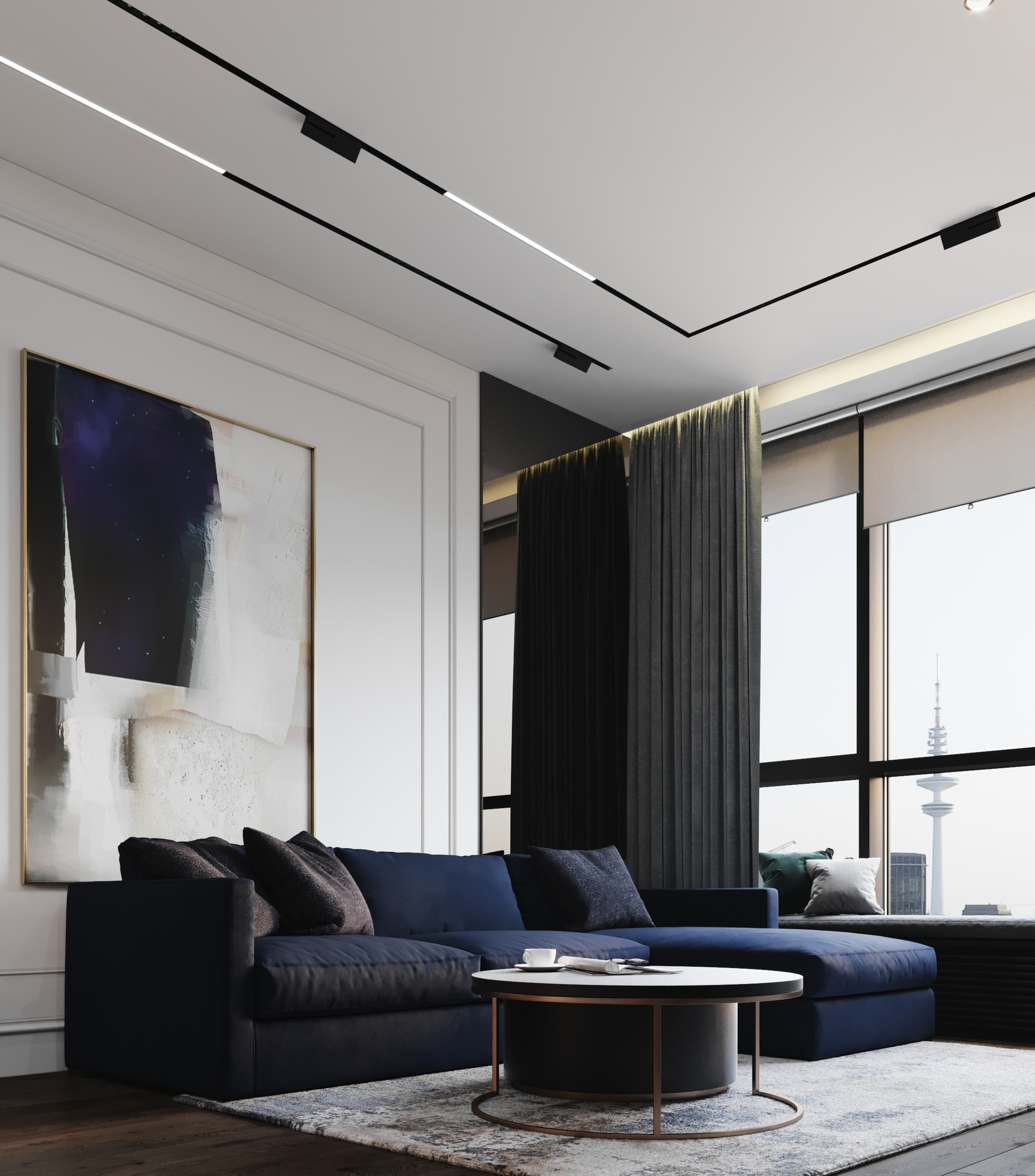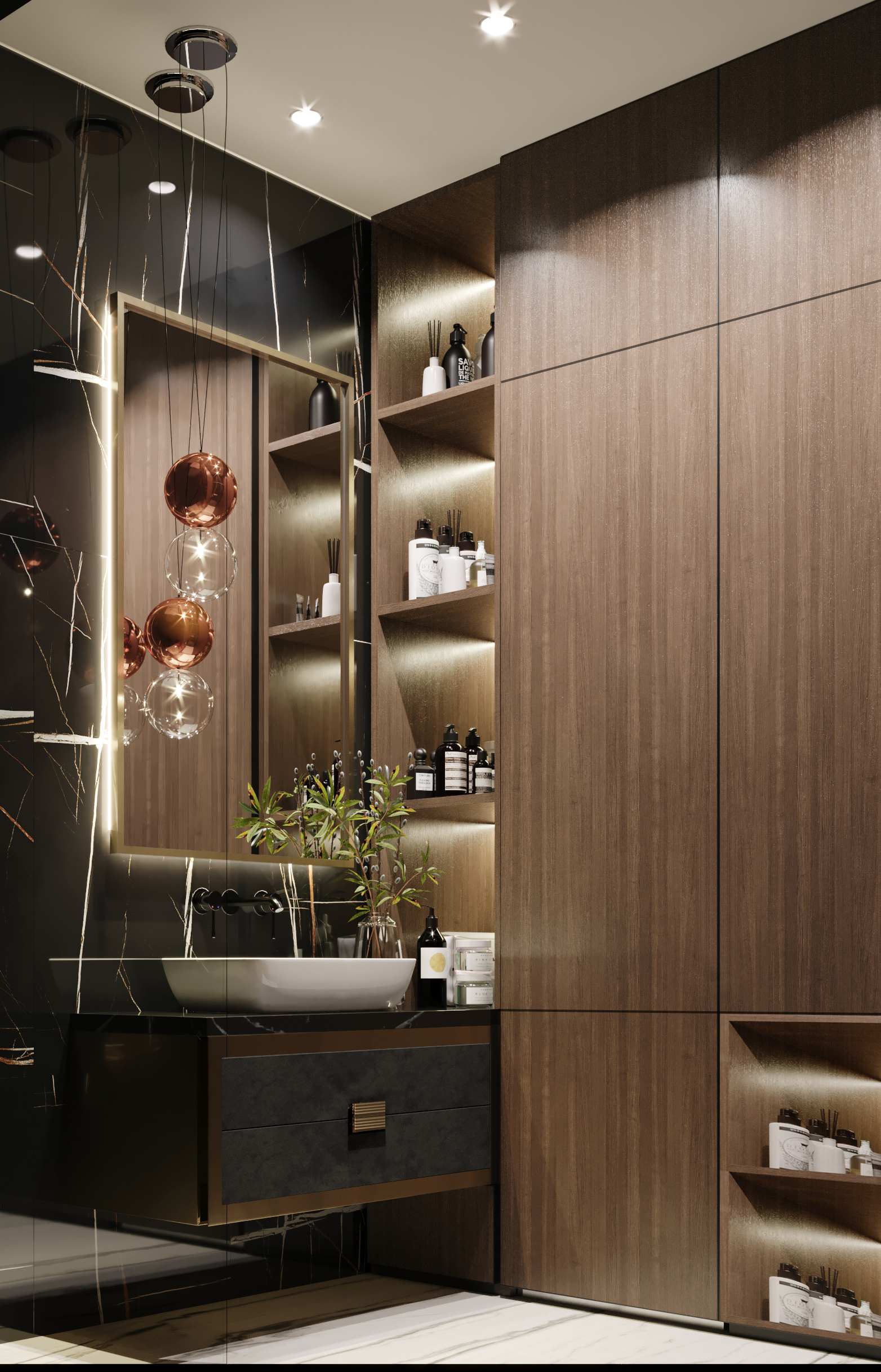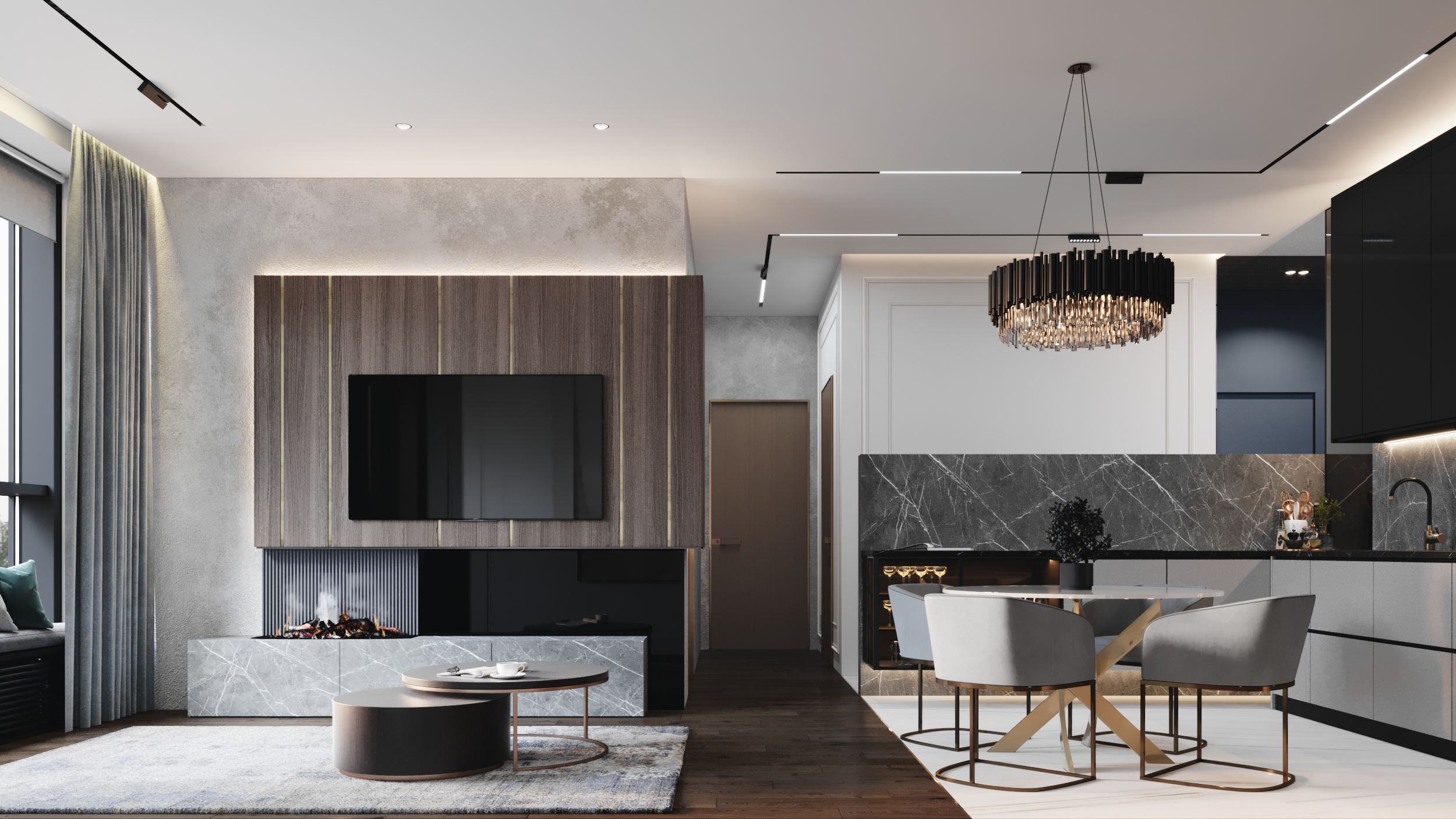 Выполнена в таком же стиле как и гостиная, современный брутальный интерьер сочитается с небольшими интеграциями классики, в виде молдингов, в виде классической текстуры и оттенка ореха, и освещение с претензией на современную классику.