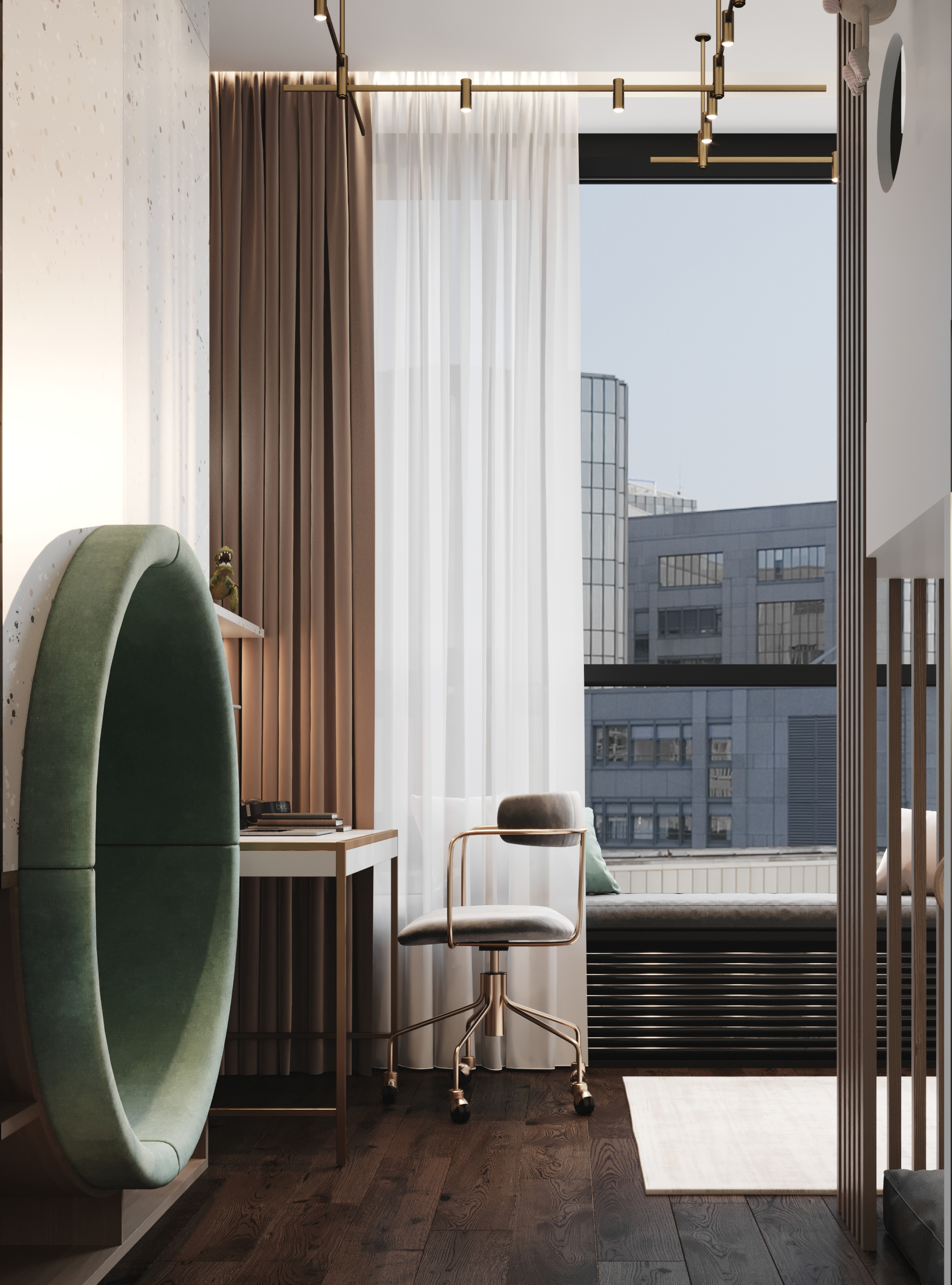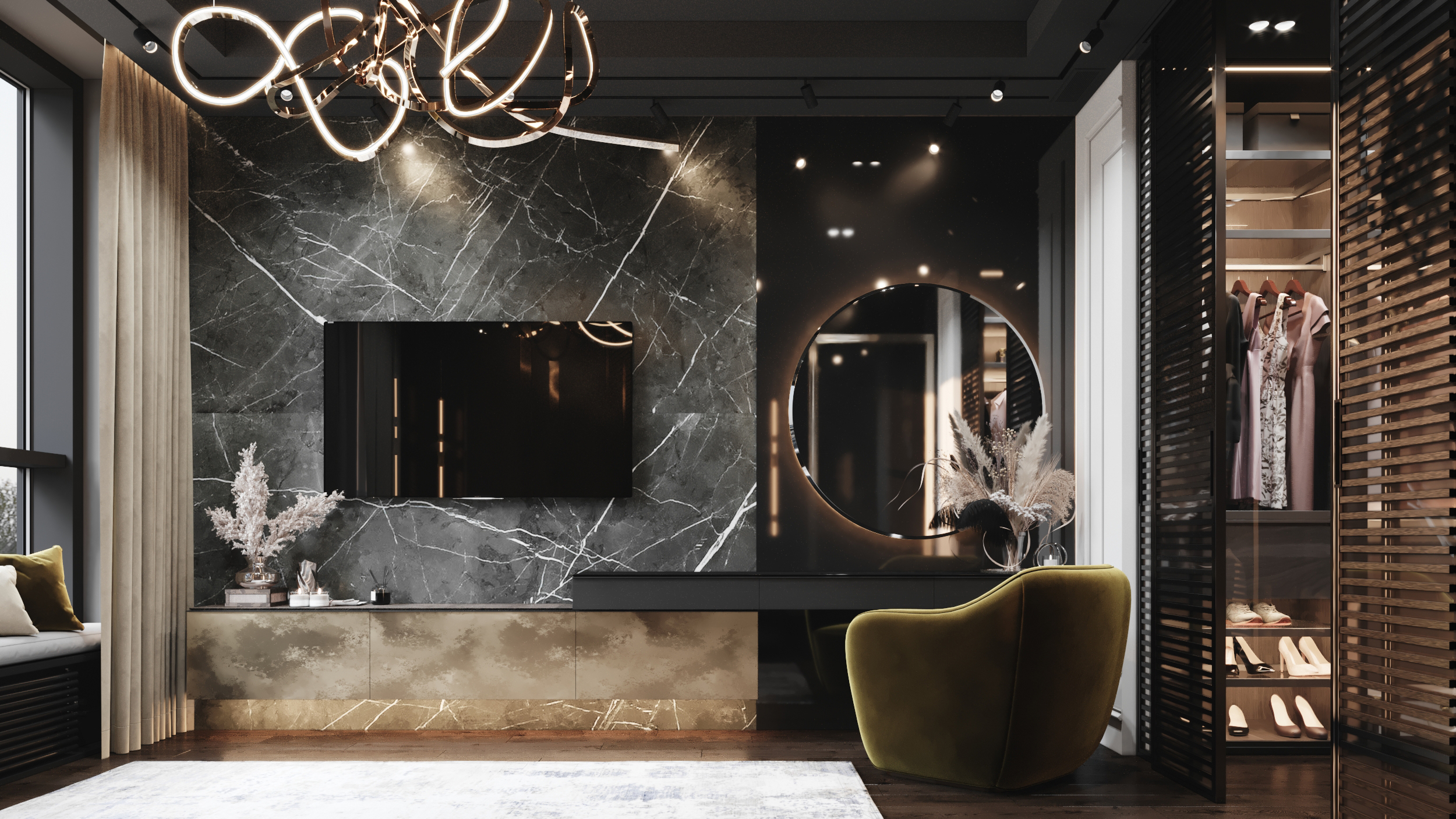 Напротик кровати мы зонировали стену на 2 части: зона ТВ и будуарная зона с минималистичной подвесной консолью.