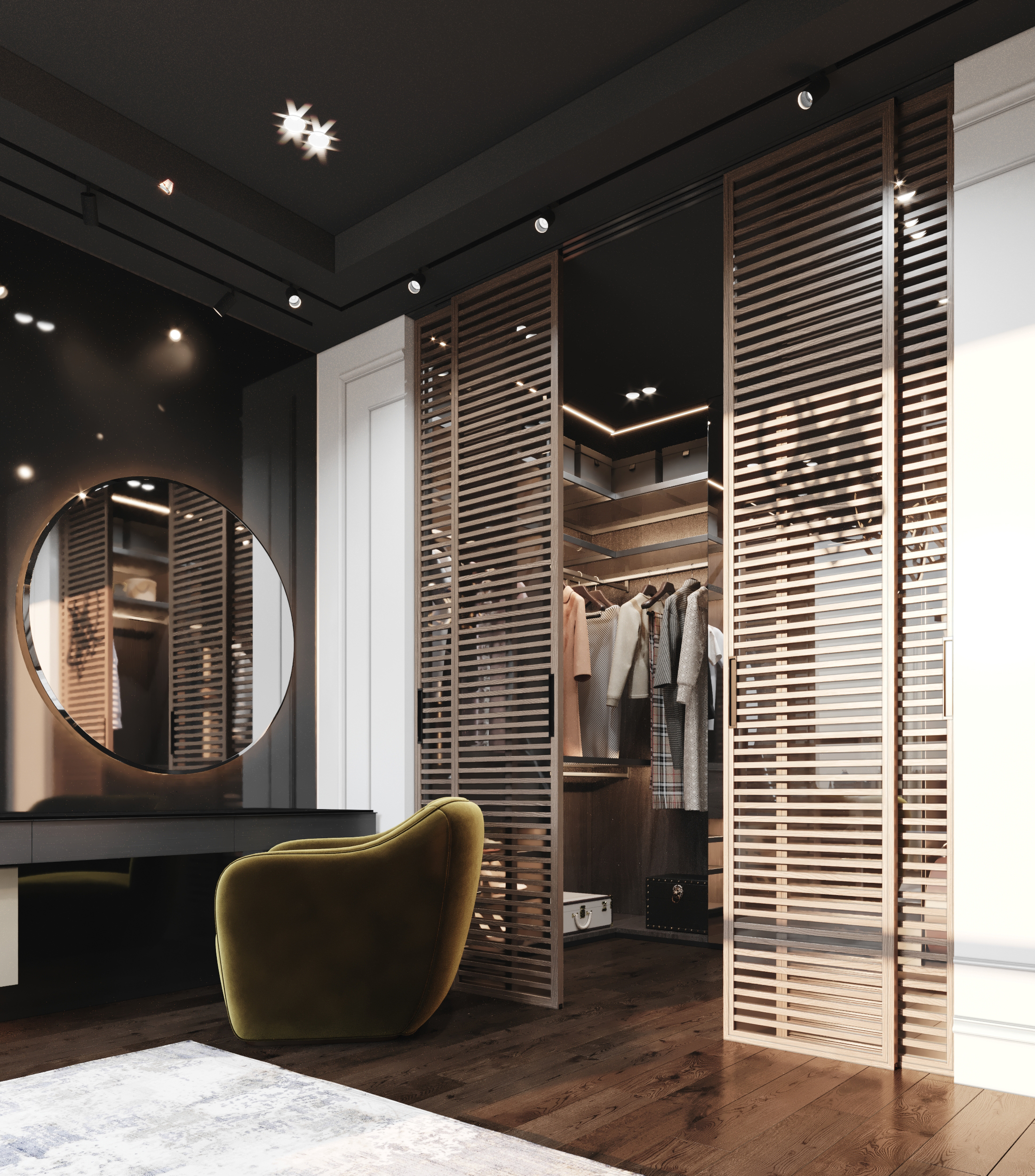 Из спальни мы попадаем в темный брутальный гардероб. Перегородки сделаны из тонированного стекла, Union.