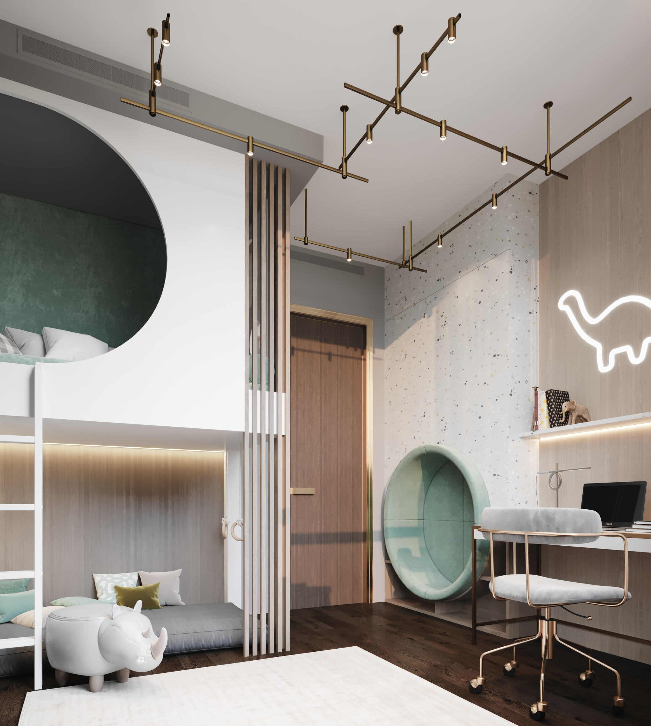 - Вторая более юная детская комната, с мягкими пастельными оттенками и динозавриками))