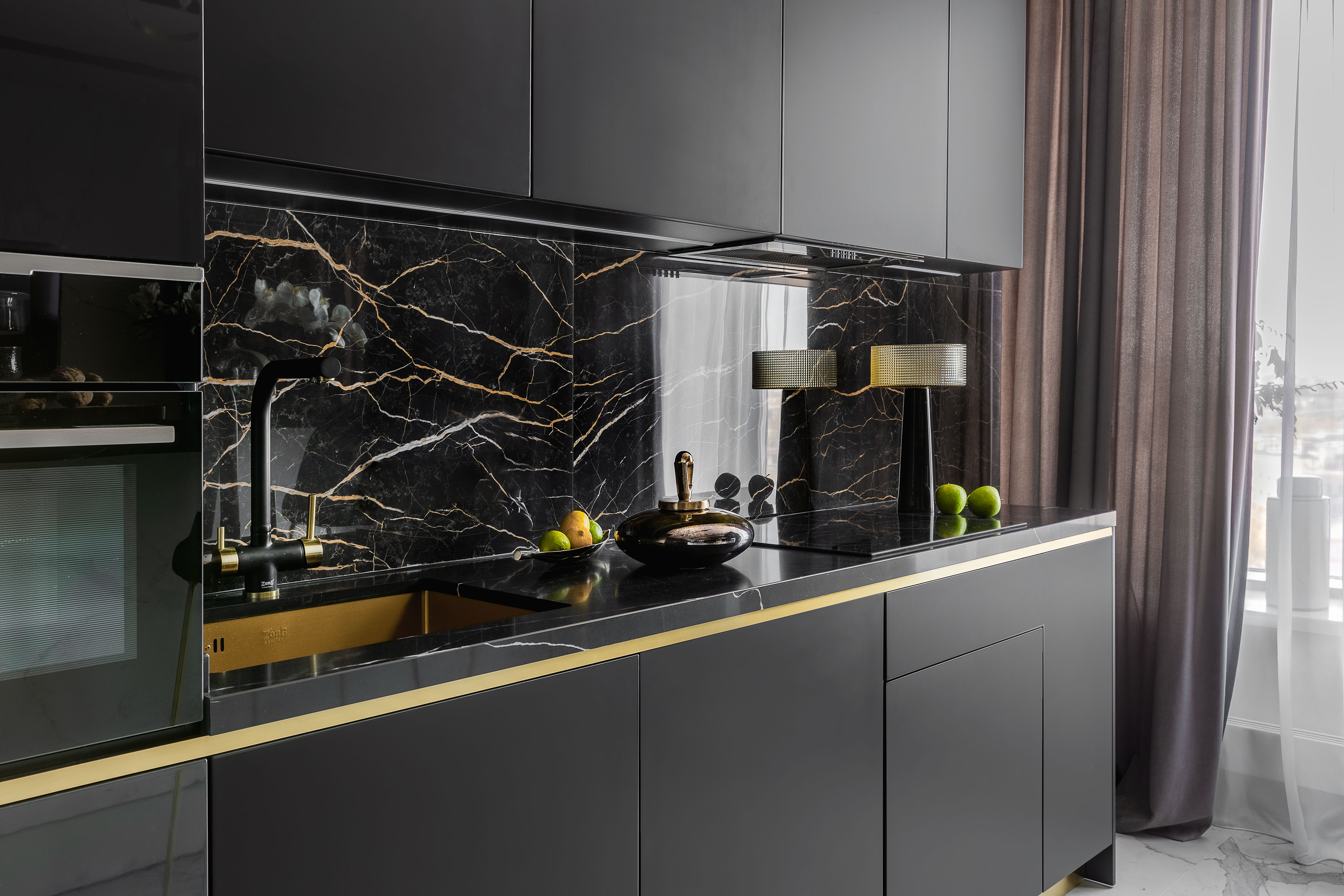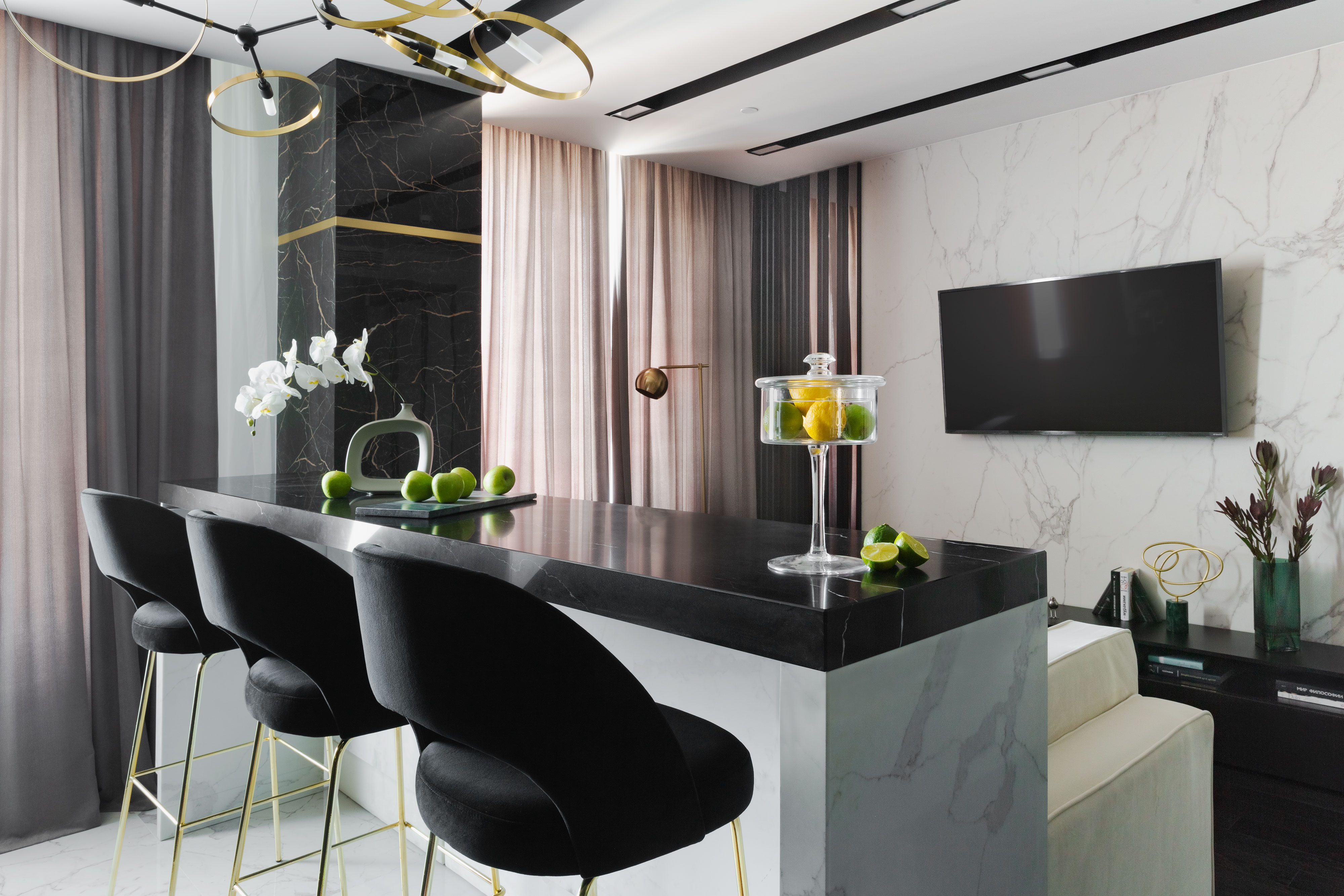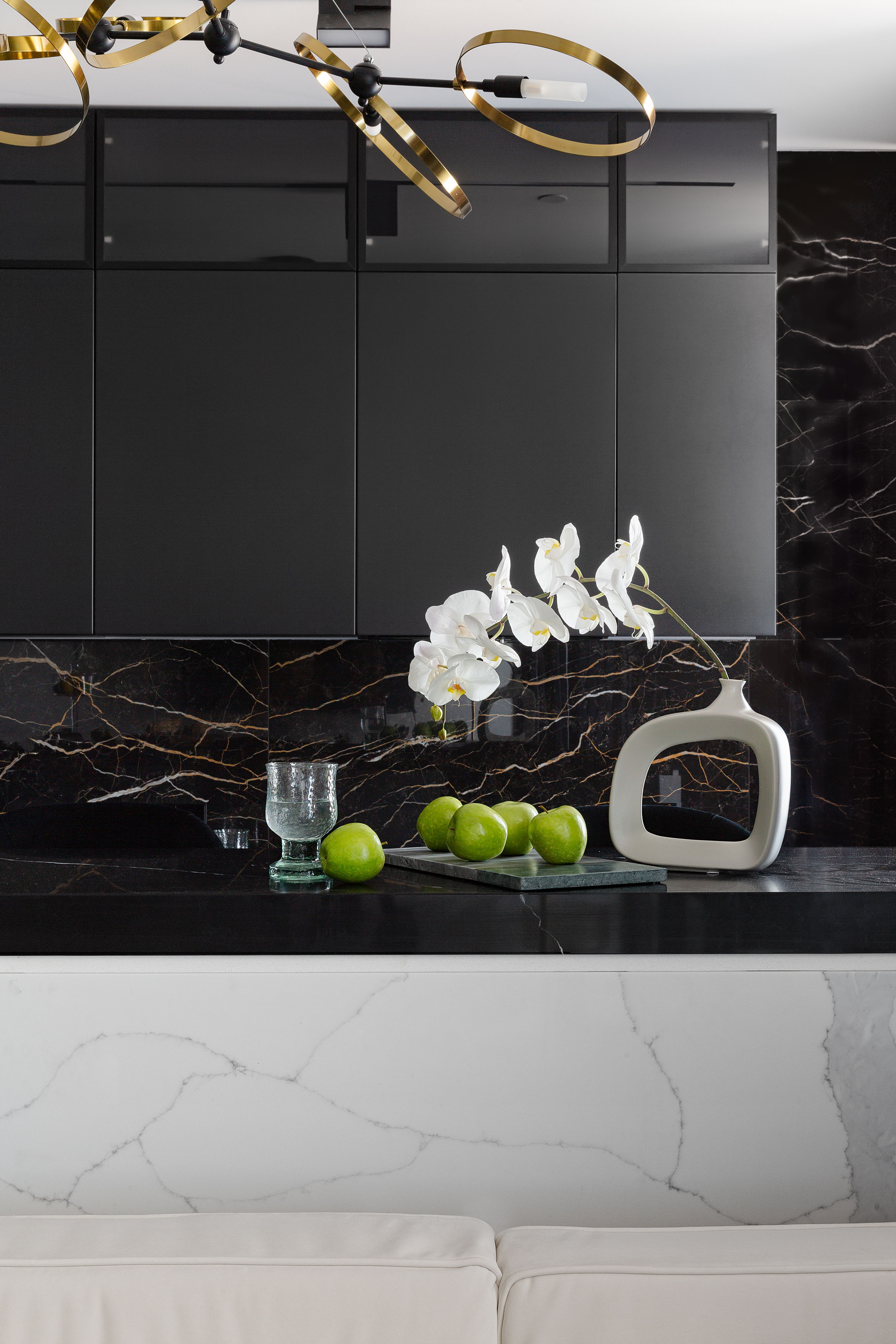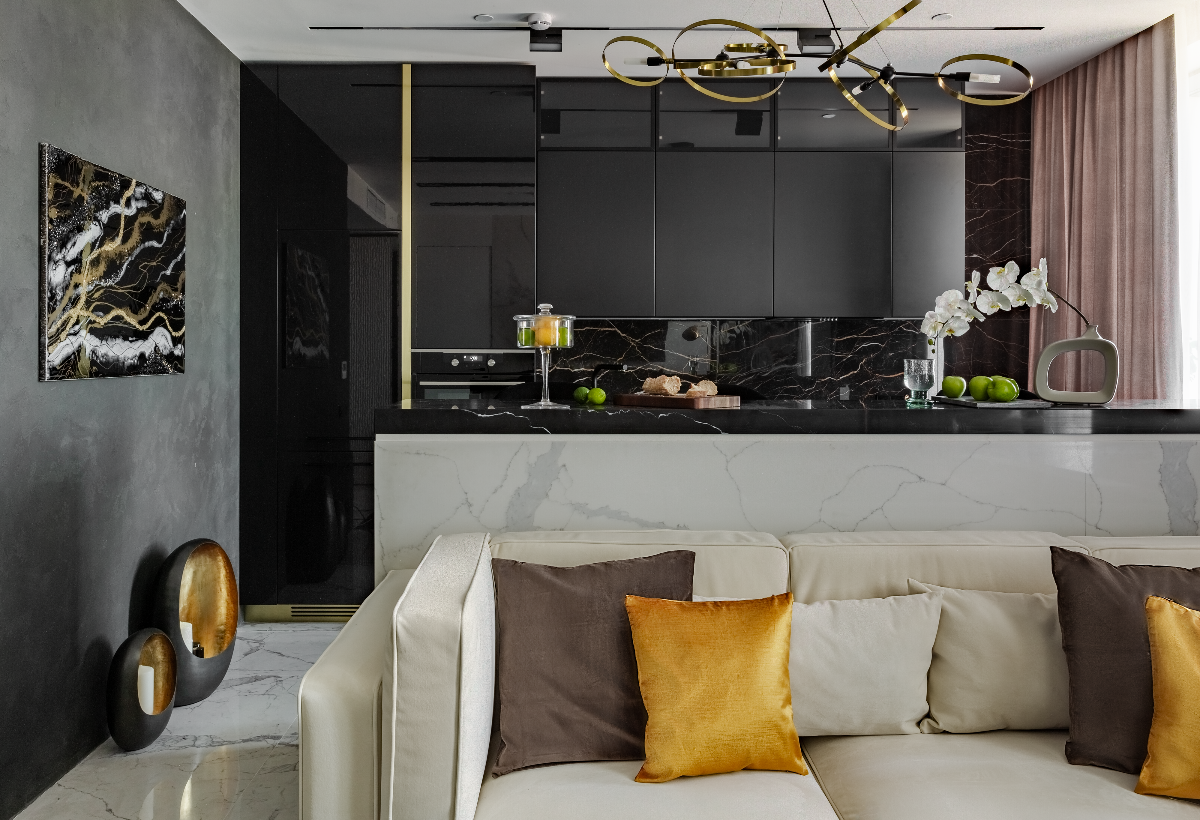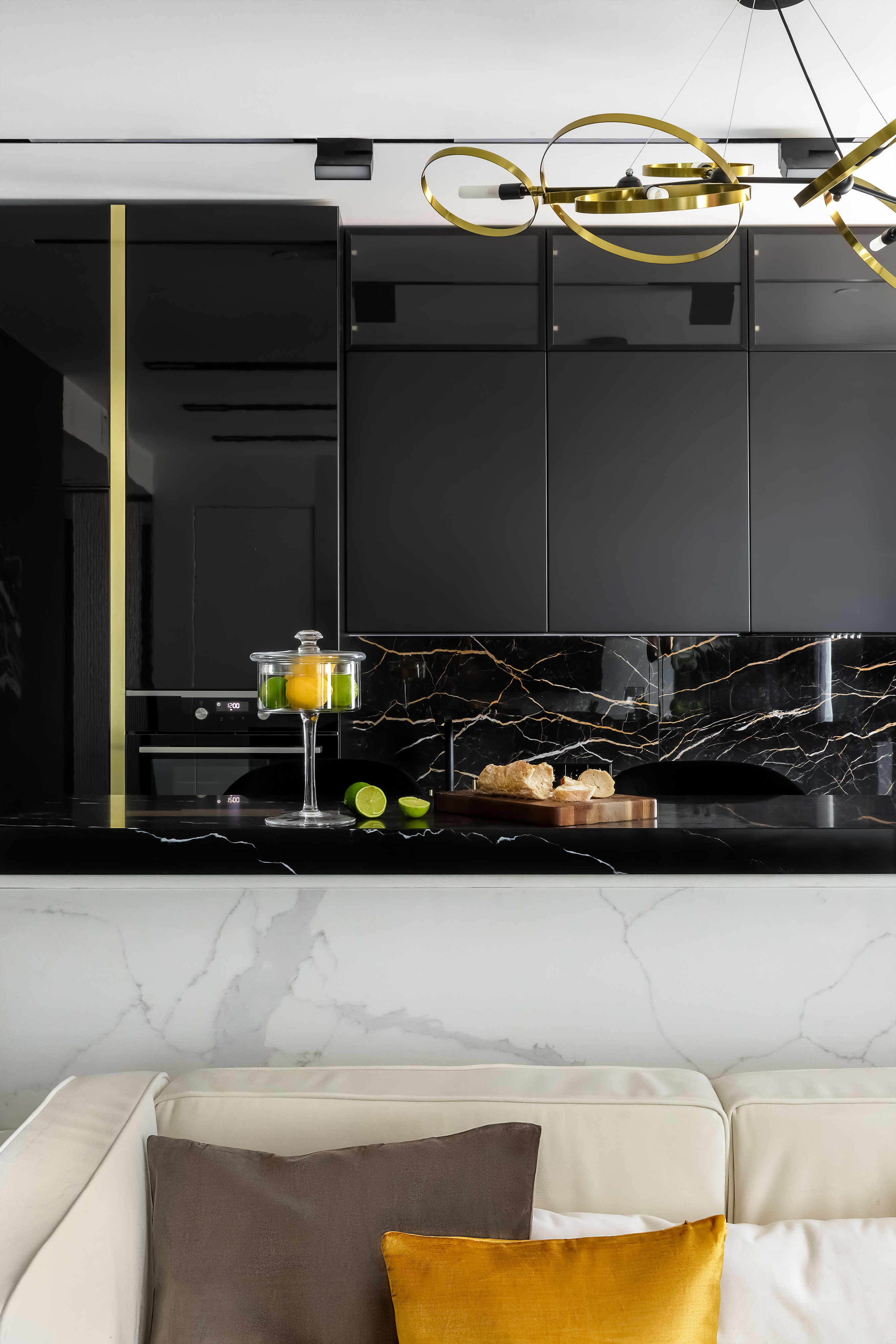 - Зонально кухню от гостиной отделяет барная стойка. Она выполнена из кварца под черный и белый мрамор. Над стойкой мы повесили необычную люстру. Кухня прямая. С левой стороны расположились колонки. Они в глянцевой эмали. Холодильник и техника встроенная.