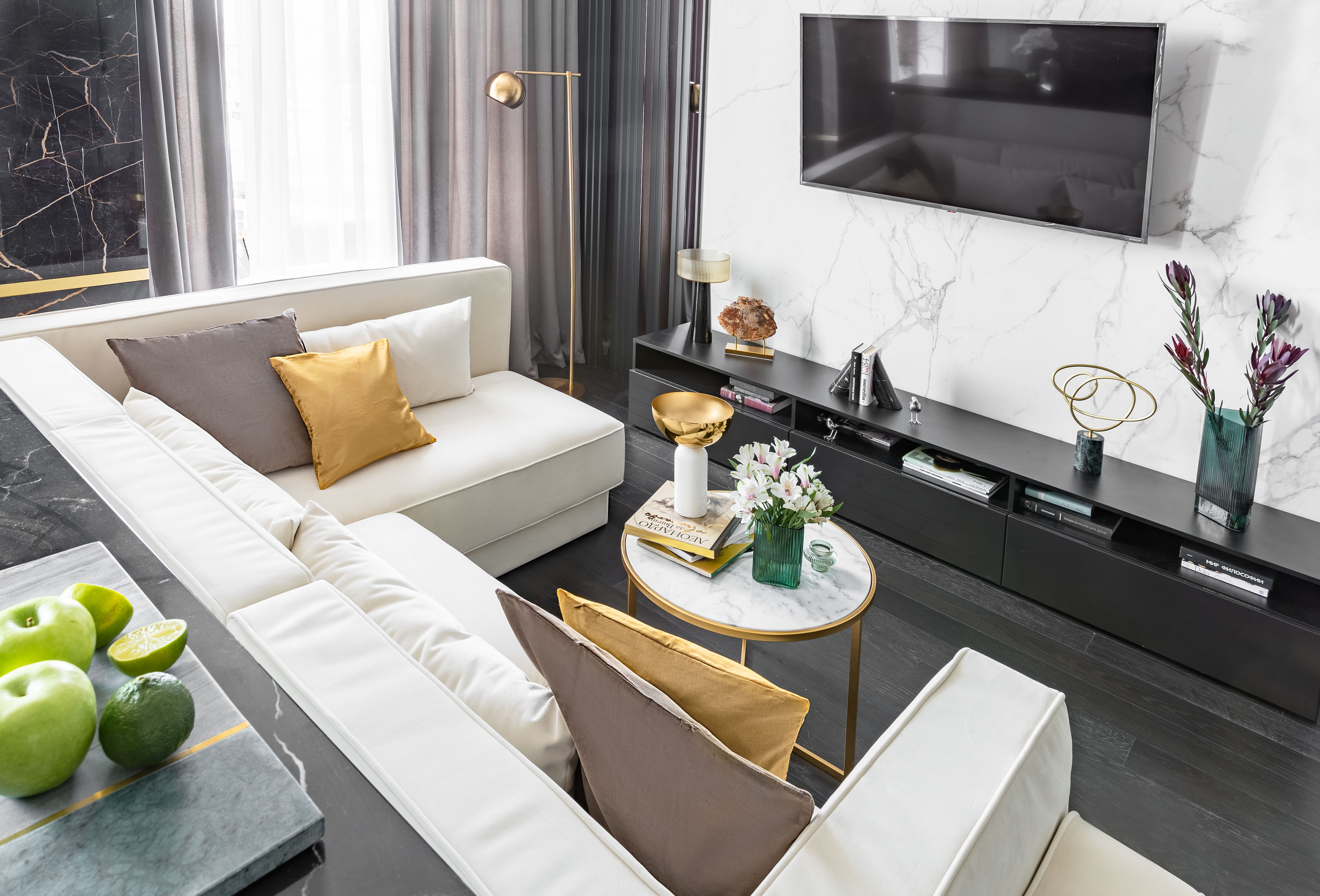 - В гостиной у нас расположился удобный угловой диван, телевизионная зона. За телевизором у нас крупноформатный керамогранит, смотрится он очень эффектно. Слева от телевизора у нас расположены панели, реечные зеркала. Мы их делали индивидуально по нашим эскизам на столярном производстве, как и всю мебель в этой квартире.