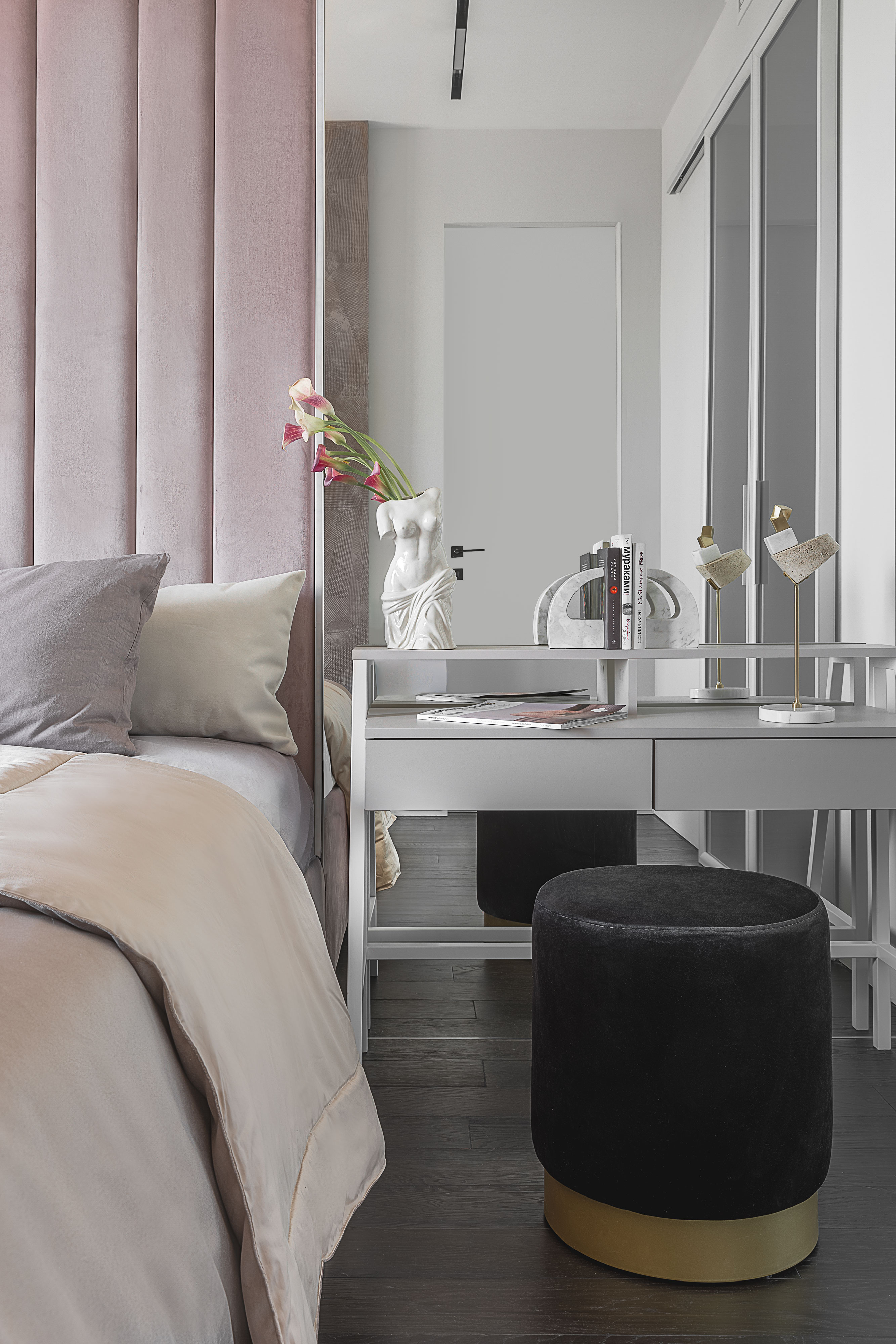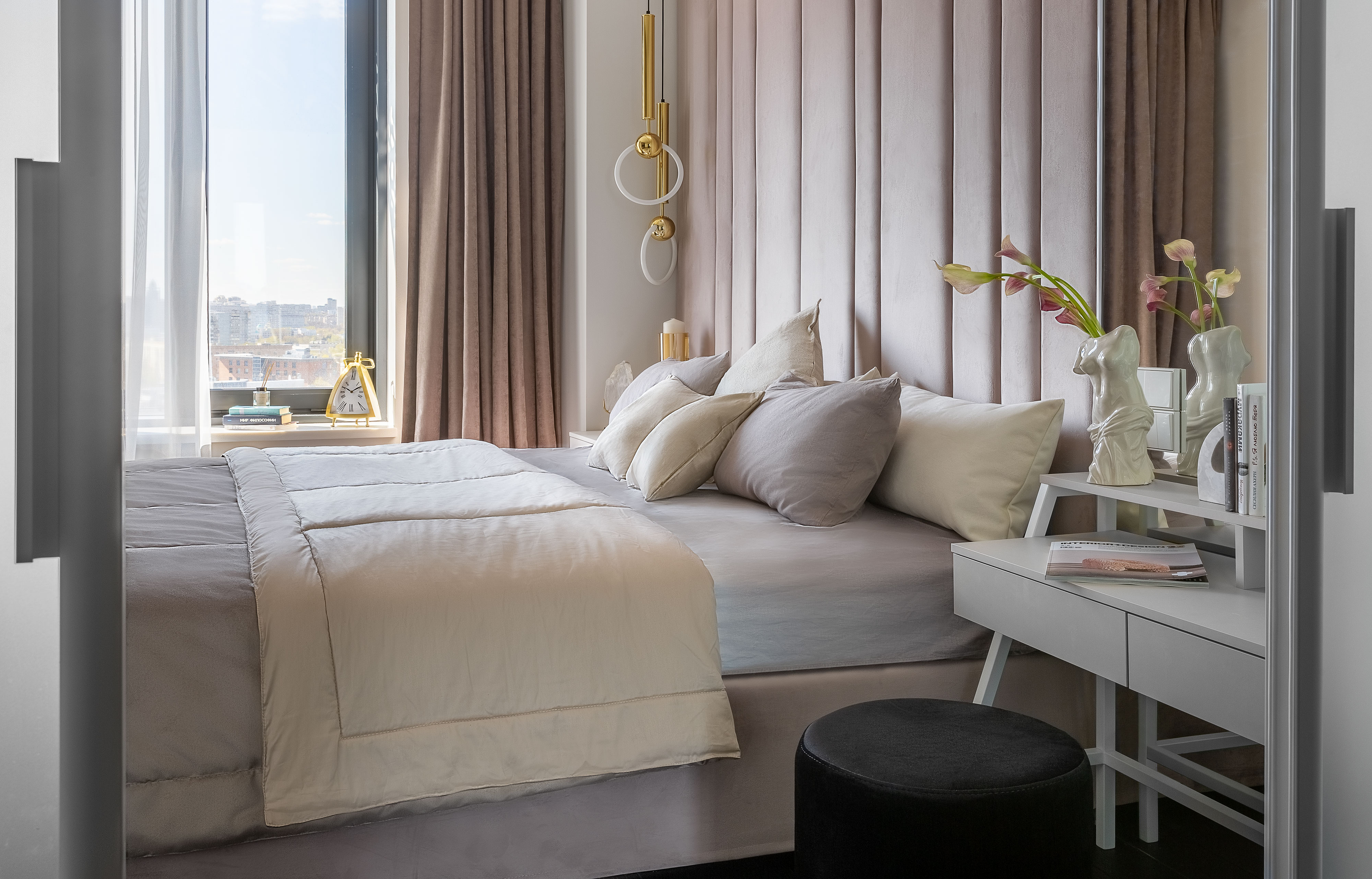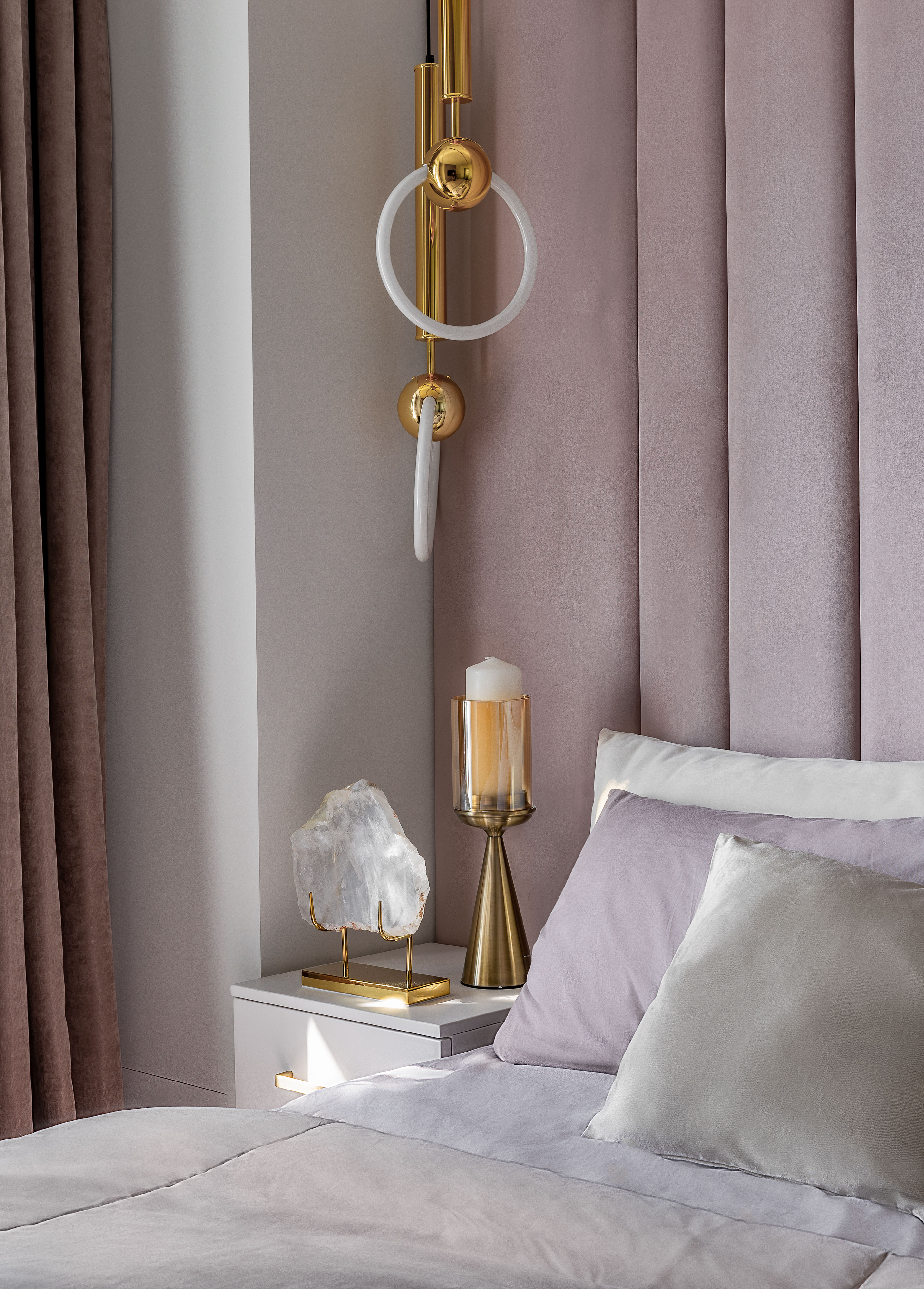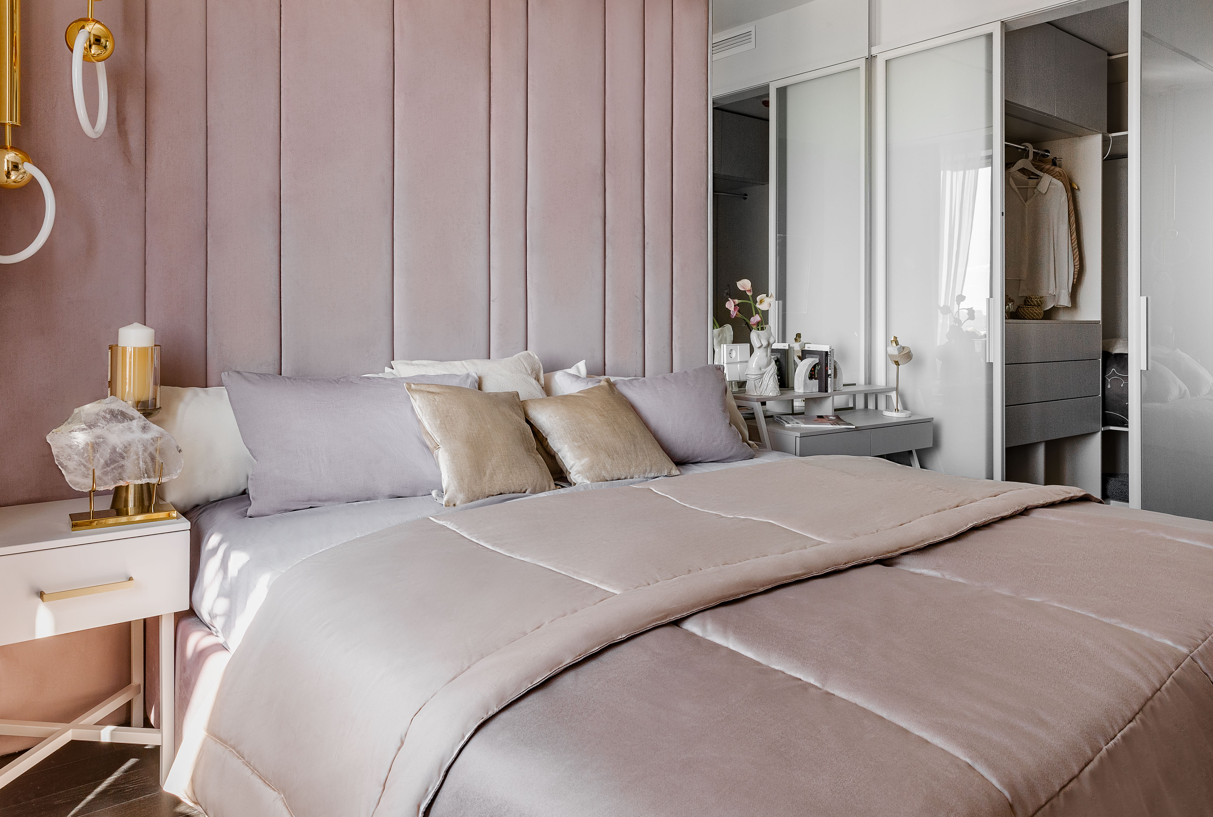 - В спальне у нас расположилась кровать с мягким изголовьем, это делалось на заказ по нашим эскизам, с мягкими стеновыми панелями высотой от пола до потолка, выглядит эффектно и удобно читать сидя.