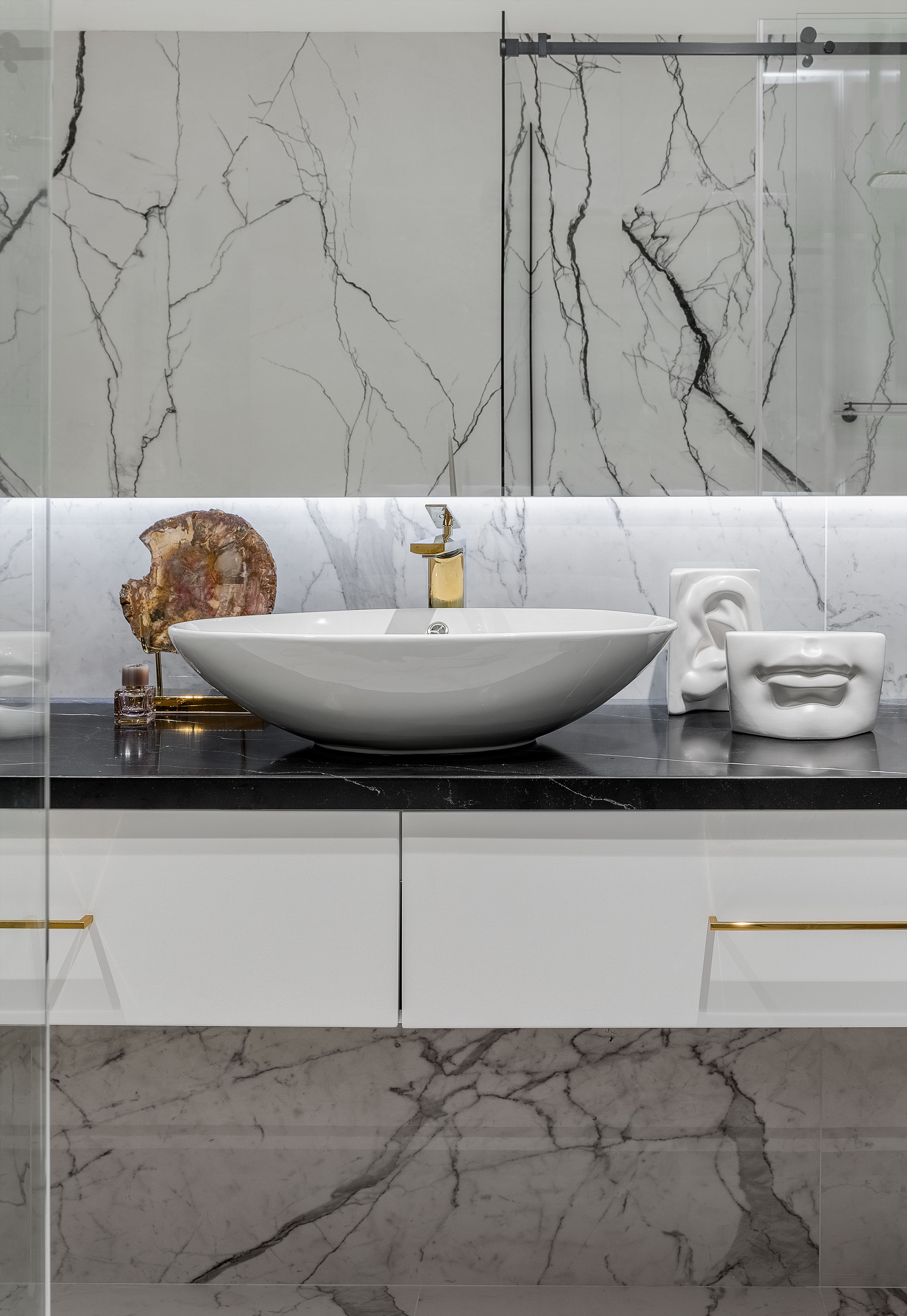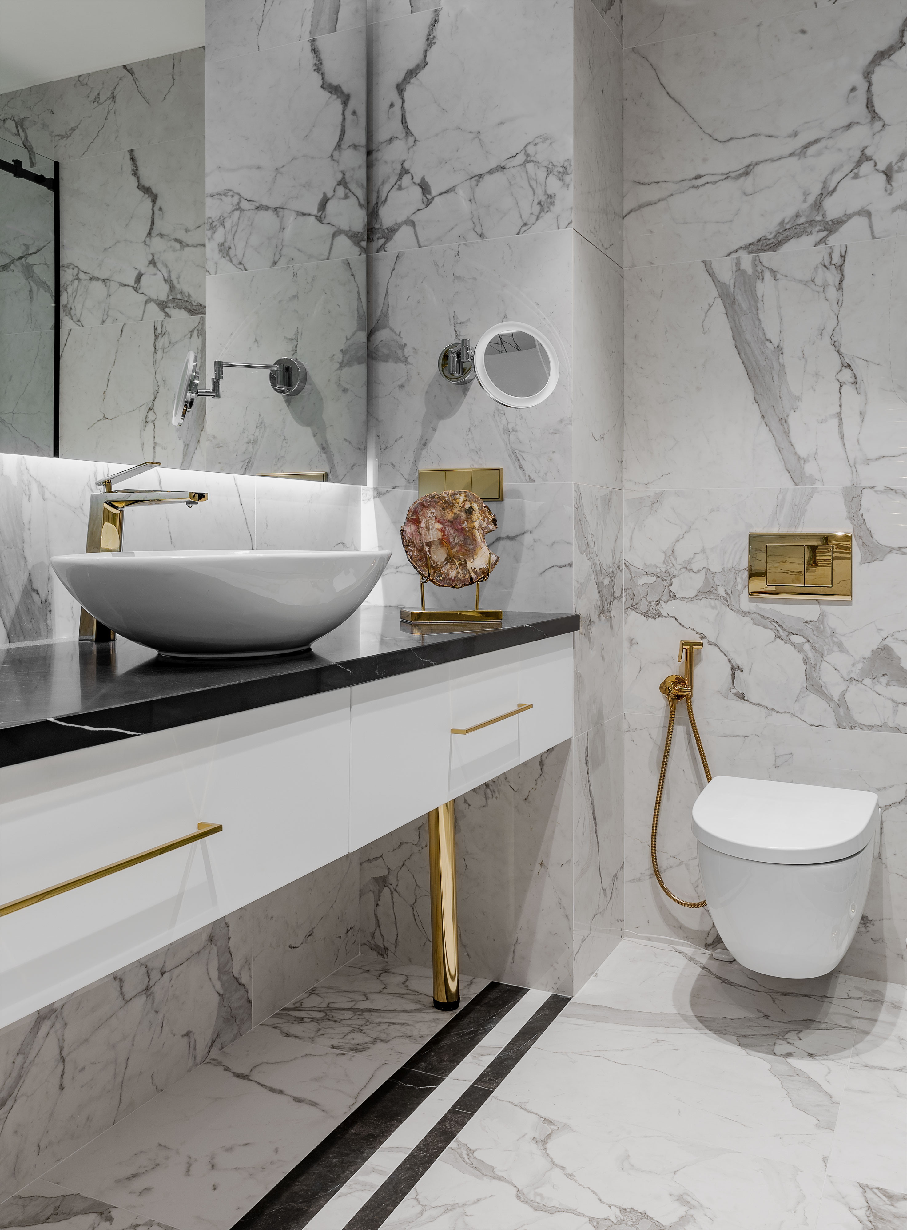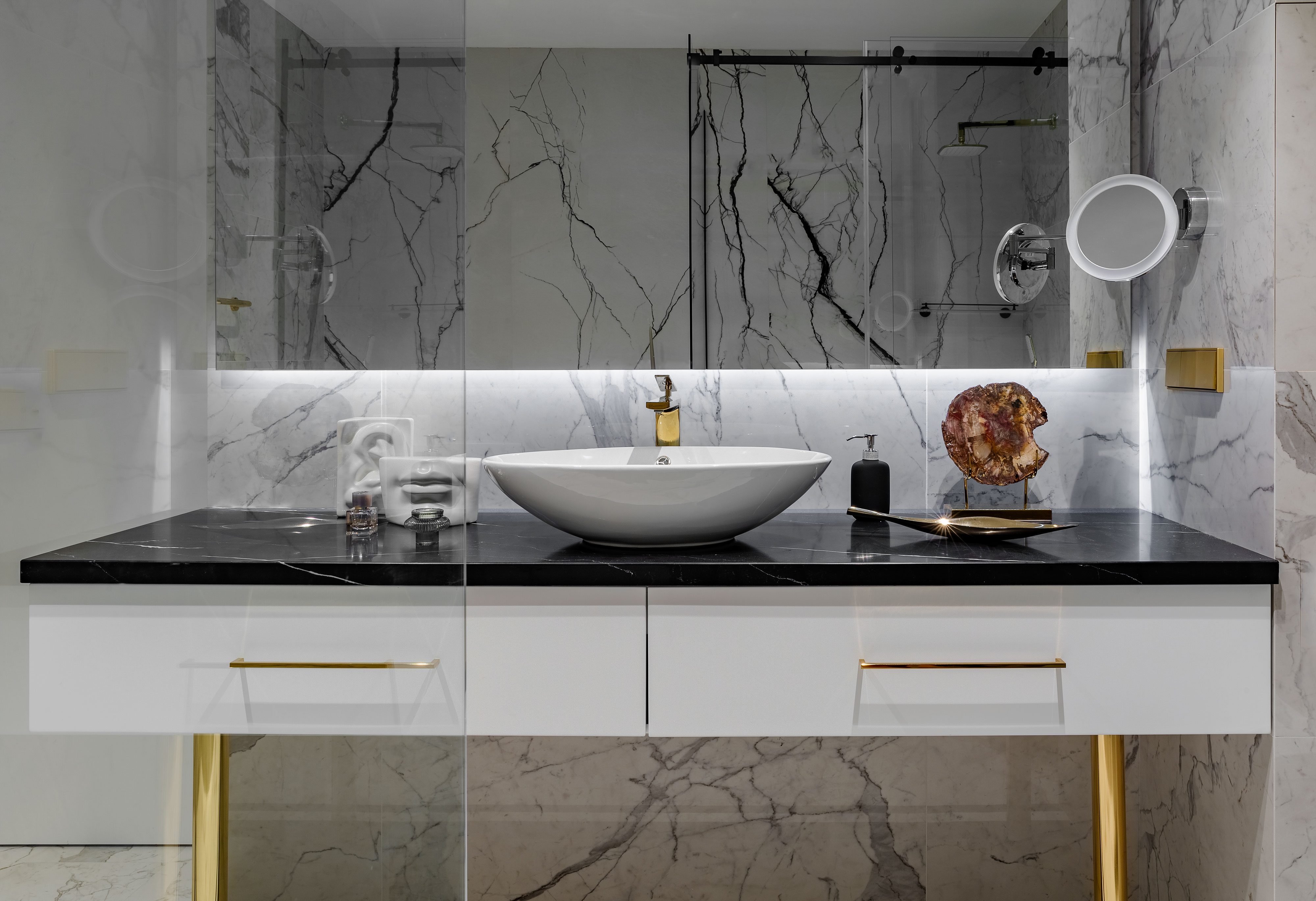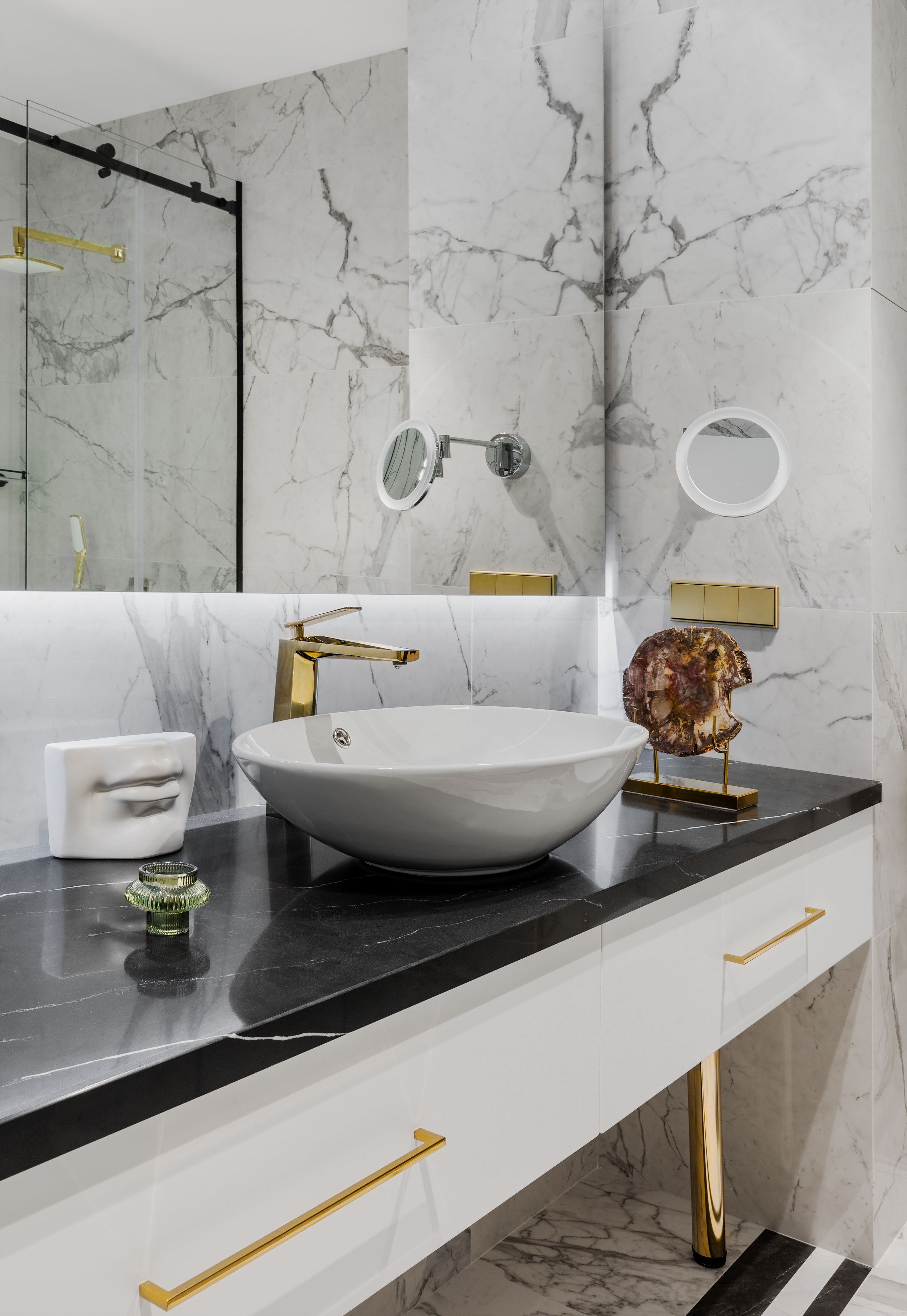 - В ванной расположилась очень большая столешница под раковину. Раковина у нас такая накладная, чаша. Вся сантехника у нас выполнена в золоте.