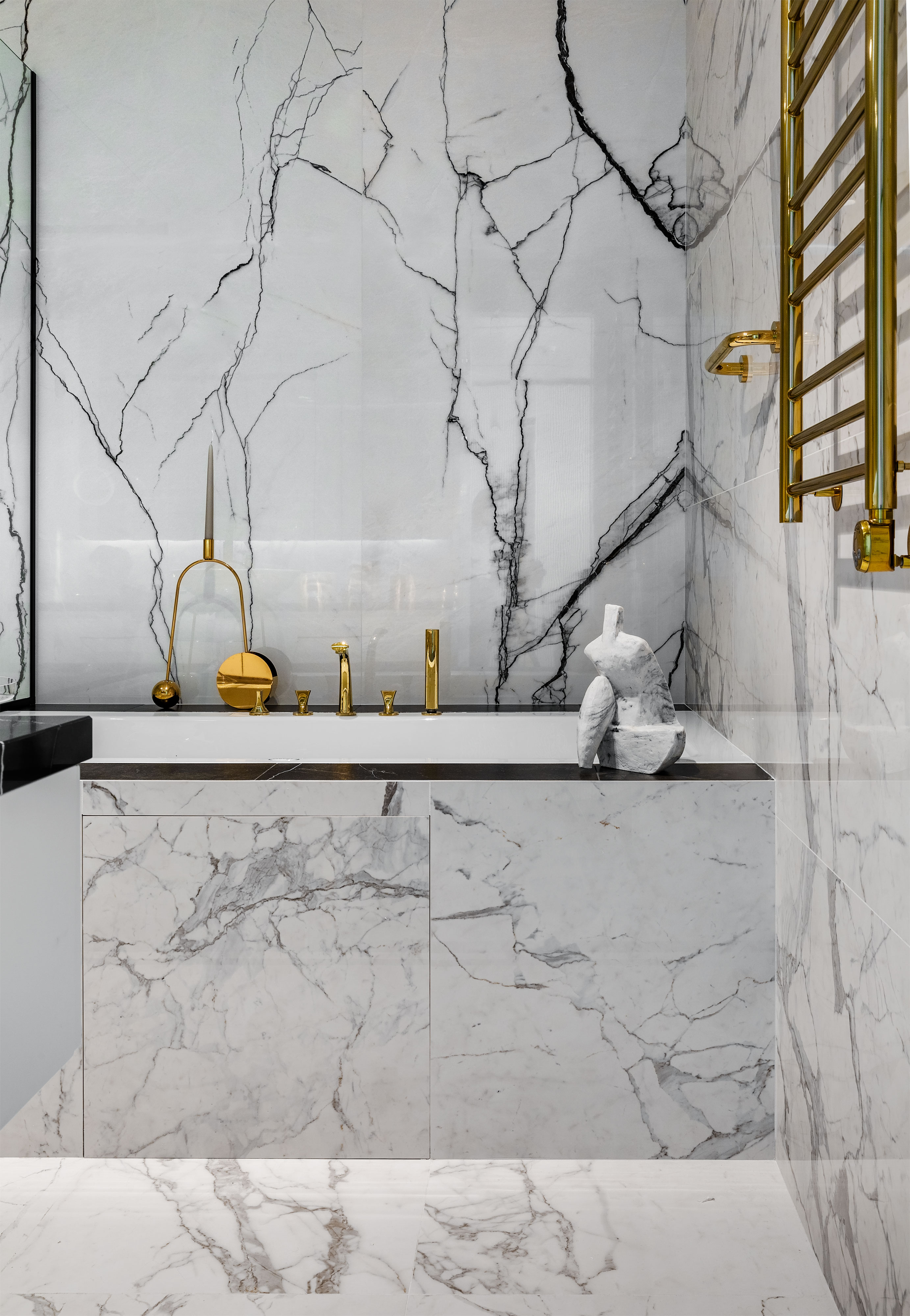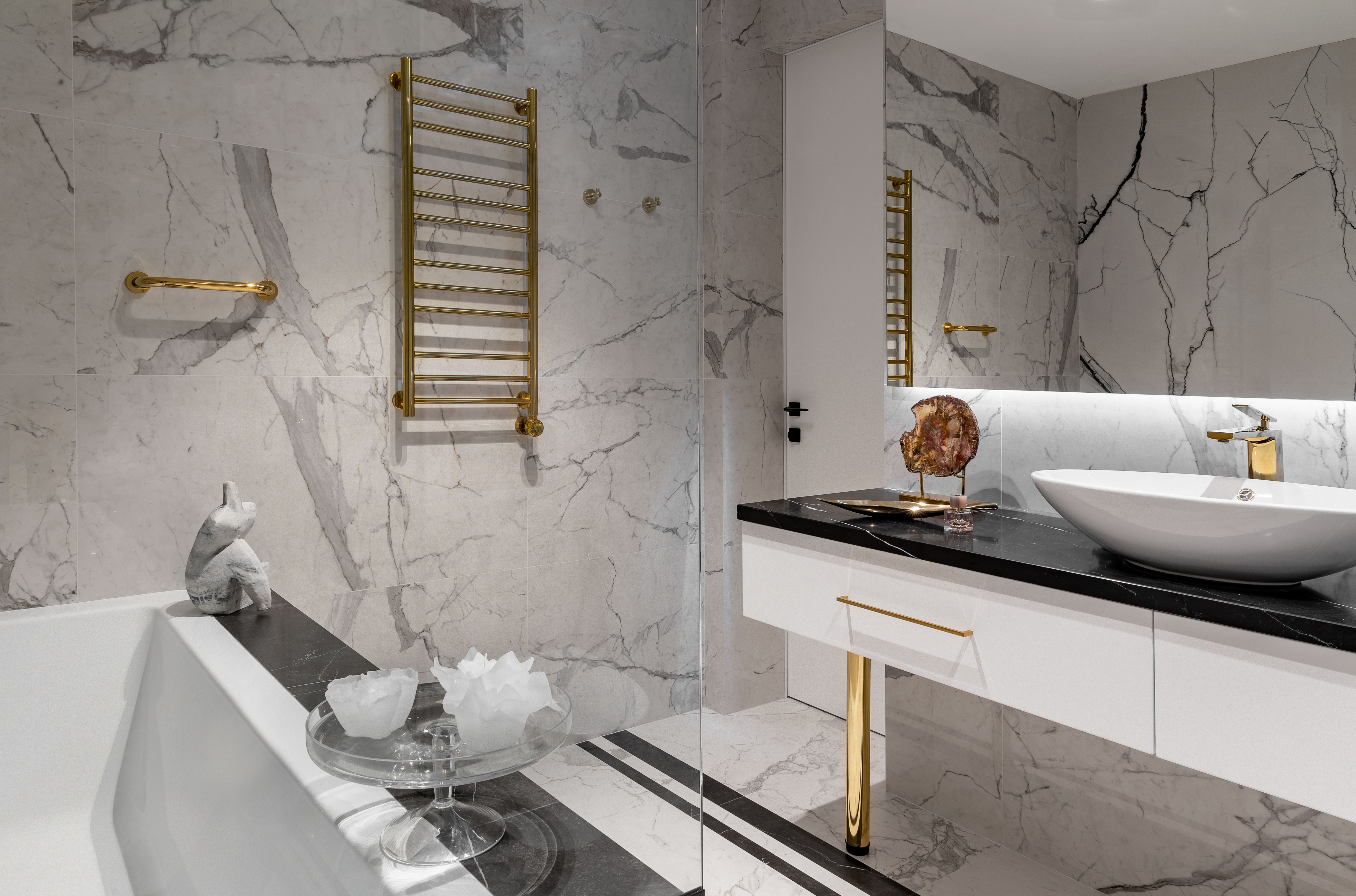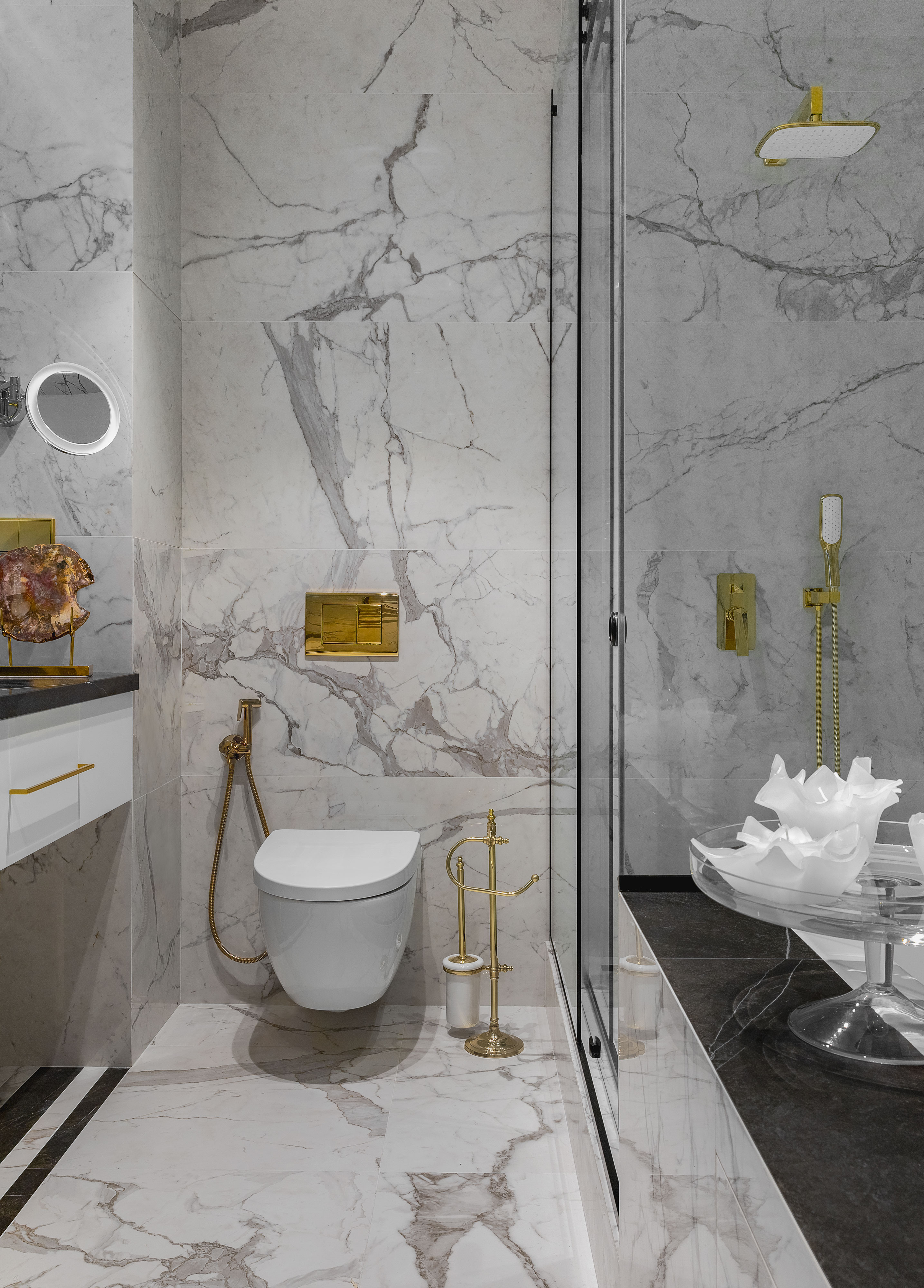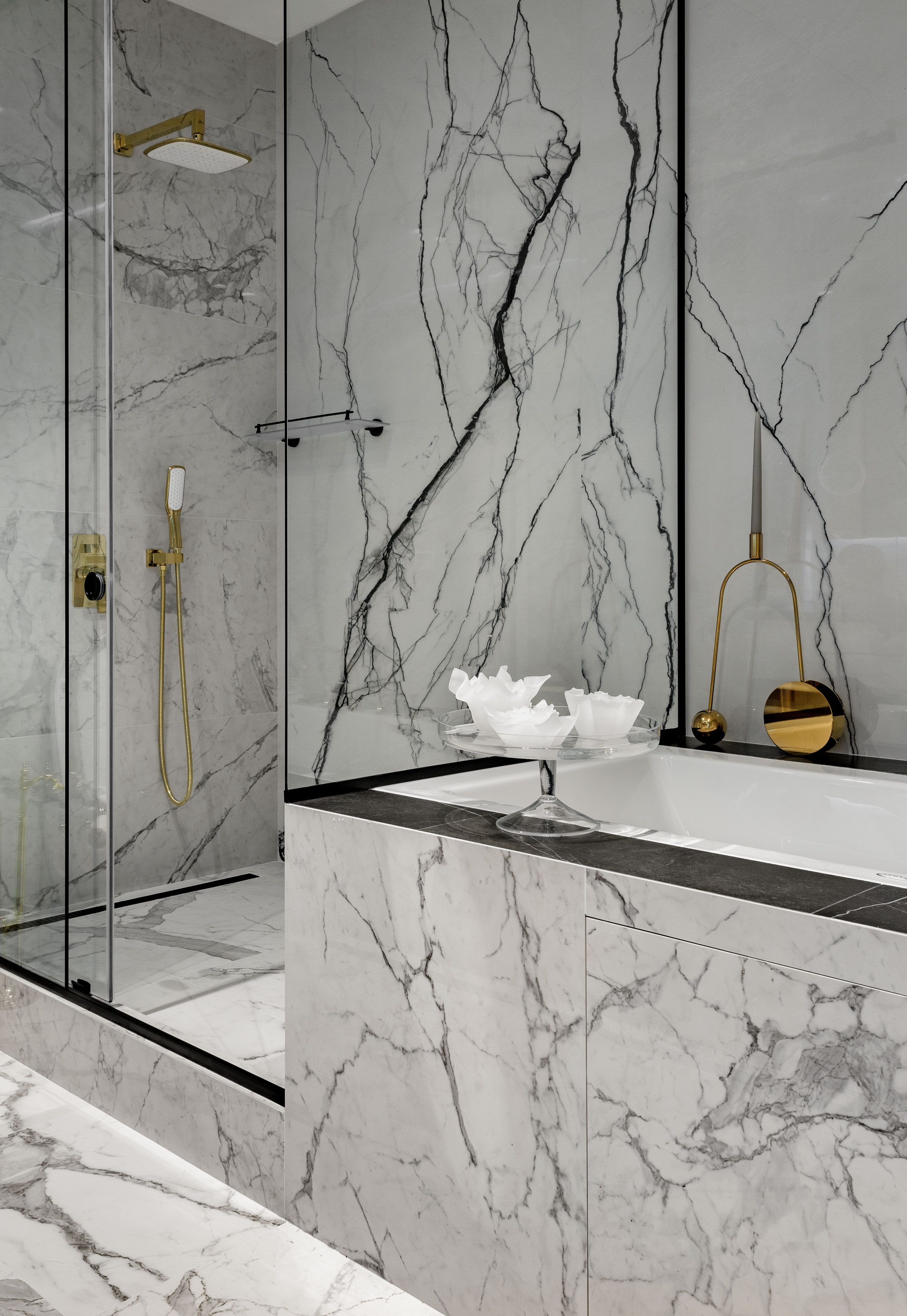 - Самое эффектное место в ванной это душевая и ванная. На задней стенке у нас расположился крупноформатный керамогранит. Всего два шовчика, душевая со стеклянной перегородкой. И ванная, она такая больше для релакса, да, поэтому мы сделали здесь такие широкие бортики и расположили на бортиках смесители, тоже в золоте.