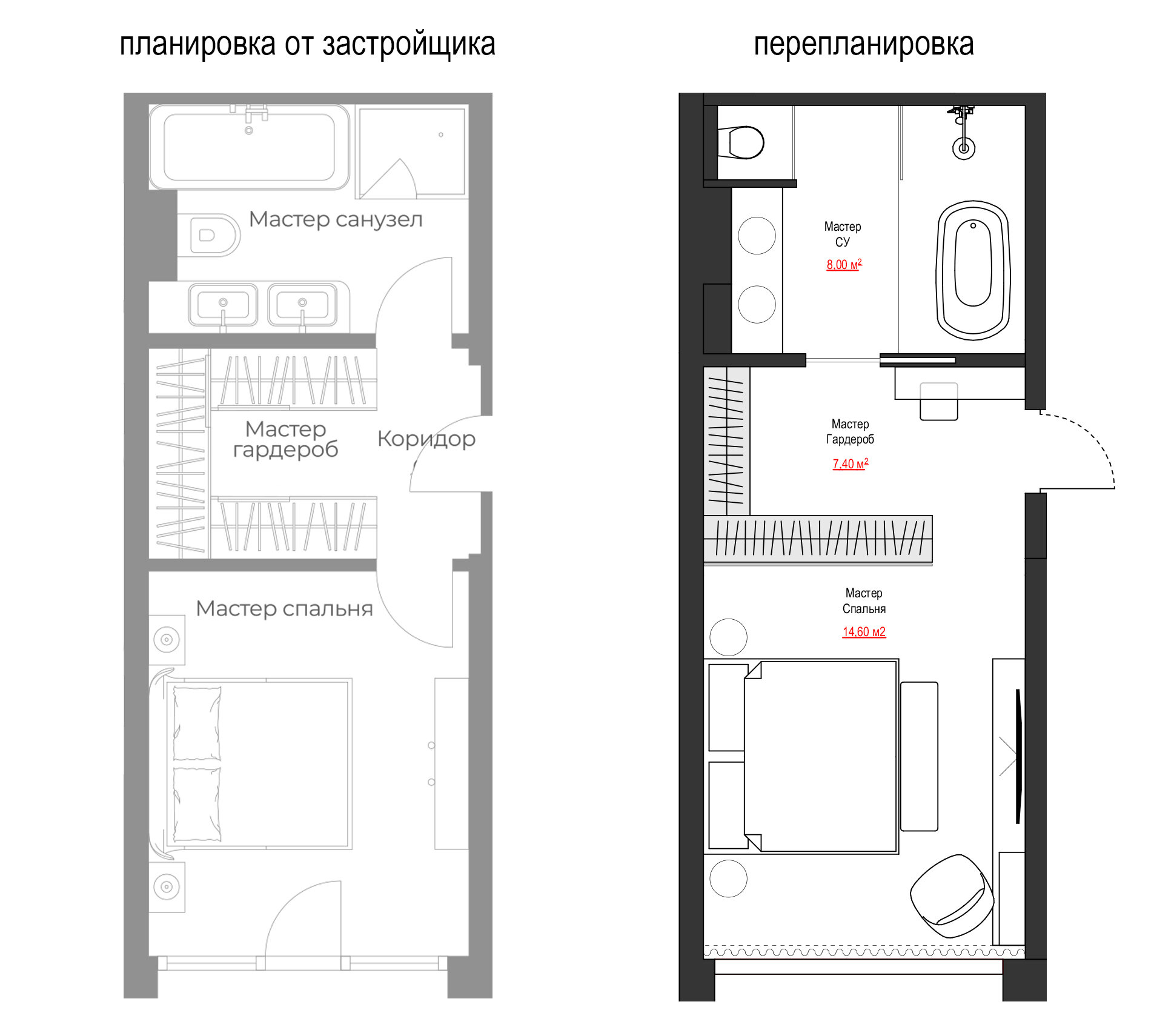 Застройщик предусмотрел полноценный мастер блок, со своим гардеробом и санузлом - и это идеальное решение, которое мы только поддерживаем.
