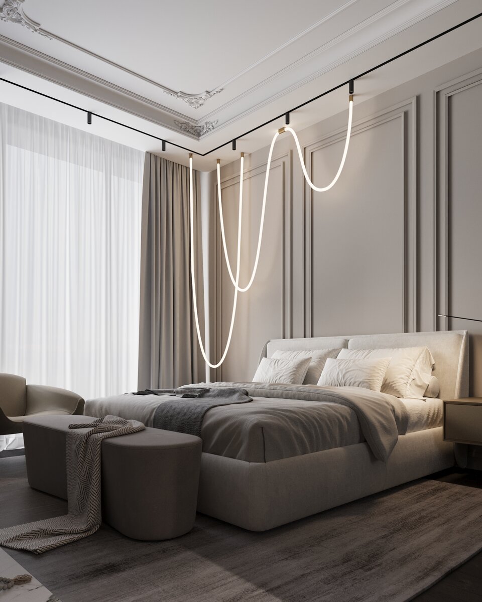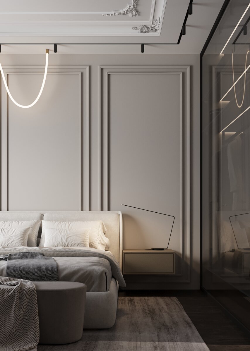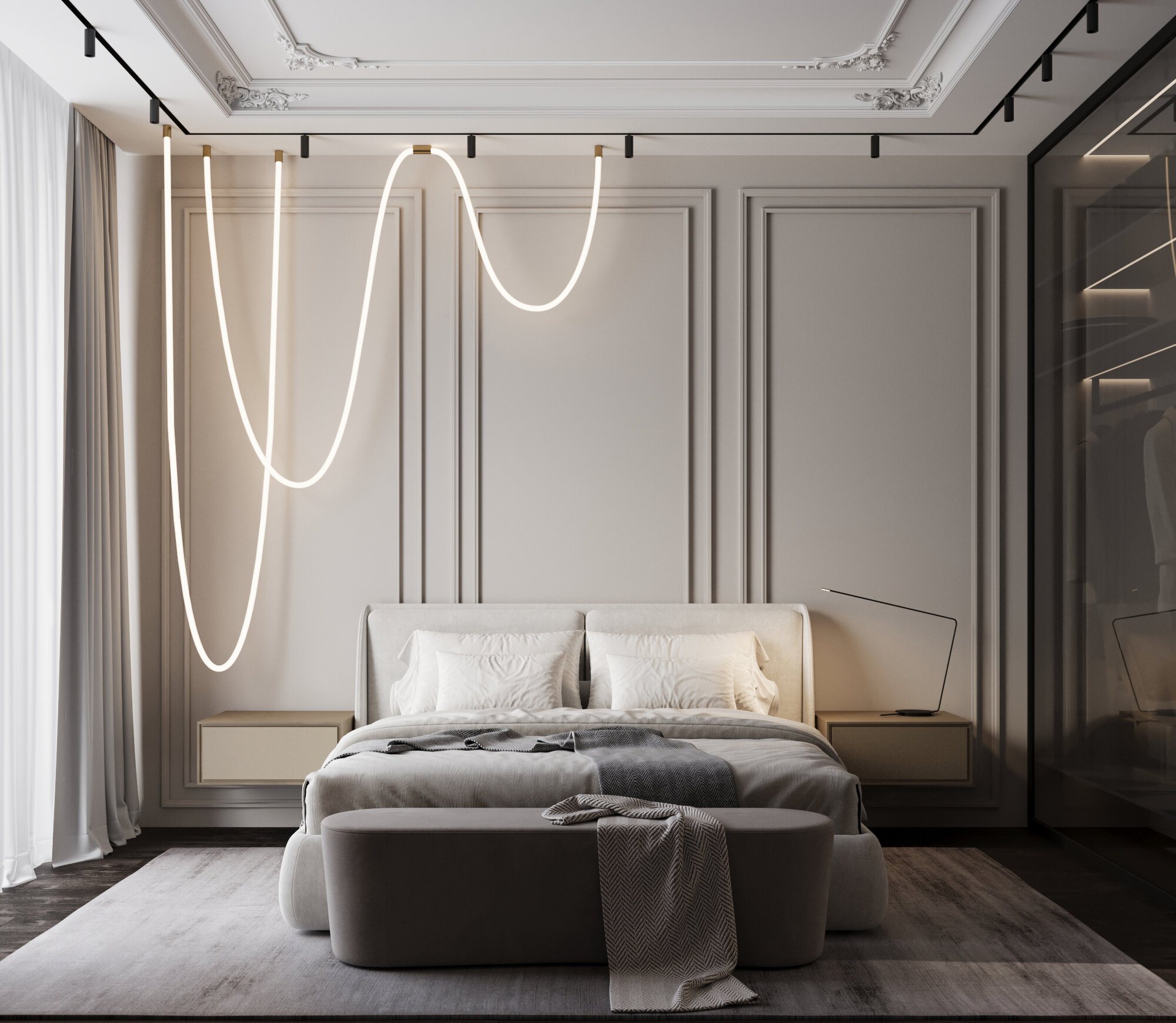 Спальня выполнена преимущественно в светлых тёплых оттенках, с классическими акцентами в виде молдингов на стене и лепнины на потолке, что подчёркивает лёгкость и создаёт уютное пространство. Но при этом интерьер не лишён контраста в виде чёрных светильников, тонированного стекла и насыщенного оттенка пола.