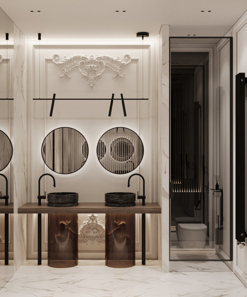 Входя в санузел наше внимание сразу приковывает зона с раковинами, круглыми зеркалами и декоративным подвесом.