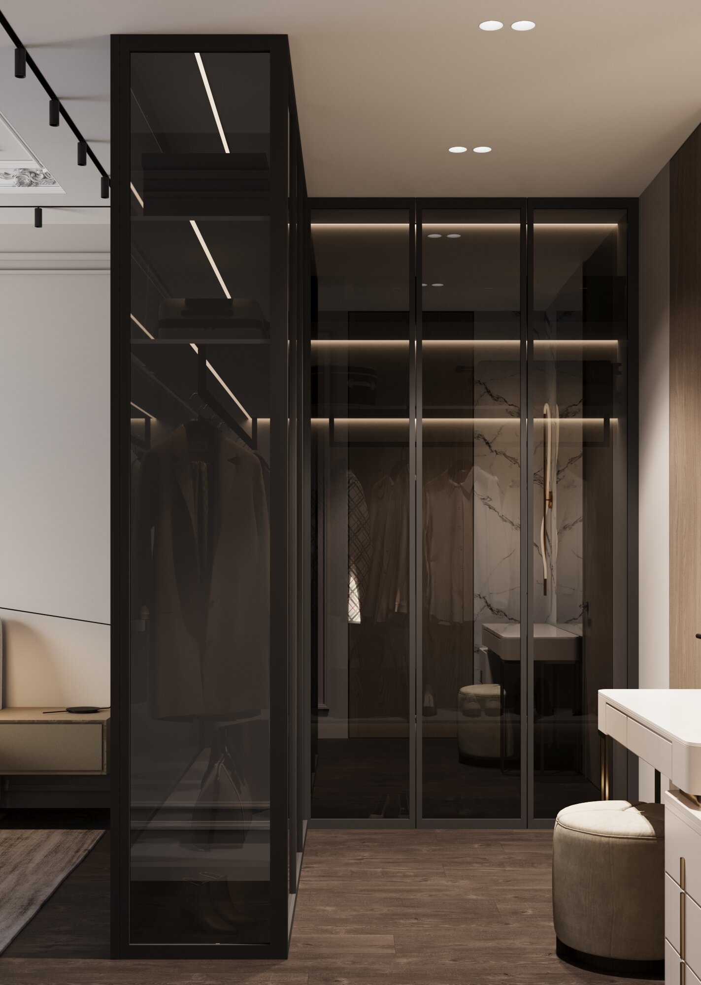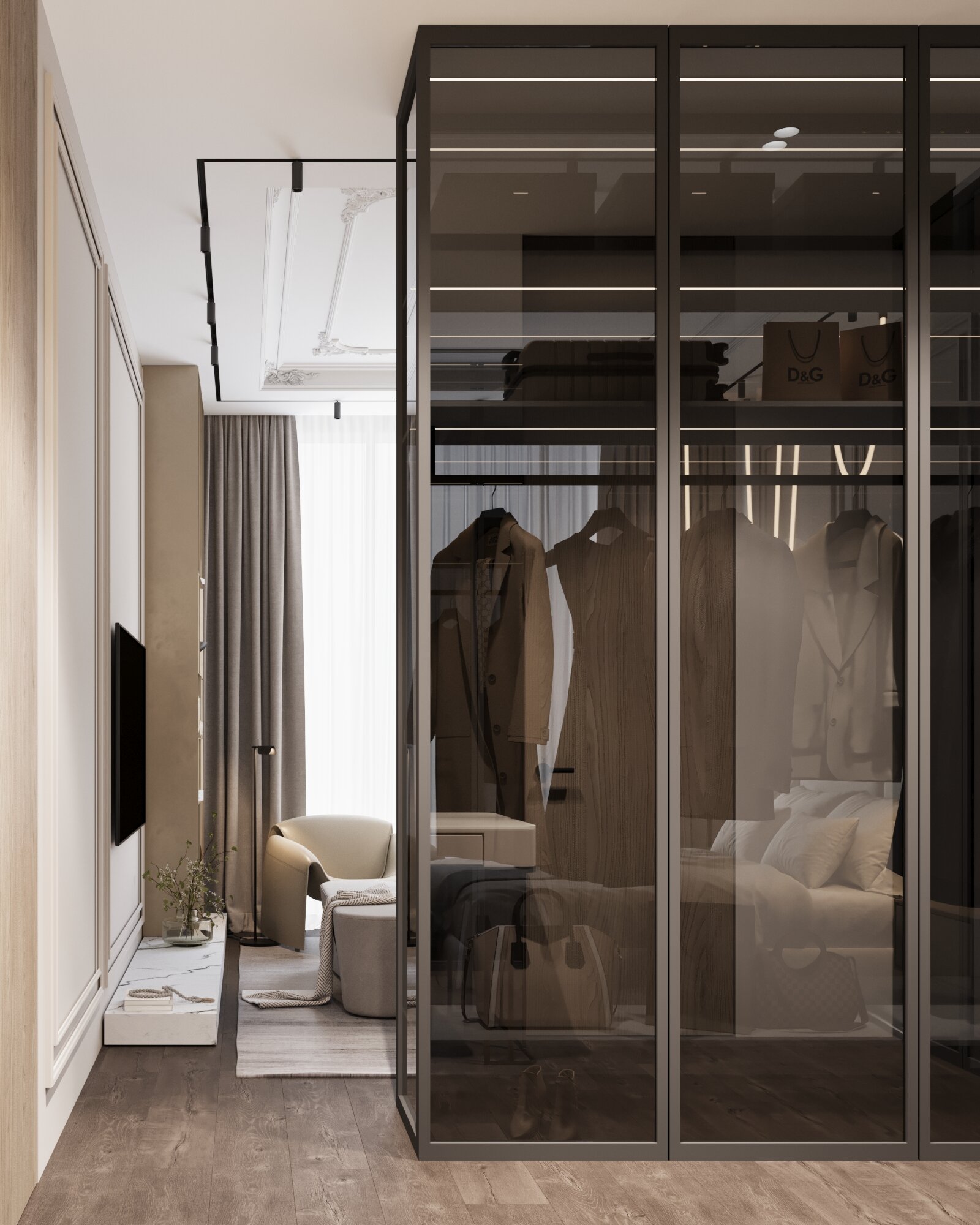 Поскольку гардеробная является проходной - всё хранение запланировано закрытым фасадами, что предотвращает запыление одежды. А для создания лёгкости мы применили стеклянный вариант гардеробных шкафов. Стекло выбрано в тонированном исполнении, чтобы скрыть наполнение, которое при выключенной подсветке будет практически не видно.