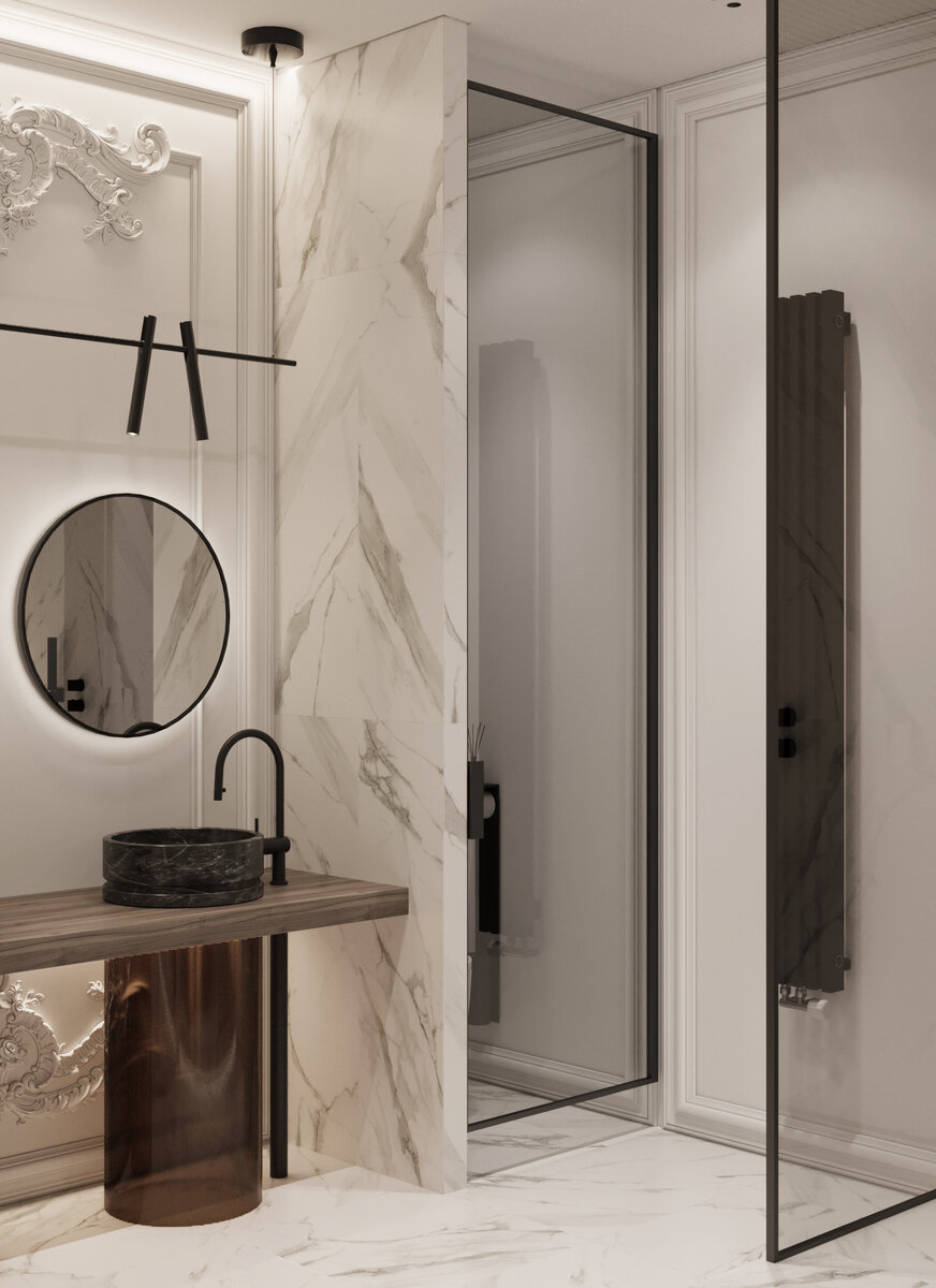 Стена украшена акцентной лепниной, поддерживая общий стиль мастер блока.