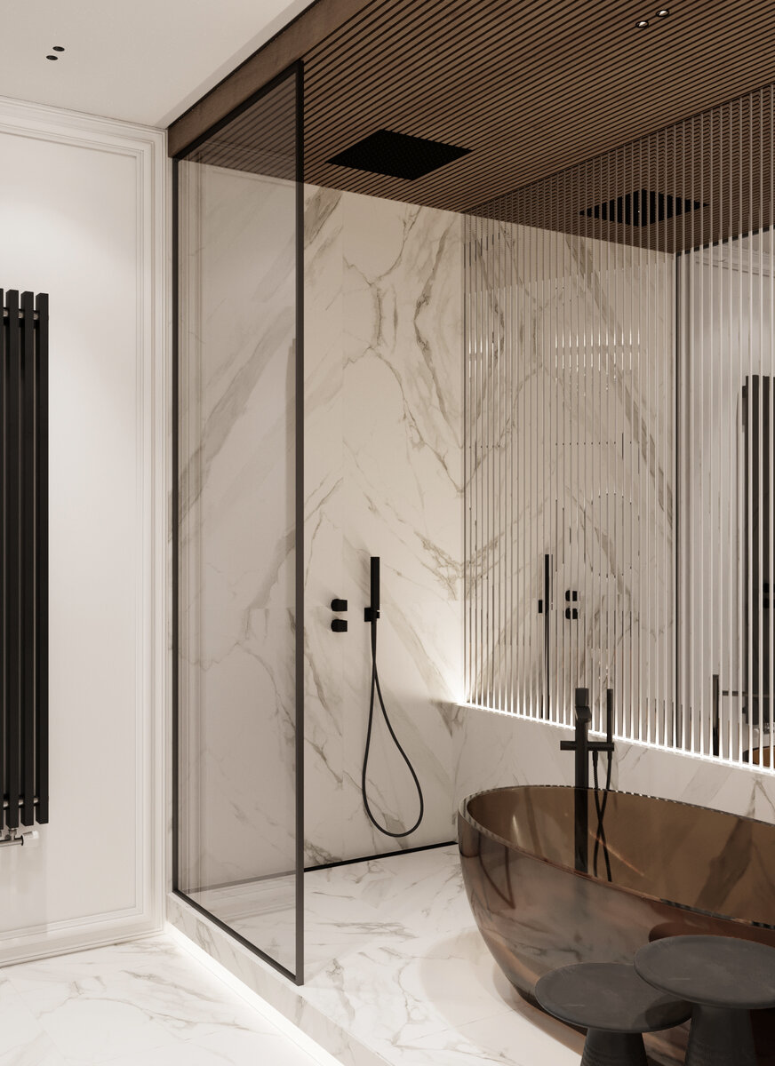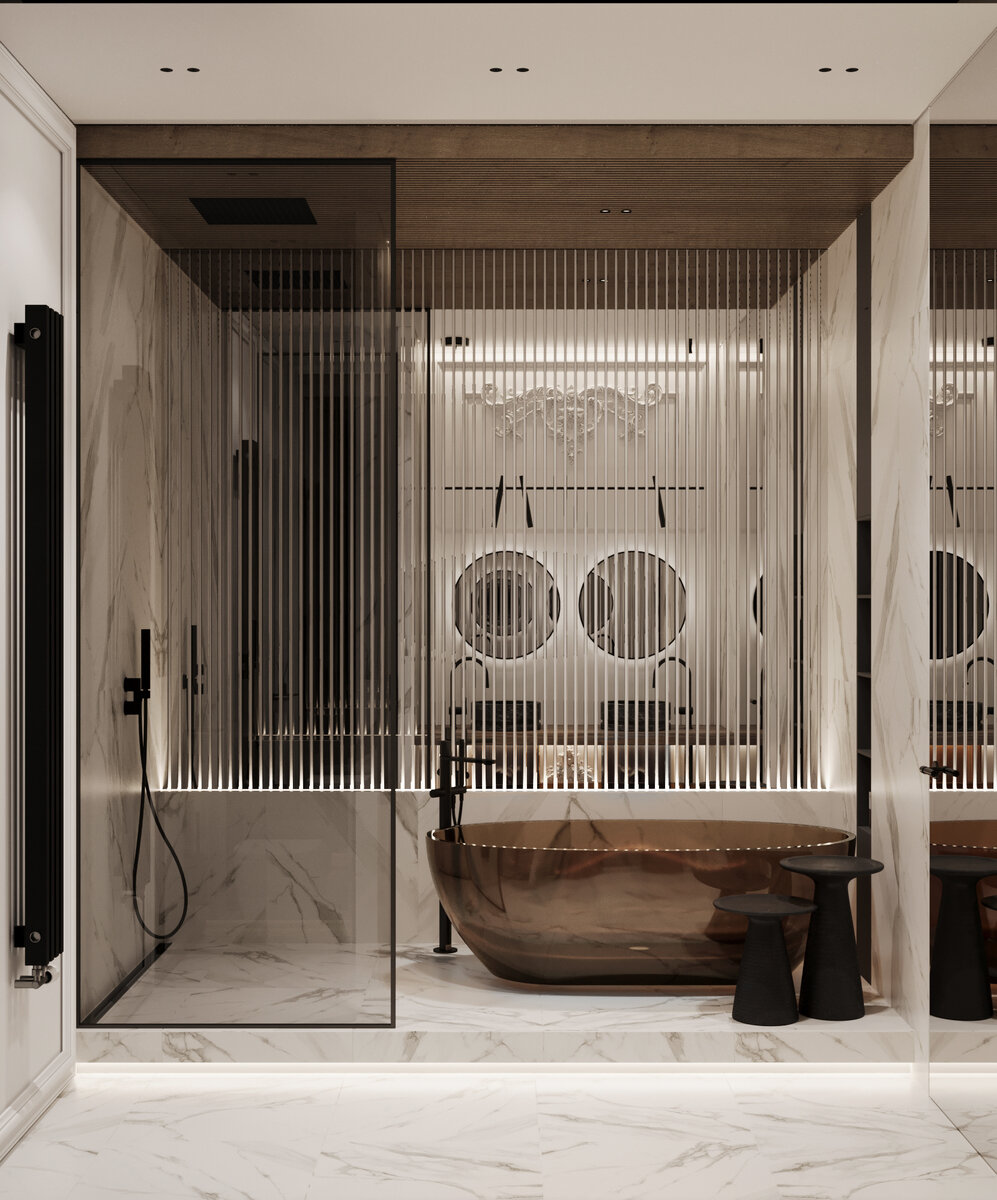 Из спальни, проходя через гардеробную, мы попадаем в личный Мастер Санузел, рассмотрим его поподробнее.